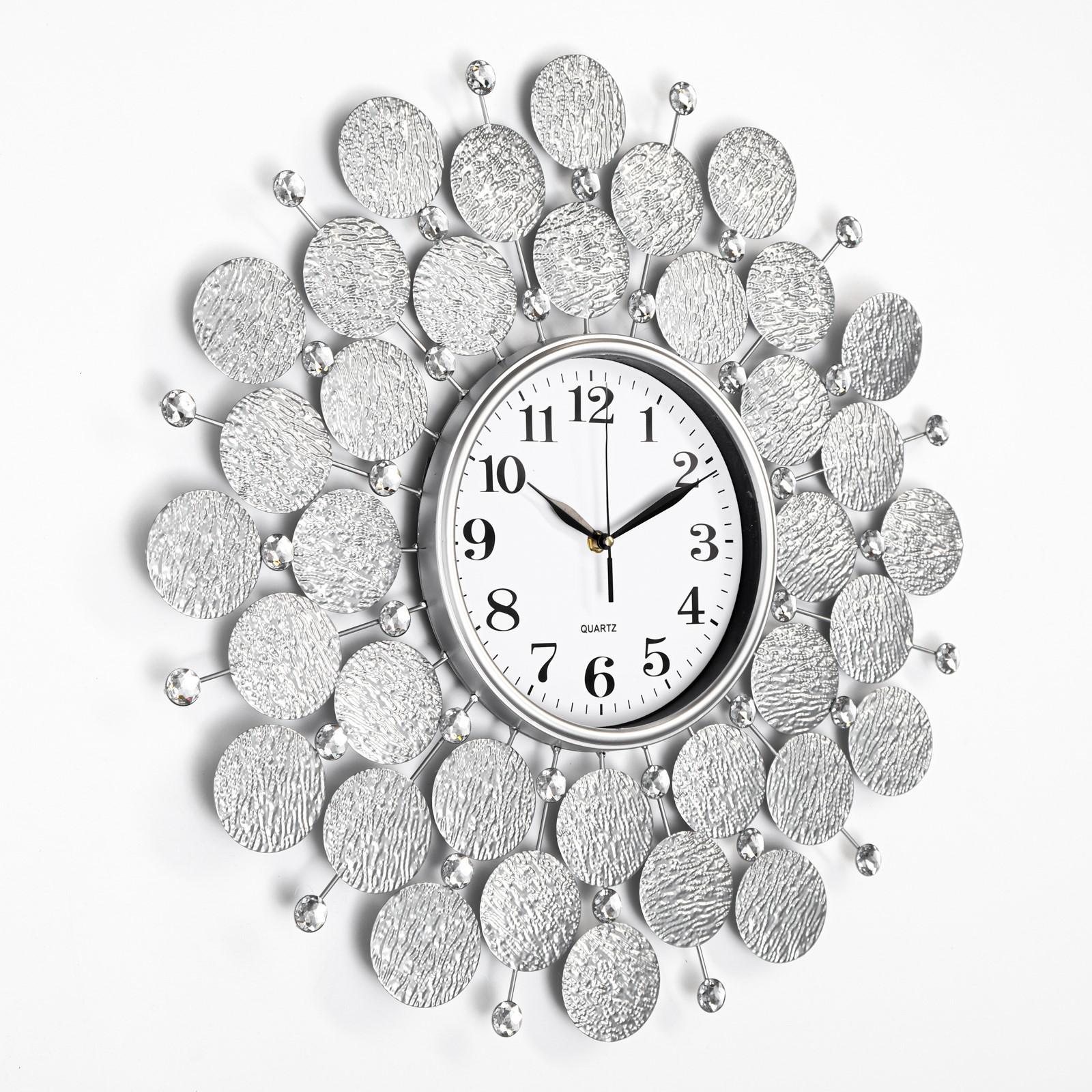Часы настенные, серия: ажур, пабраде, плавный ход, d-60 см, циферблат 22 см. Часы настенные интерьерные большие Пабраде – это стильный и элегантный аксессуар, который идеально подойдет для любого интерьера. Благодаря кварцевому механизму с плавным ходом, часы работают абсолютно бесшумно, создавая атмосферу спокойствия и комфорта в вашем доме. Большой размер часов позволяет им гармонично вписываться в просторные помещения. Современный и минималистичный дизайн часов делает их универсальным дополнением к различным стилям интерьера. Большие настенные часы станут великолепным дополнением любого интерьера. Они способны добавить изысканности и уникальности любой комнате, будь то гостиная, спальня, кухня, кабинет или даже прихожая. Такие часы могут послужить отличным подарком для близких людей или любимых на различные праздники, подчеркивая заботу и внимание дарителя. Плавный ход механизмаРаботают от батарейки типа АА (1 шт, в комплект не входит)Тип питания:От батареек|Форма:Фигурная|Ширина, см:60|Высота, см:60|Диаметр циферблата, см:22|Тематика:Интерьер|Тип индикации:Арабские цифры|Тип механизма:Кварцевый|Цвет циферблата:Белый|Материал:Пластик|Материал:Металл|Работает от сети:Нет|Типоразмер батареек:AA (LR6)|Ход стрелок:Плавный|Цвет корпуса:Серебристый|Бесшумные:Да|Страна:Китай  развернуть описание ▼