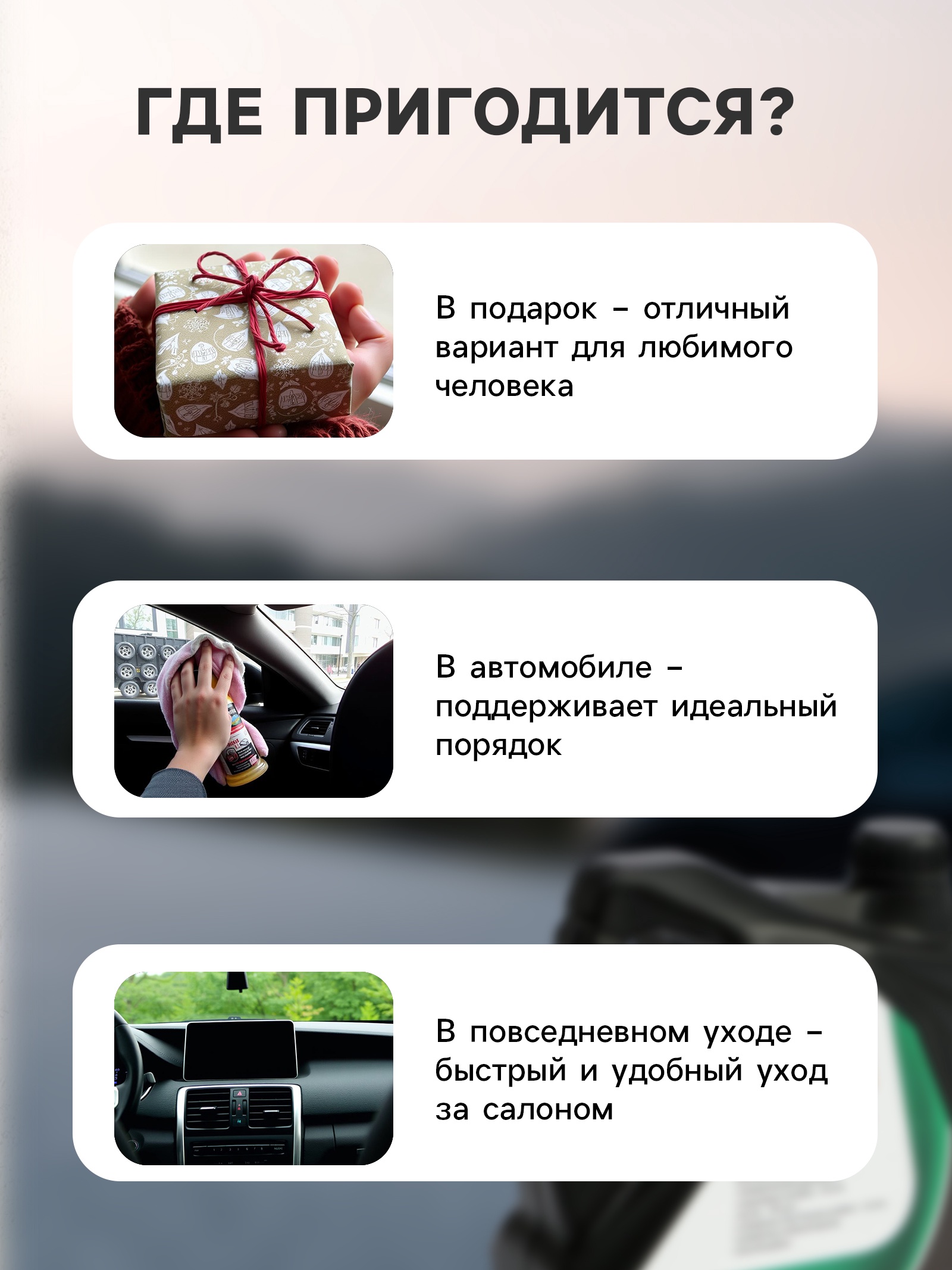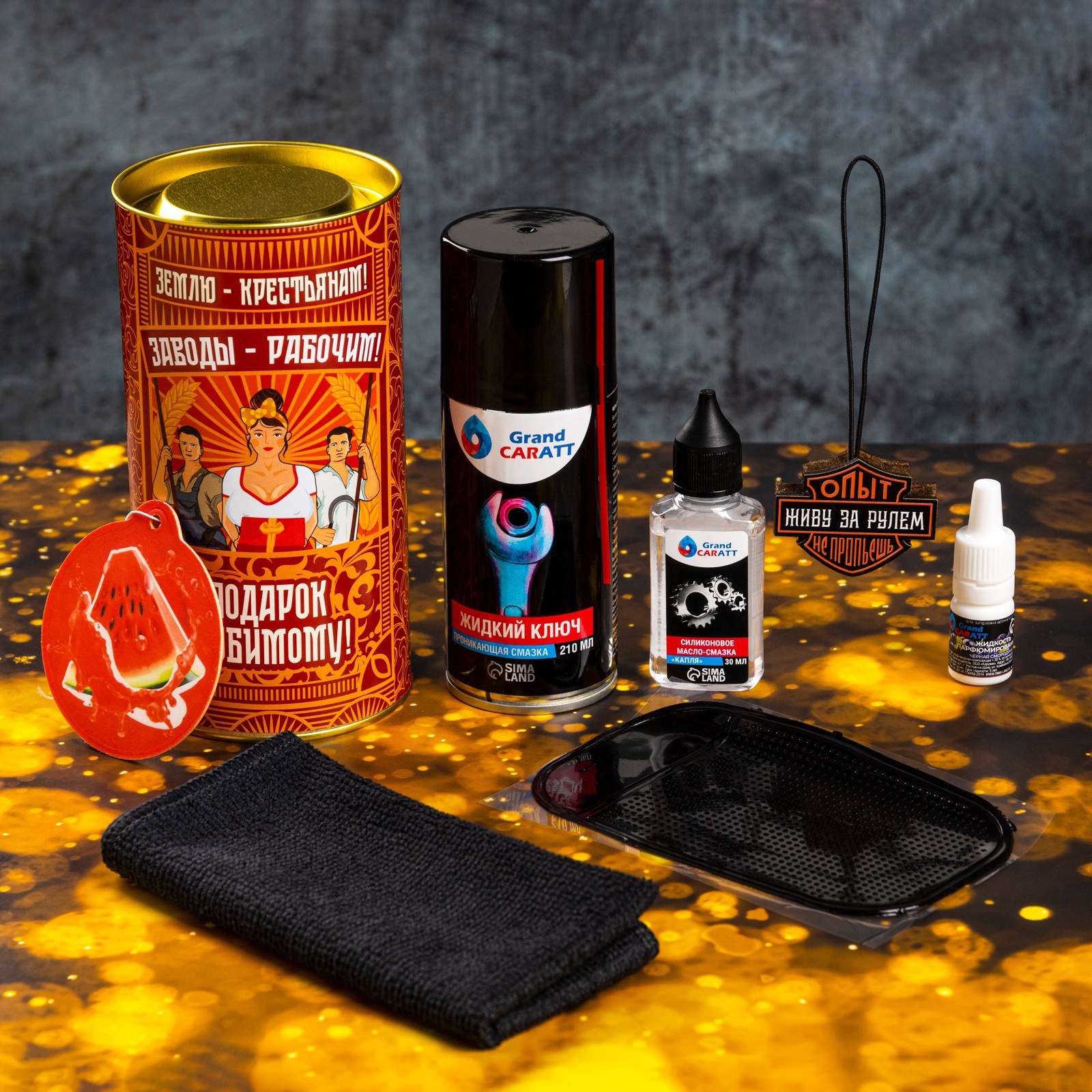Подарочный набор автотоваров grand caratt любимому. Подарочный набор автотоваров — идеальный выбор для автолюбителя! Включает в себя полезные аксессуары, которые обеспечат комфорт и удобство во время поездок. С этим комплектом уход за автомобилем станет проще, а каждое путешествие — приятнее. Состав набора: Жидкий ключ Grand Caratt: быстро разъединяет заржавевшие детали, вытесняет влагу и защищает соединения от коррозии.Силиконовое масло Grand Caratt: бесцветное и безопасное, обладает антиадгезионными и электроизоляционными свойствами, защищает детали от трения и износа.Ароматизатор подвесной Grand Caratt «Арбуз»: насыщает салон приятным фруктовым ароматом, помогая создать уютную атмосферу в автомобиле.Парфюмированная жидкость Grand Caratt «Чёрная смородина»: предназначена для пропитки ароматизаторов, усиливает и продлевает их действие.Салфетка микрофибра Grand Caratt: подходит для очистки стёкол, зеркал, салона и кузова автомобиля, эффективно удаляет загрязнения и пыль.Автомобильная подвеска Grand Caratt: стильный аксессуар, изготовленный вручную из натурального дерева, устойчив к износу и растрескиванию.Противоскользящий коврик TORSO: надёжно удерживает предметы на приборной панели, защищая её от царапин и повреждений.Этот комплект станет отличным подарком для водителей, которые ценят комфорт, чистоту и порядок в своём автомобиле. Универсальный и функциональный, он пригодится каждому автолюбителю! Для кого:Унисекс|В наборе, шт.:3|Количество предметов в наборе:3|Вид упаковки:PVC-пакет|Тематика праздника:Универсальная тематика|Адресат:Автомобилисту|Составляющие набора:Жидкий ключ|Составляющие набора:Парфюмерная вода|Составляющие набора:Подвеска|Составляющие набора:Коврик|Составляющие набора:Силиконовая смазка|Составляющие набора:Ароматизатор|Составляющие набора:Салфетка|Темпер. ограничение НЕ НИЖЕ :-20|Темпер. ограничение НЕ ВЫШЕ :+50|Возраст:Для взрослых|Страна:Россия  развернуть описание ▼