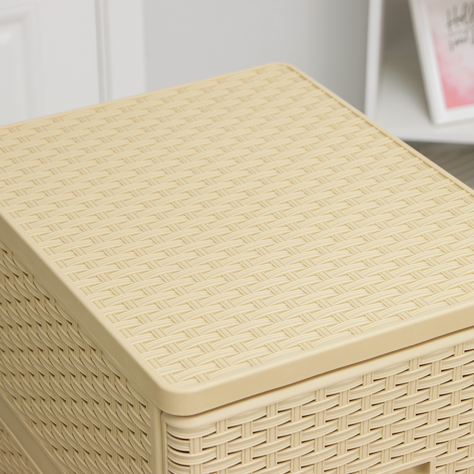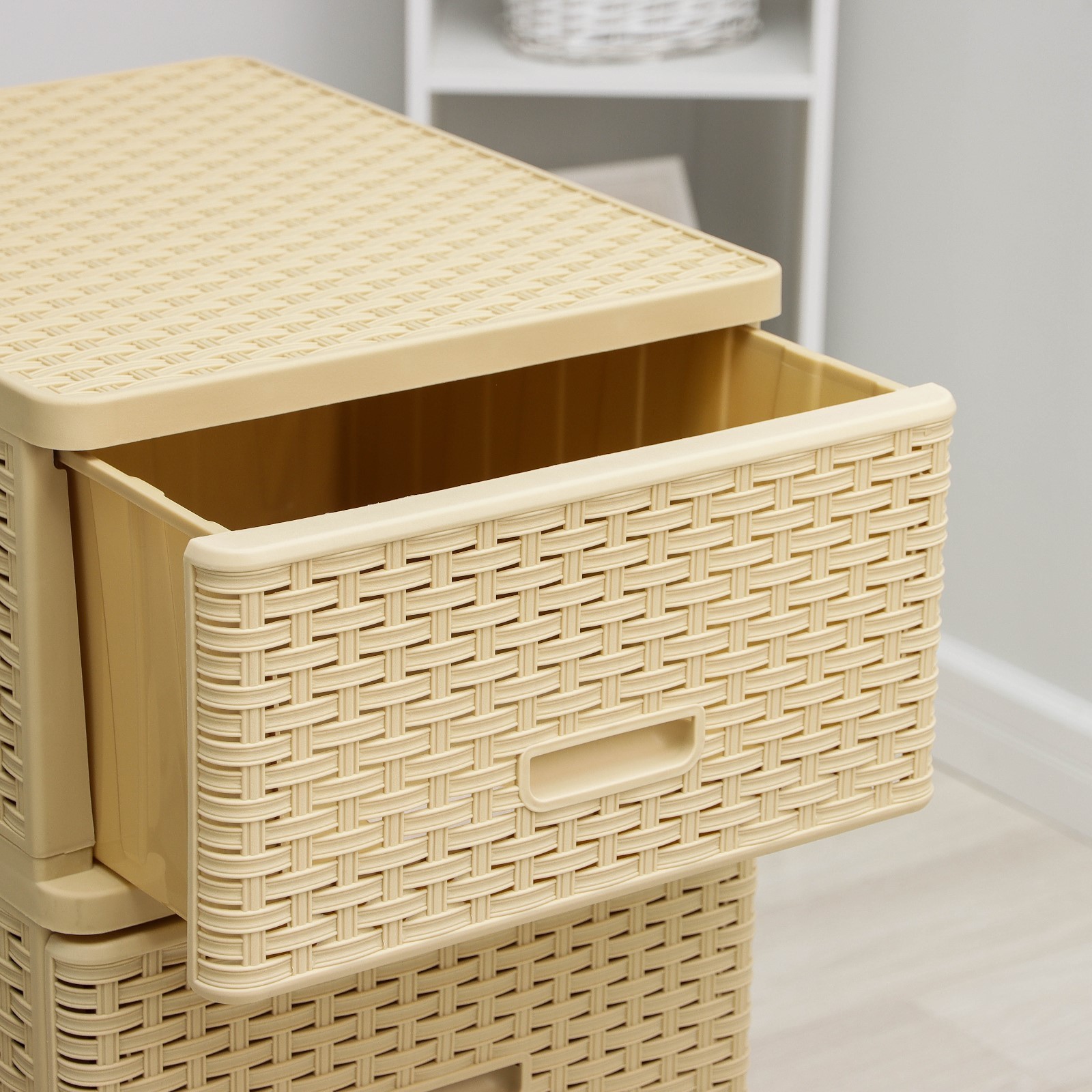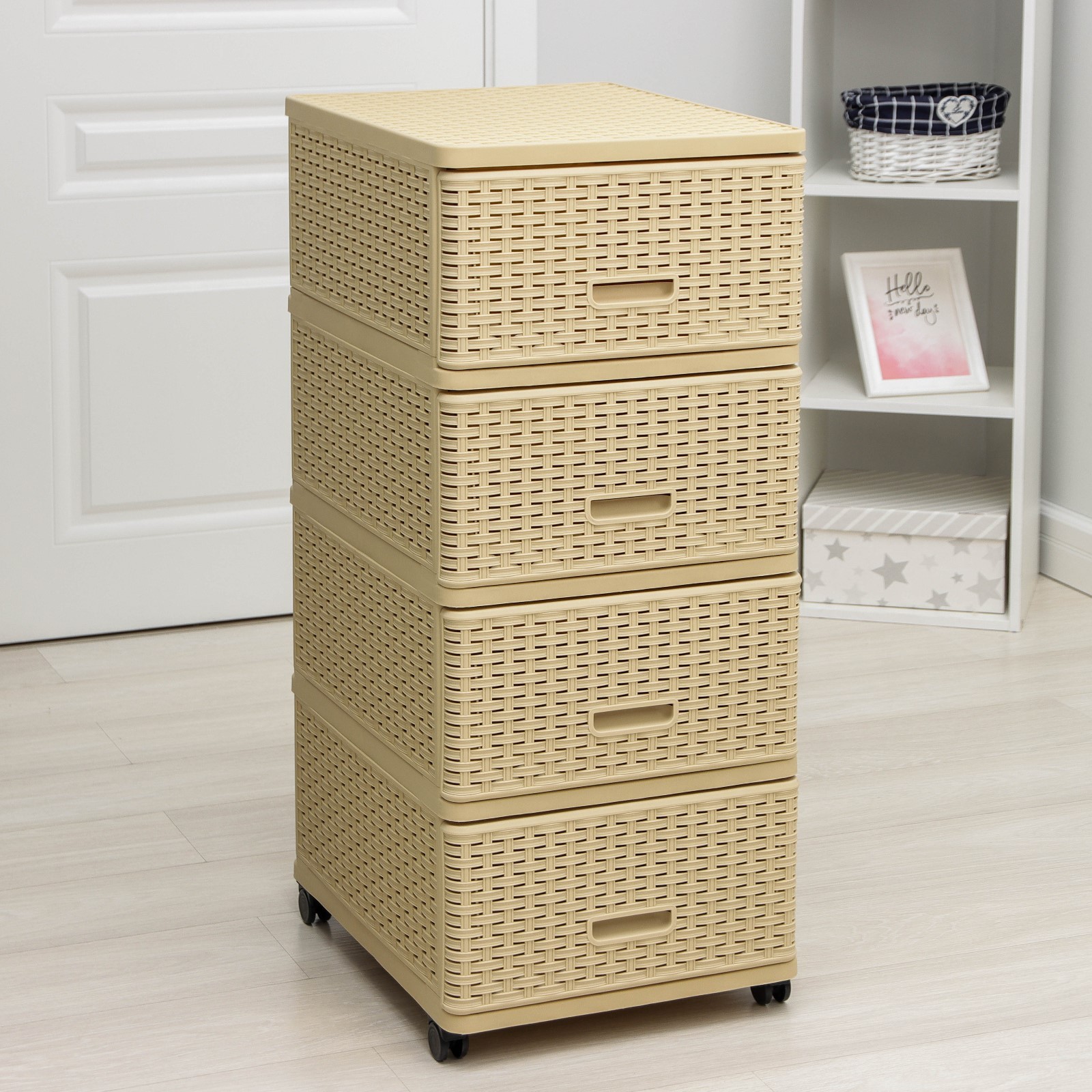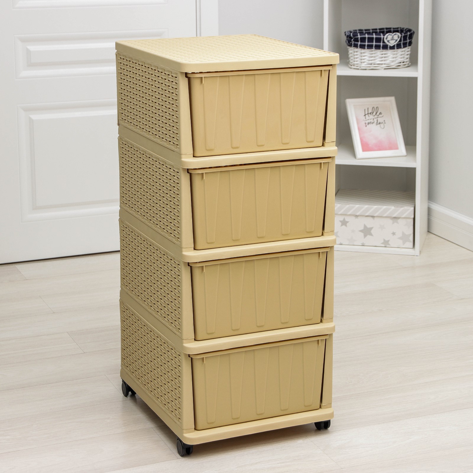 Комод 4-х секционный «плетёный», цвет бежевый. С помощью практичного пластикового комода вы правильно организуете хранение вещей. Изделие имеет жёсткую конструкцию за счёт цельных боковых стенок. Отсутствие острых углов делает его безопасным для ребёнка. Комод изготовлен из экологически чистого материала, не содержит вредных веществ. Преимущества: высокопрочный пластик;простая и быстрая сборка;ящики легко достать и вставить обратно;простота в уходе;подходит для детской комнаты, ванной, коридора;стильный дизайн. Цвет: Бежевый Ширина, мм: 400 Глубина, мм: 500 Высота, мм: 985 parts count: 0 Количество секций: 4 Материал: Пластик Температурное ограничение: Нет Поставляется в разобранном виде: Нет  развернуть описание ▼