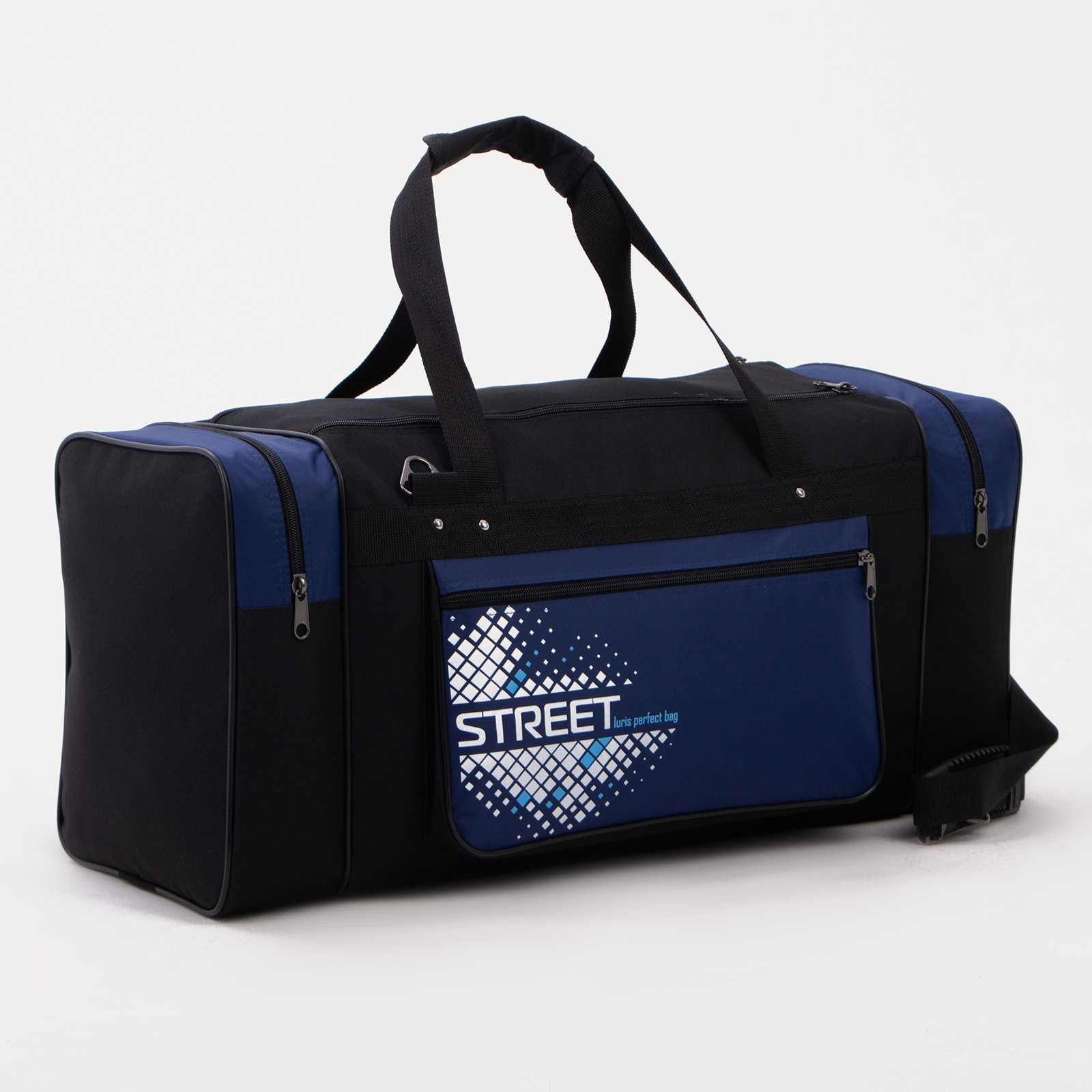 Сумка дорожная, 3 отдела на молниях, наружный карман, длинный ремень, цвет чёрный/синий
