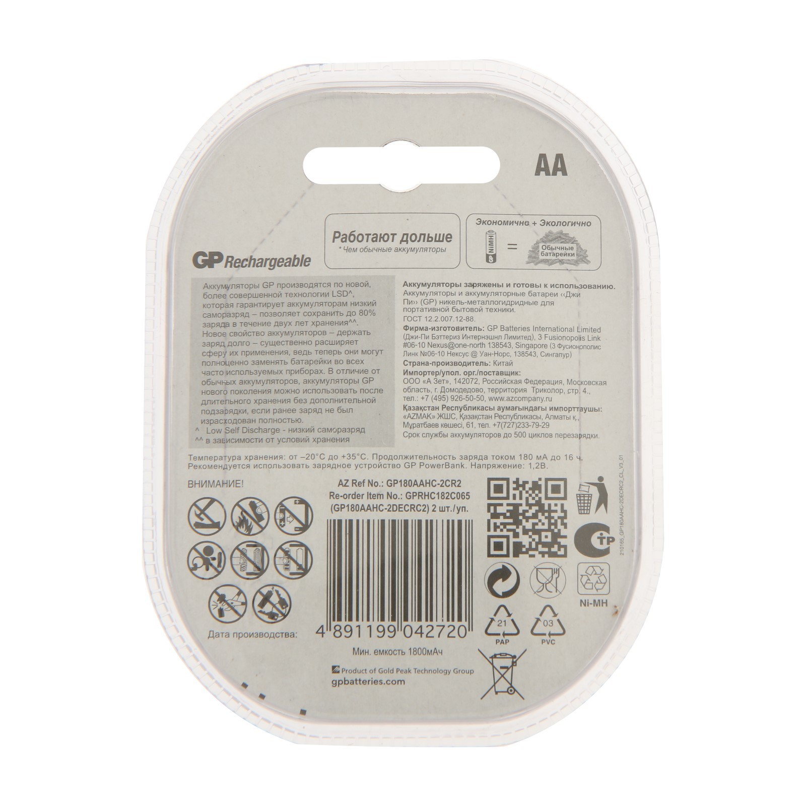 Аккумулятор Gp, Ni-mh, Aa, Hr6-2bl, 1.2в, 1800 мач, блистер, 2 шт.