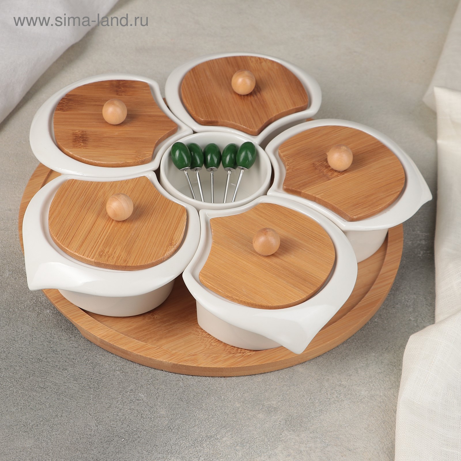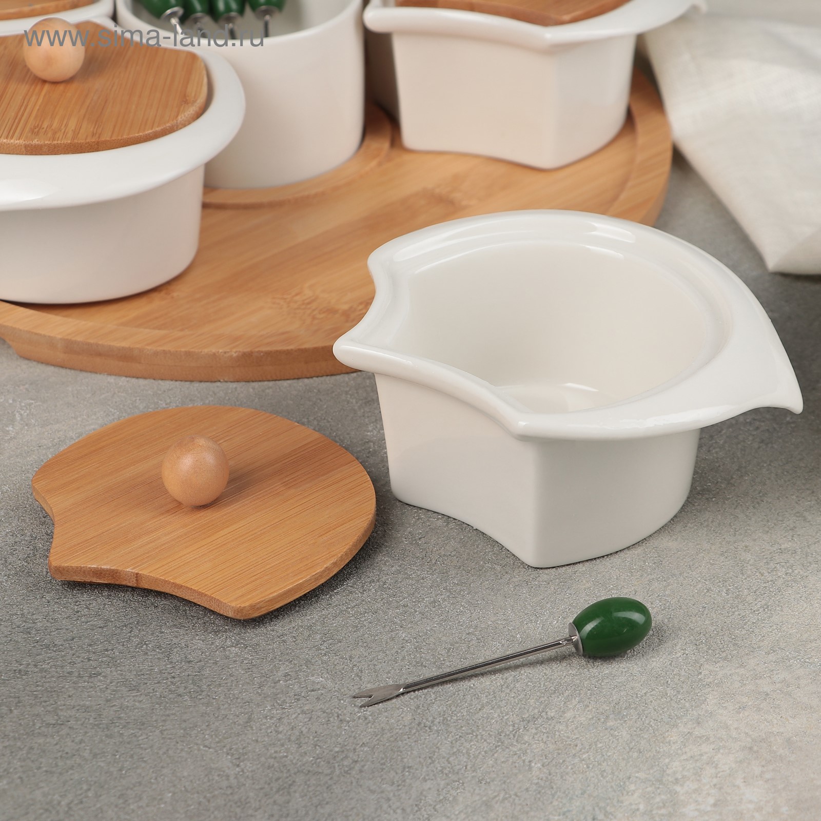 Набор мисок керамических для снэков на деревянной подставке «эстет», 5 мисок D=10 см, соусник D=8 см, 5 шпажек, цвет белый Набор мисок керамических для снэков на деревянной подставке «эстет», 5 мисок D=10 см, соусник D=8 см, 5 шпажек, цвет белый