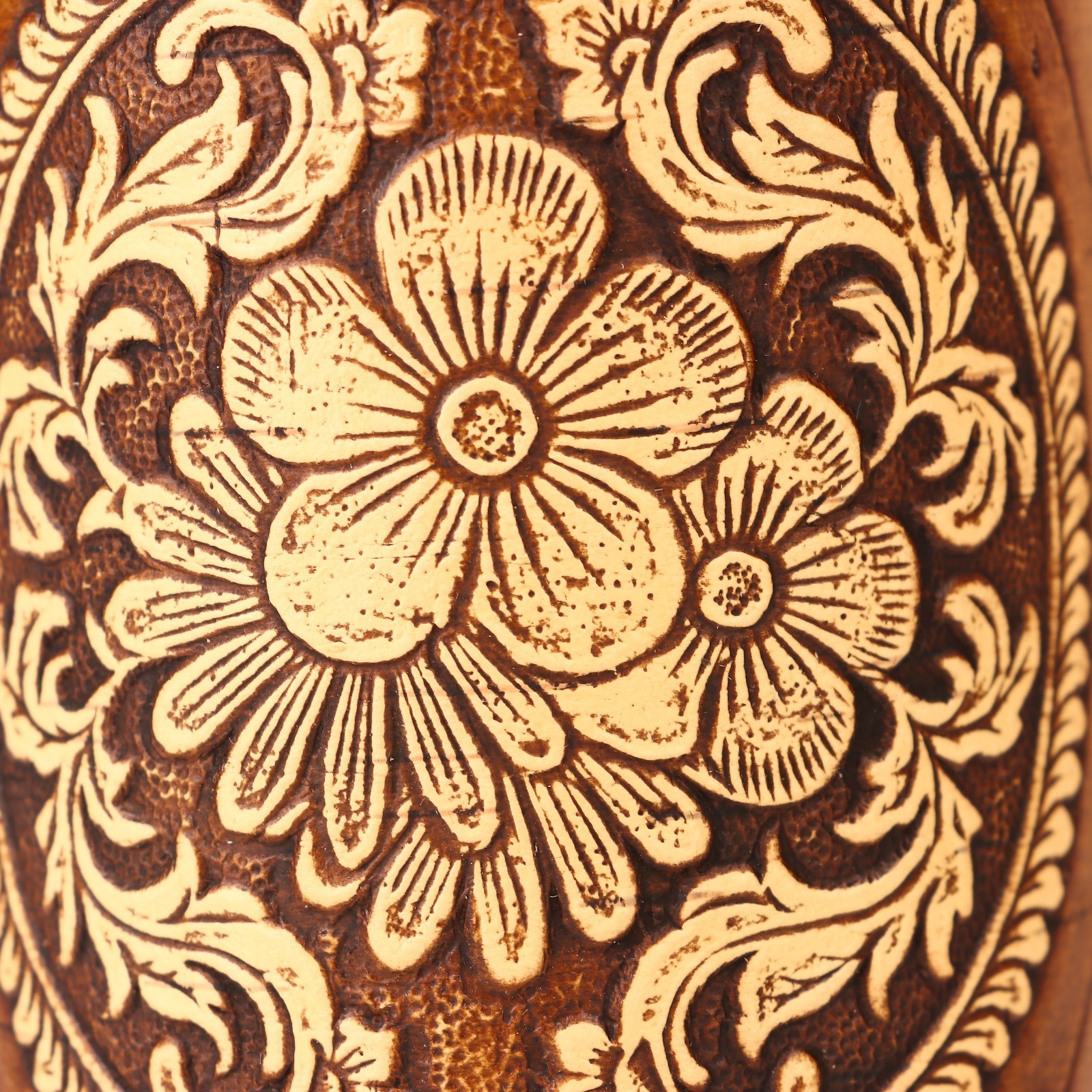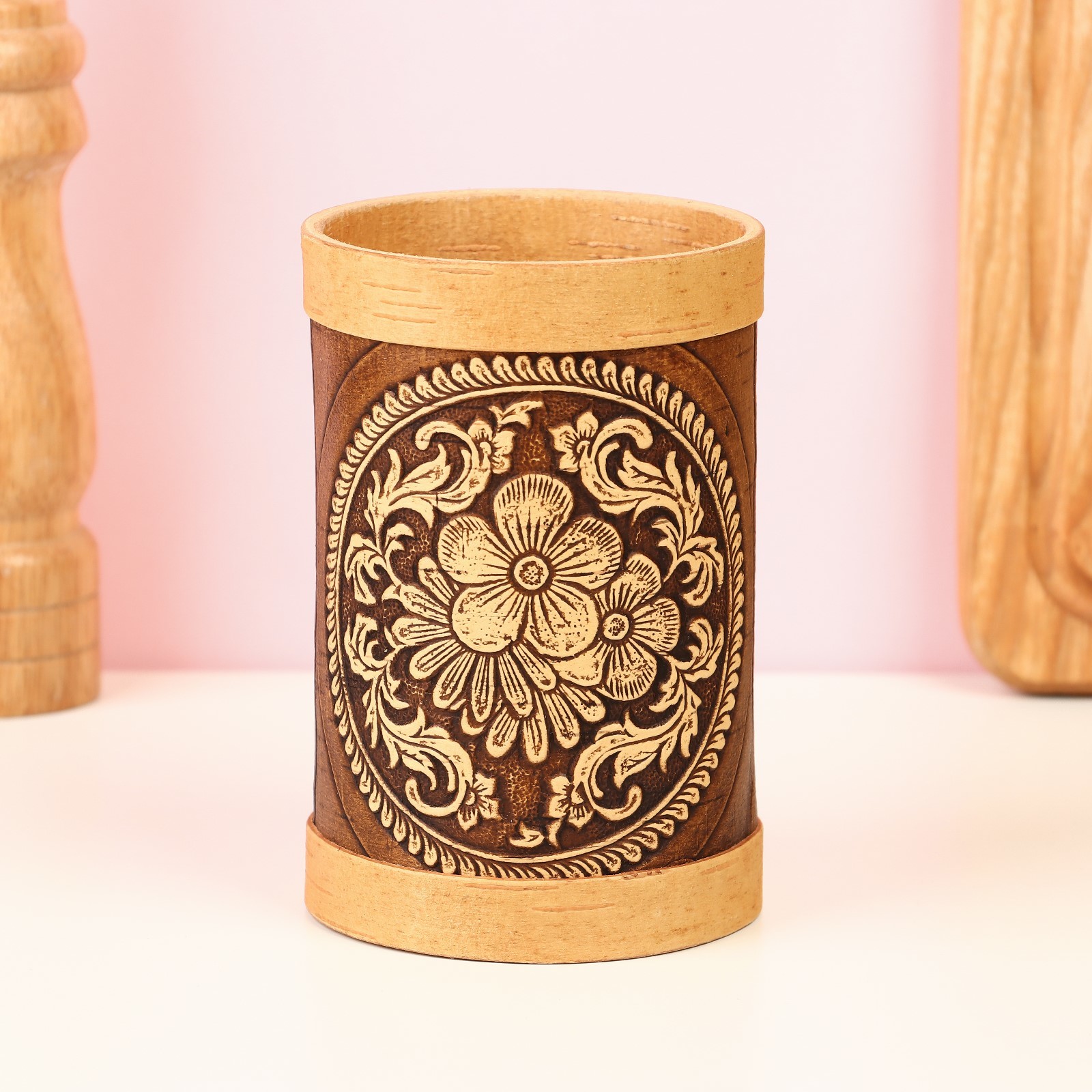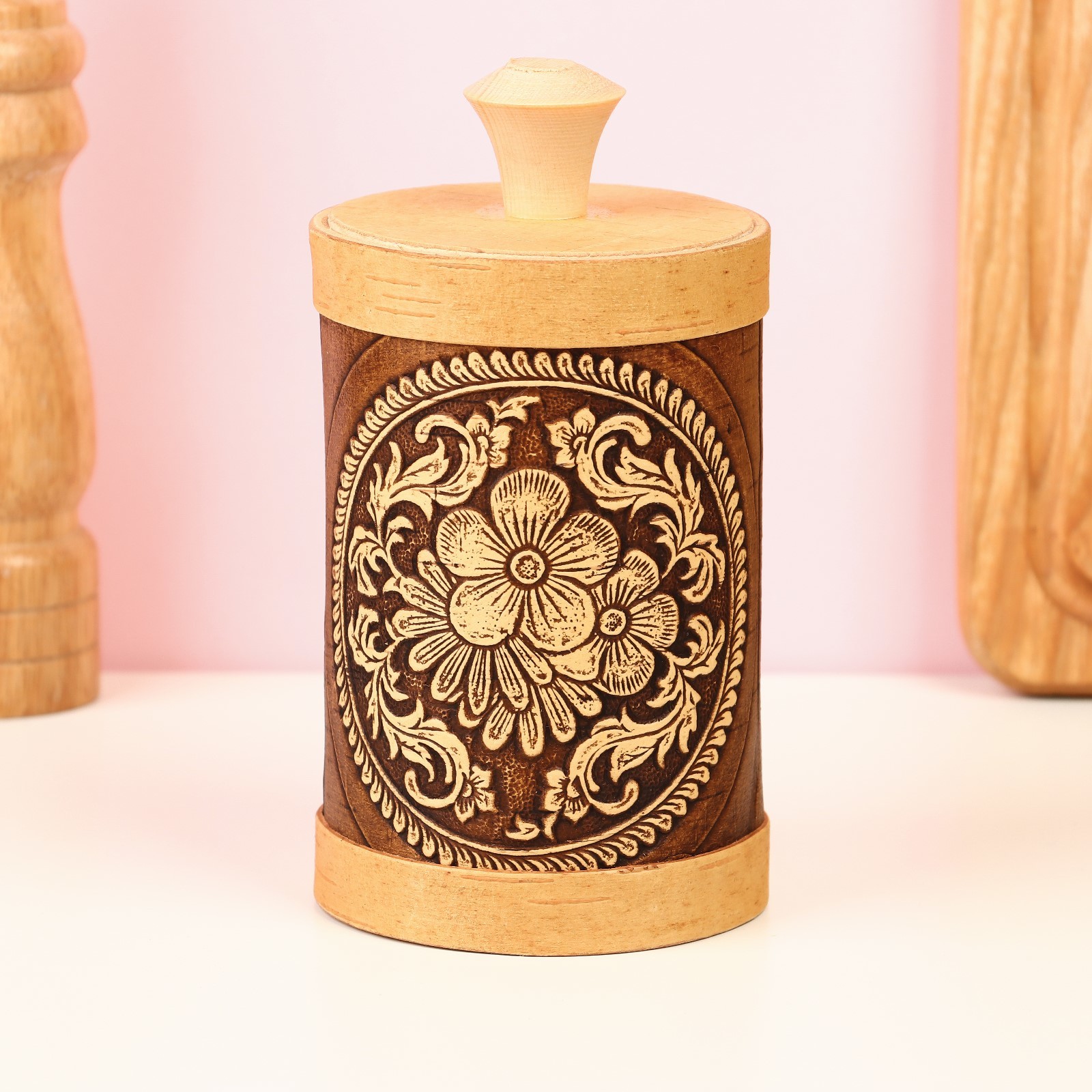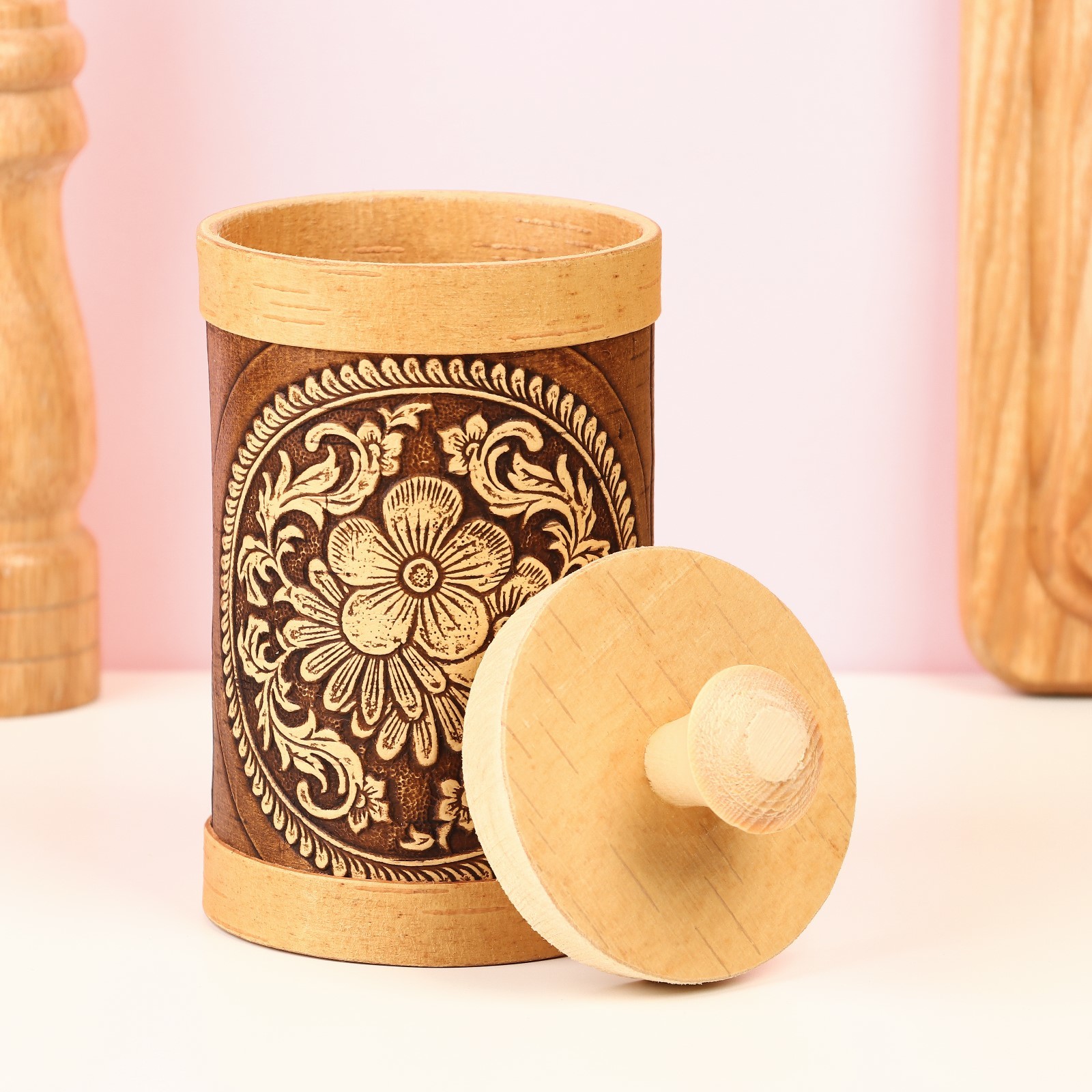 Туес "цветочки", круглый, береста. Туес из бересты – практичный и лаконичный выбор для вашей кухни! Изделие выполнено из экологически чистого сырья, которое идеально подходит для хранения продуктов. Береста является природным антисептиком и прекрасно впитывает влагу. Продукты в такой посуде дольше сохраняют свою свежесть и вкусовые качества, в ней не заводятся насекомые и не размножаются бактерии. Изготовлено из натуральной коры берёзы вручную российскими мастерами. Цвет: Коричневый Форма: Цилиндрическая Тематика: Цветочно-растительная Крышка: Да Материал крышки: Дерево Вид дерева: Берёза Материал: Береста Из натурального дерева: Да Покрытие: Воск Герметичная крышка: Нет Тип нанесения рисунка: Тиснение Ручная работа: Да Объём: 300 мл - 500 мл Температурное ограничение: Нет Можно мыть в посудомоечной машине: Нет Текстура: С рельефом Назначение: Универсальная Особенности: Без особенностей Форма: Круг, шар, цилиндр  развернуть описание ▼