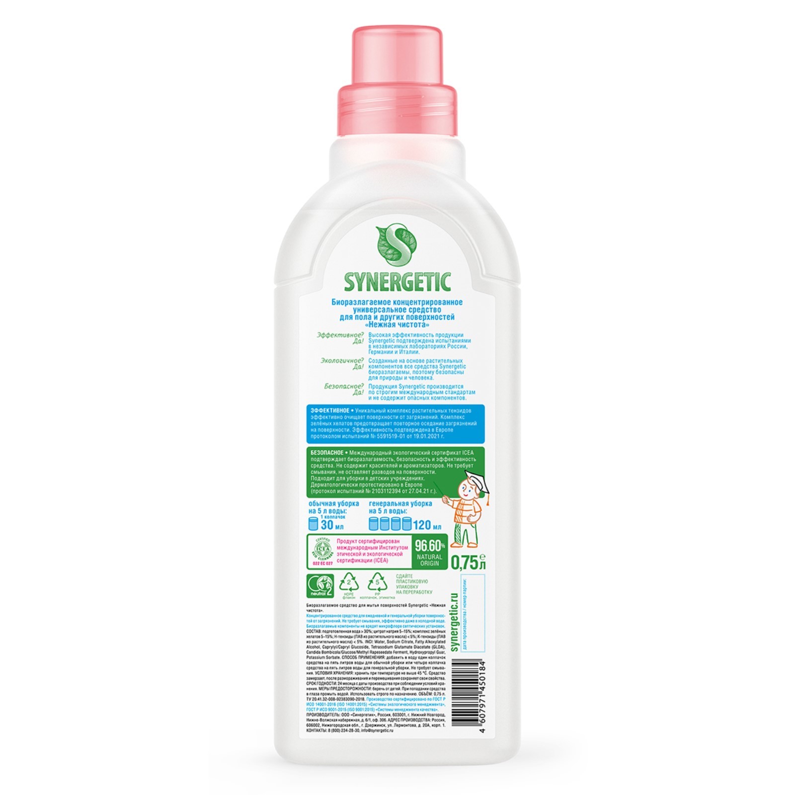 Средство для мытья полов synergetic "нежная чистота", биоразлагаемое,концентрированное 750 мл. Биоразлагаемое концентрированное средство SYNERGETIC "Нежная чистота" - универсальное средство для ежедневной и генеральной уборки пола и других поверхностей: столов, стен, потолка. Уникальный комплекс растительных тензидов эффективно удаляет загрязнения и неприятные запахи даже в холодной воде. Комплекс зеленых хелатов предотвращает повторное оседание загрязнений на поверхности. Подходит для паркета, ламината, плитки, линолеума, металла, стекла, пластика, дерева. Средство не содержит красителей и ароматизаторов. Международный экологический сертификат ICEA подтверждает биоразлагаемость, безопасность и эффективность средства. Оно не требует смывания, не оставляет разводов на поверхности, подходит для уборки в детских комнатах и учреждениях, а также безопасно для домов с питомцами. Добавить в воду один колпачок средства на пять литров воды для обычной уборки или четыре колпачка средства на пять литров воды для генеральной уборки. Не требует смывания. Хранить отдельно от пищевых продуктов в недоступном для детей и домашних животных сухом месте. Избегать попадания в глаза, рот и на повреждённые участки кожи. В случае попадания обильно промыть проточной водой и обратиться за медицинской помощью. При проглатывании немедленно обратиться за медицинской помощью и предъявить упаковку продукта. При повышенной чувствительности и повреждениях кожи избегать длительного контакта со стиральным порошком. Не употреблять внутрь. Использовать строго по назначению. Состав: 5-15%: перкарбонат натрия, комплекс А-тензидов; <5%: мыло, цеолиты, комплекс Н-тензидов, поликарбоксилатный диспергатор, энзимы (без ГМО), оптические отбеливатели, этидроновая кислота, ингибитор переноса красителя, парфюмерная композиция. Объём, л: 0.75 Ароматизированные: Да Температурное ограничение: Нет Особенности: Универсальное Содержание хлора: Нет  развернуть описание ▼