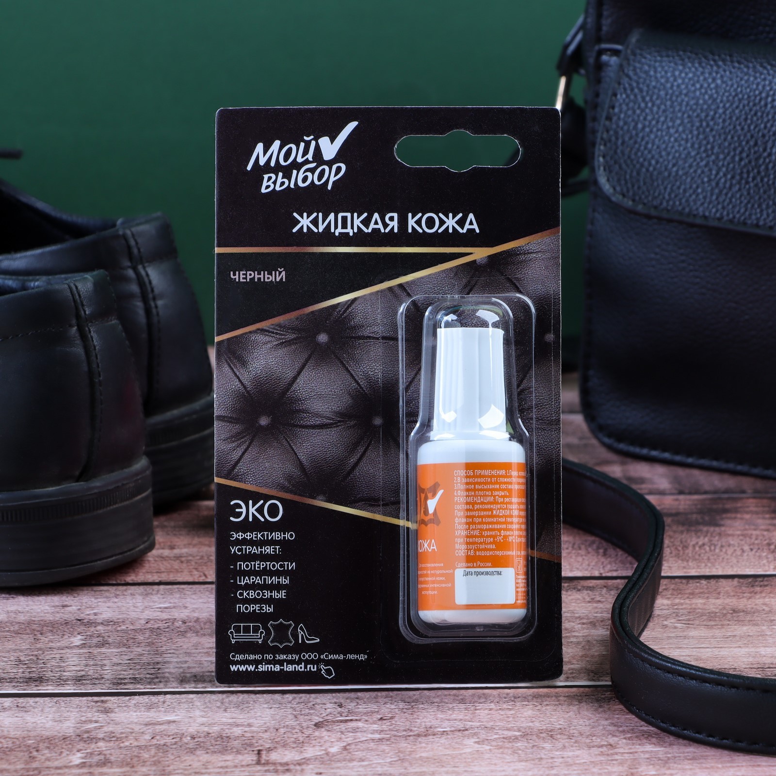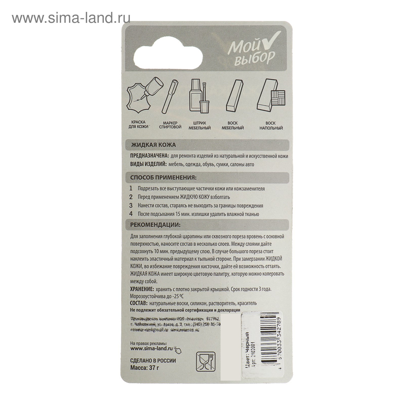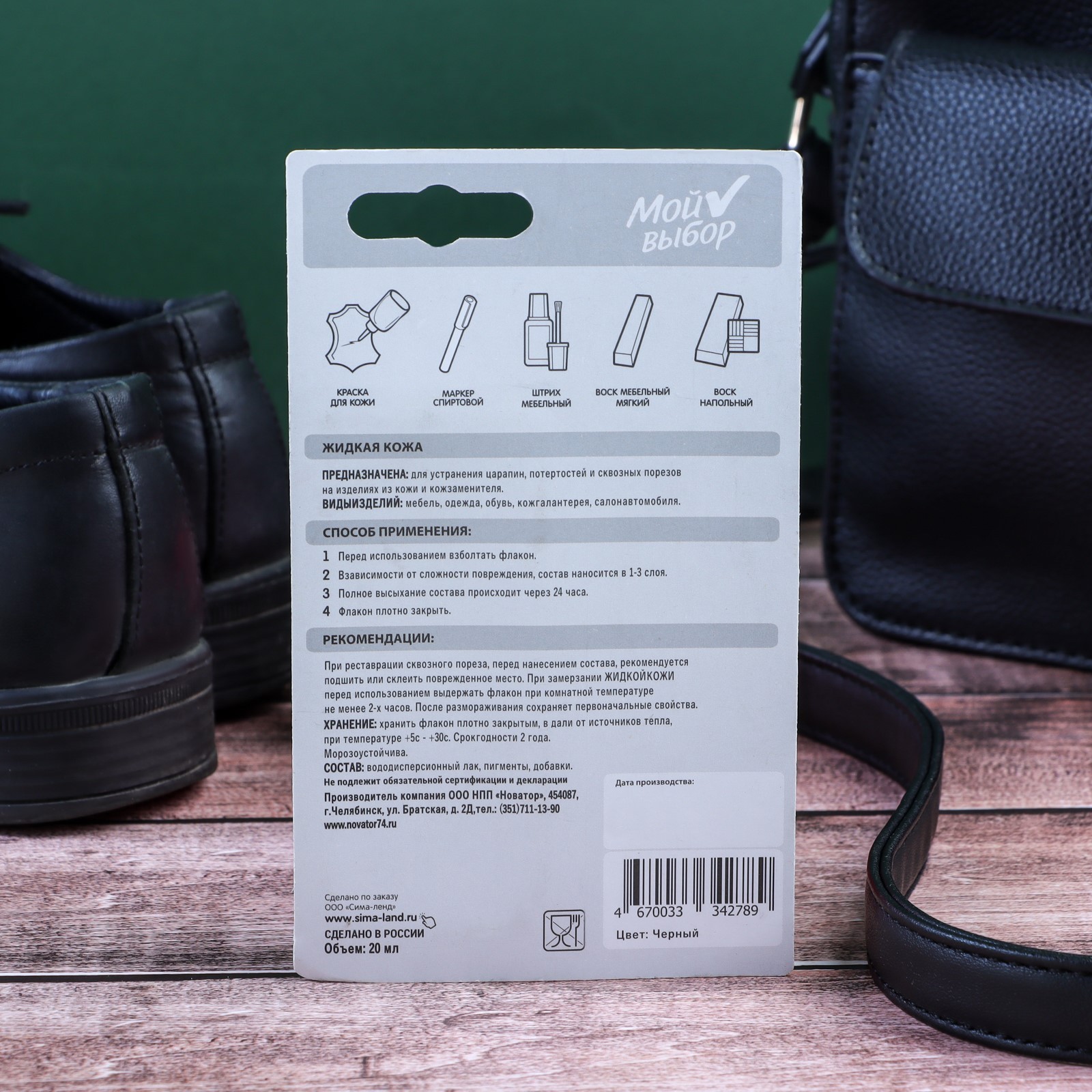 Жидкая кожа "мой выбор", черная, 20 мл. Жидкая кожа черного цвета - эффективное средство, когда мебель, обувь, предметы интерьера имеет повреждения. Отлично справляется с царапинами, трещинами и другими мелкими деффектами. С помощью такого инструмента можно быстро и без больших затрат починить испортившуюся мебель или одежду. Предназначено для внутренних и наружных работ. Для ремонта изделий из кожи и кожзаменителя. Способ применения: подрезать все выступающие частички кожи кожи и кожзаменителя. Перед применением жидкую кожу взболтать. Нанести состав, стараясь не выходить за границы повреждения. После подсыхания 10-15 минут излишки удалить влажной тканью. Рекомендации: чтобы заполнить глубокую царапину или сквозной порез вровень со сквозной поверхностью, наносите состав в несколько слоев, предварительно дав подсохнуть предыдущему слою. В случае большого пореза, стоит наклеить материал к тыльной стороне кожи. Для защиты восстановленного повреждения от загрязнения, а также для выравнивания степени блеска рекомендуем использовать фиксирующий лак Мастер Сити. При замерзании жидкой кожи, во избежание повреждения кисточки, дайте ей возможность оттаять. Жидкую кожу можно колеровать между собой. Хранить с плотно закрытой крышкой. Срок годности 5 лет с даты изготовления см. на упаковке. Морозоустойчива до – 25 °C. Состав: натуральные воски, силикон, растворитель, краситель. Цвет: Чёрный Вес, г/Объём, мл: 20 Форма выпуска: Жидкость Вид: Жидкая кожа Температурное ограничение: Нет Вид: Жидкая кожа С губкой: Нет Назначение: Искусственная кожа Назначение: Натуральная кожа Эффект: Восстановление Эффект: Окрашивание Форма выпуска: Банка  развернуть описание ▼