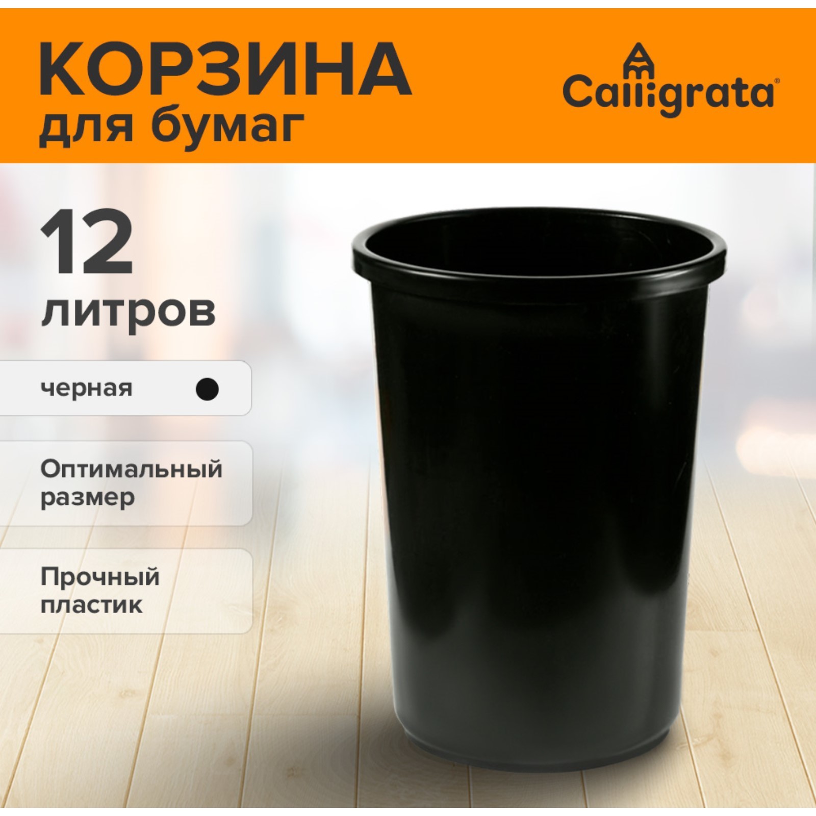 Корзина для бумаг и мусора Calligrata Uni, 12 литров, пластик, чёрная