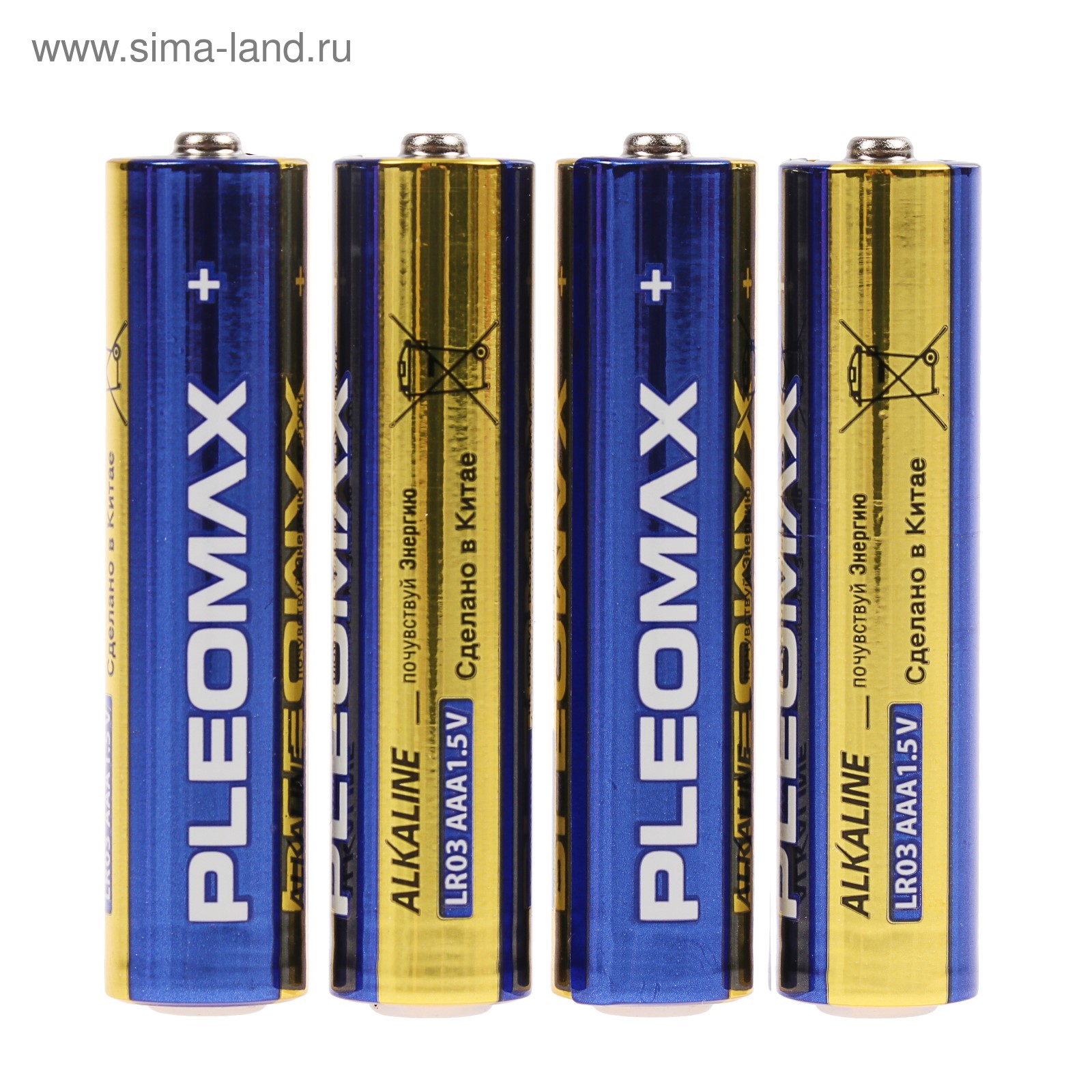 Батарейка алкалиновая pleomax, aaa, lr03-4bl, 1.5в, блистер, 4 шт.. Батарейки типоразмера ААА широко используют в беспроводных электронных устройствах: аудиоплеерах, радиоприёмниках, фотоаппаратах. Помимо широкой сферы применения, такие элементы питания отличаются малыми габаритами: их удобно хранить дома с запасом, а также брать в походы и путешествия. Используйте щелочные батарейки с любыми устройствами: от тех, которые не создают долговременных и интенсивных нагрузок, до потребляющих значительный ток. Это могут быть как пульты дистанционного управления для ТВ, калькуляторы, часы, так и фотовспышки, радиоуправляемые модели. Срок хранения этих элементов питания составляет от 3 до 5 лет. В упаковке, шт.: 4 Вид упаковки: Блистер Типоразмер батареек: AAA (LR03) Тип батарейки: Алкалиновая  развернуть описание ▼