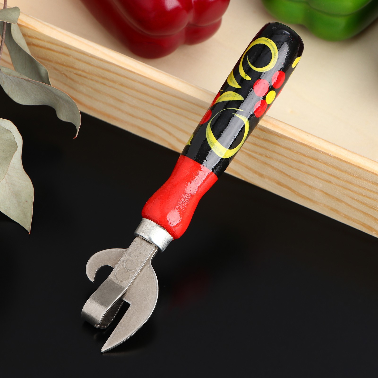 Открывалка не клепаная,16x4 см, с художественной росписью и ручкой из бука, микс. Открывашка для консервных банок позволит вам сэкономить время и силы. Нож изготовлен из прочного и высококачественного металла, а деревянная рукоять покрыта лаком, приятно лежит в ладони и не скользит во время использования. Преимущества:— Универсальная, — Надежная, — Легко моется, — Не занимает много места. Инструкция по применению:Поставьте на стол банку, которую следует открыть. Острый конец изделия поставьте на край крышки. Ударьте по ручке консервного ножа так, чтобы получилось отверстие. Зафиксируйте на бортике центральную часть открывашки, и режьте по кругу металл. Отогните крышку руками. parts count: 0 Материал ручки: Дерево Материал: Дерево Материал: Металл Температурное ограничение: Нет Можно мыть в посудомоечной машине: Нет Вид: Открывашка  развернуть описание ▼