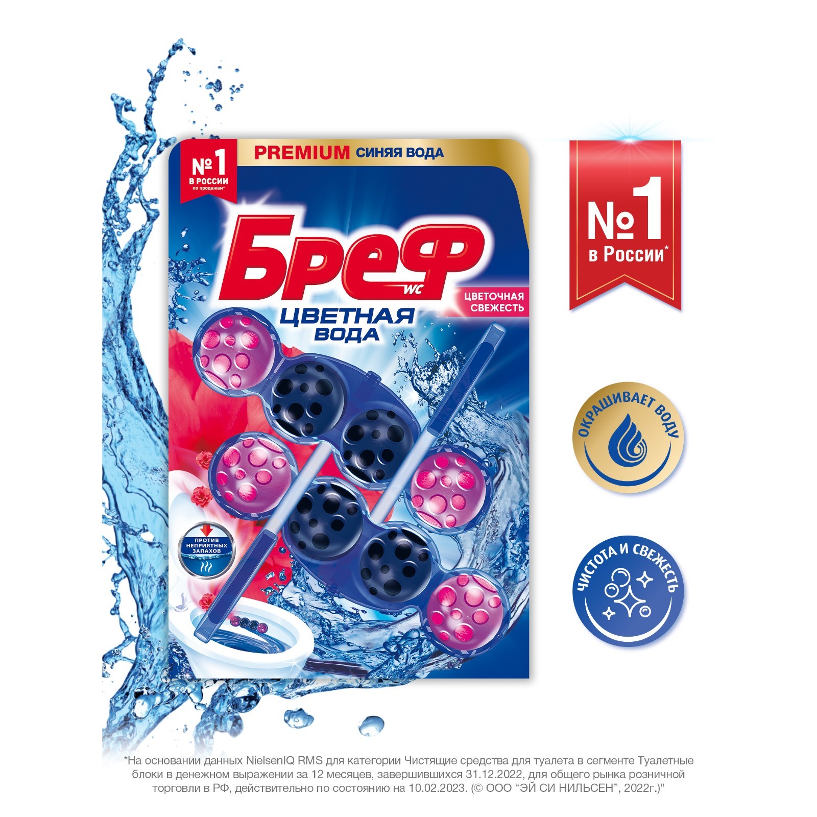 Блок для унитаза bref color activ "цветочная свежесть", 2 шт х 50 г. Бреф Цветная Вода — подвесной туалетный блок с технологией нейтрализации запахов, которая создает защитный барьер на пути неприятных запахов. Активная формула цветной воды действует в 4 направлениях: -образует очищающую пену, которая обеспечивает гигиеническую чистоту; -предотвращает образование известкового налета; -помогает предотвратить повторное загрязнение; -придает туалетной комнате свежий цветочный аромат. Бреф Цветная Вода – видимый результат при каждом смывании. Способ применения Повесьте Бреф Смена Аромата под ободок Вашего унитазаВыберите положение блока как можно ближе к струе водыЗамените блок, когда он закончитсяВызывает раздражение кожи. Вызывает выраженное раздражение глаз. После работы тщательно вымыть руки. Использовать защитные перчатки / средства защиты глаз. ПРИ ПОПАДАНИИ НА КОЖУ: Промыть большим количеством воды. ПРИ ПОПАДАНИИ В ГЛАЗА: Осторожно промыть глаза водой в течение нескольких минут. Снять контактные линзы, если вы ими пользуетесь или если это легко сделать. Продолжить промывание глаз. Хранить в недоступном для детей месте. Состав:> 30 % солей неорганических, анионных ПАВ; 5-15 % неионогенных ПАВ; < 5% красителя, комплексообразователя, растворителя, отдушки (в т. ч. альфа-изометилионона) parts count: 0 Аромат: Цветы Вид средства: Сменный блок  развернуть описание ▼