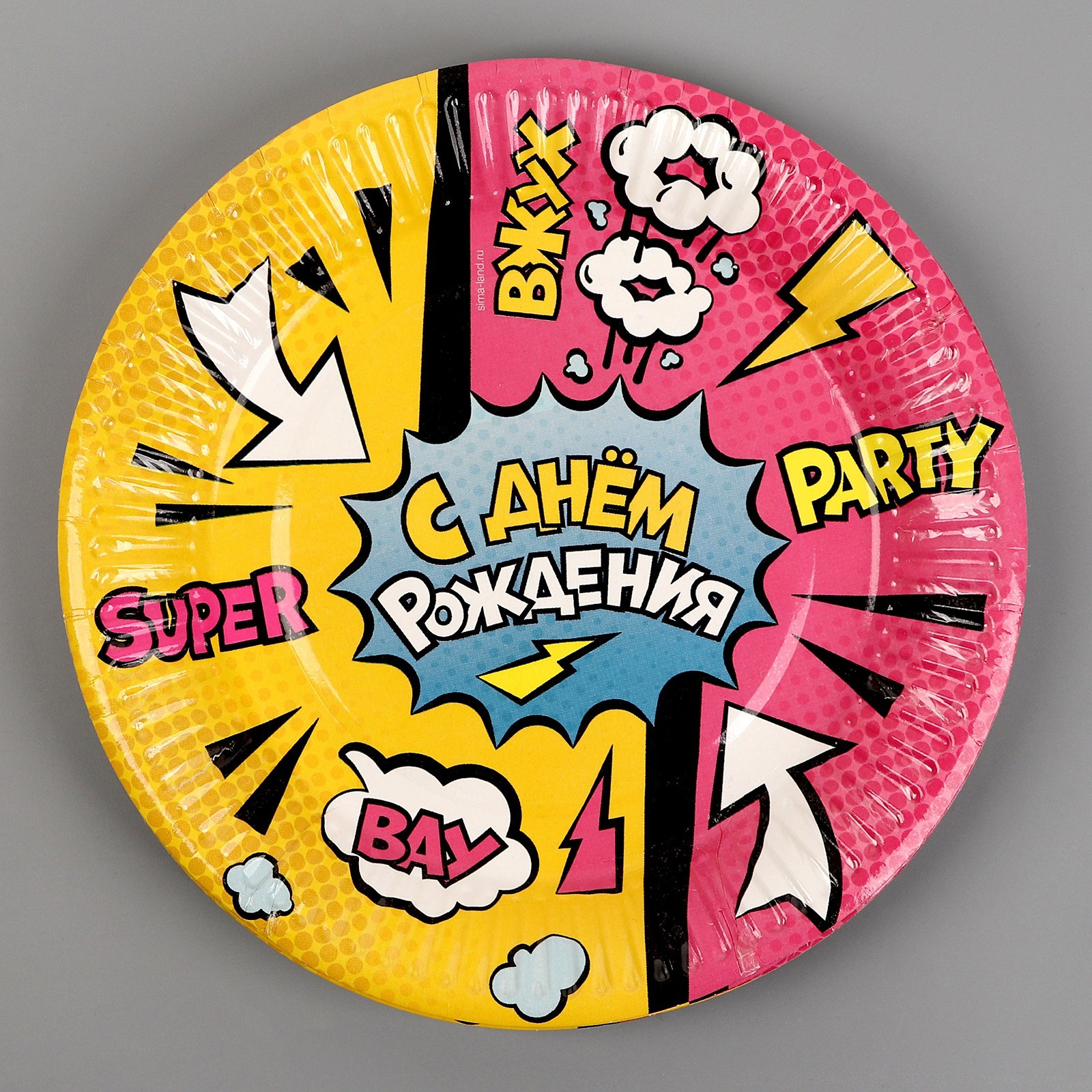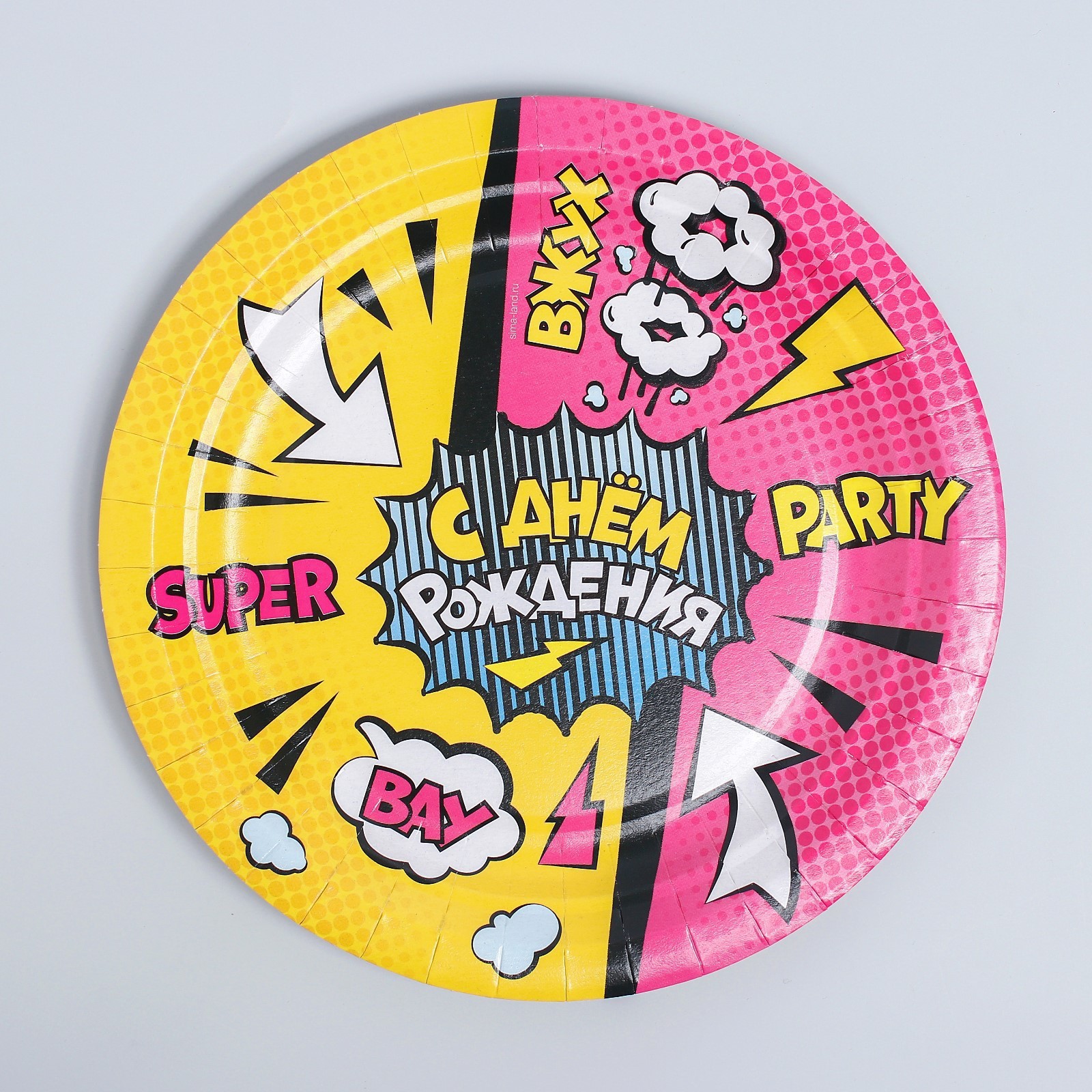 Тарелка одноразовая бумажная с днём рождения "Super Party", 18 см