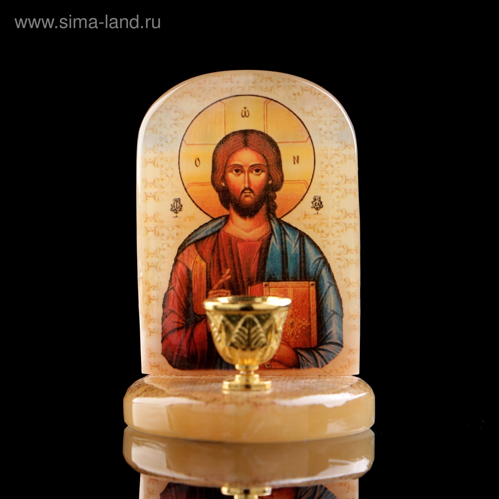Икона «иисус господь вседержитель», настольная с подсвечником на 1 свечу, селенит. Селенит — это материал, который относится к разновидности гипса, жёлто-розового цвета с шелковистым блеском. Внутренние волокна расположены плотно, это даёт эффект «кошачьего глаза». Изделия из селенита завораживают игрой света, нежными тонами и хрупкостью. При прикосновении есть ощущение исходящей энергии. У селенита есть разные названия: духовный камень, лунный камень, сатиновый шпат и шелковистый гипс. Считается, он полезен для: ЖКТ;эндокринной системы;зубов и костей.Также он повышает работоспособность, снимает стресс и положительно влияет на душевное равновесие. Такое изделие станет необычным подарком и украшением дома. Товар изготовлен вручную из натурального камня, допускается наличие прожилок и внутренних трещин. Каждое изделие имеет индивидуальный оттенок и рисунок. Размеры могут отличаться. Набор:Нет|Святые:Иисус Христос|Длина, см:8|Ширина, см:5|Тематика праздника:Универсальная тематика|Материал:Селенит|Страна:Россия  развернуть описание ▼
