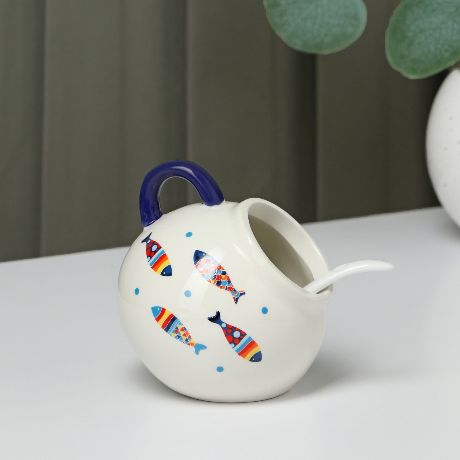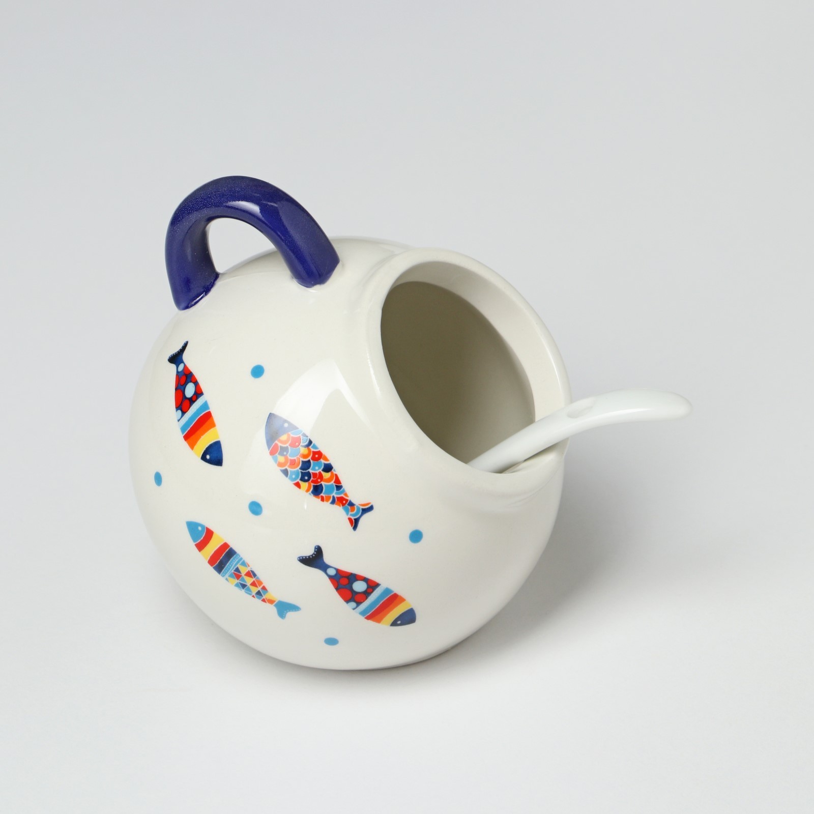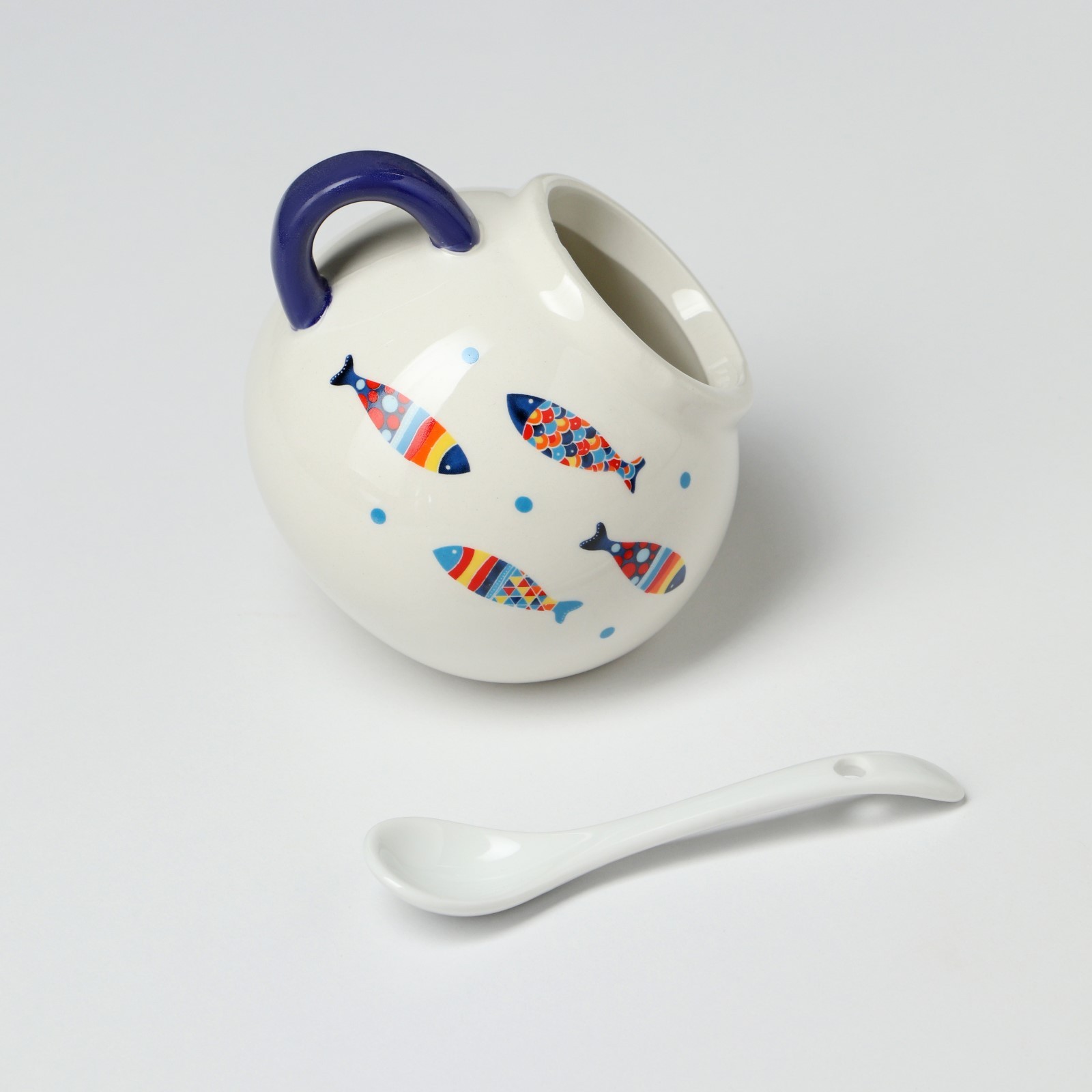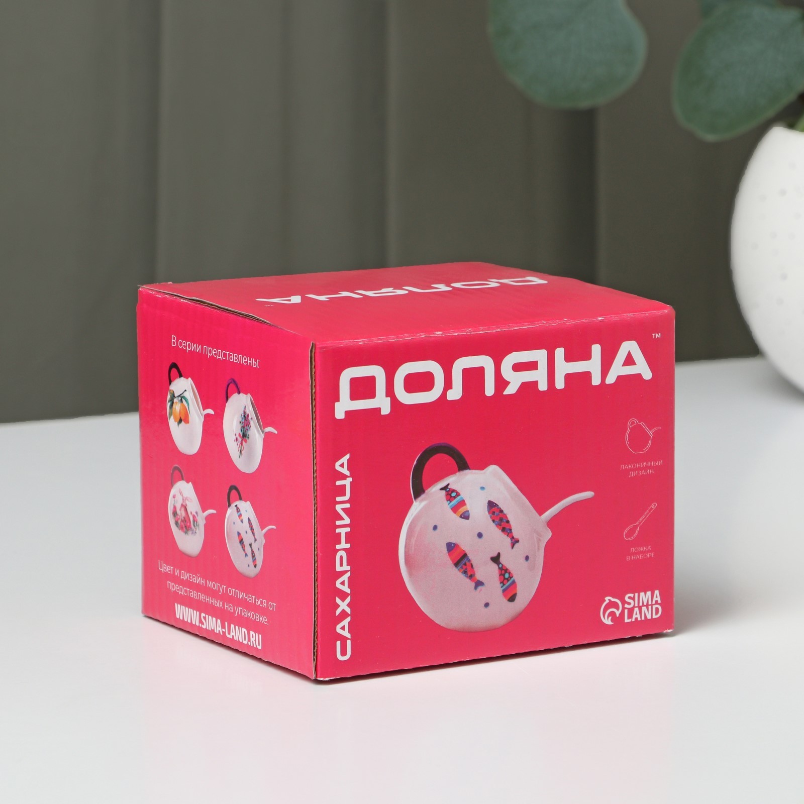 Сахарница с ложкой доляна «емеля», 200 мл, цвет белый. Сахарница гармонично дополнит сервировку стола. Элегантное изделие отличает высокое качество обработки поверхности и насыщенность цвета. Данная посуда универсальная, подходит как для сахара, так и для мёда, конфет, изюма, орехов и многого другого. Оригинальный дизайн и качество исполнения сделают такую сахарницу настоящим украшением стола к чаепитию. Она удобна в использовании и понравится каждому. Нельзя мыть в посудомоечной машине и использовать в микроволновой печи. Такая сахарница сможет стать настоящим украшением кухни или приятным подарком для ваших родных и близких. Цвет: Синий Цвет: Белый Форма: Круглая В наборе, шт.: 2 Объём, мл: 200 Тематика: Подводный мир Материал: Керамика (Доломит) Можно мыть в посудомоечной машине: Нет Можно использовать в СВЧ-печи: Нет Текстура: Гладкая Особенности: Без особенностей Матовая поверхность: Нет Запрет реализации по сегментам: 00000000485  развернуть описание ▼