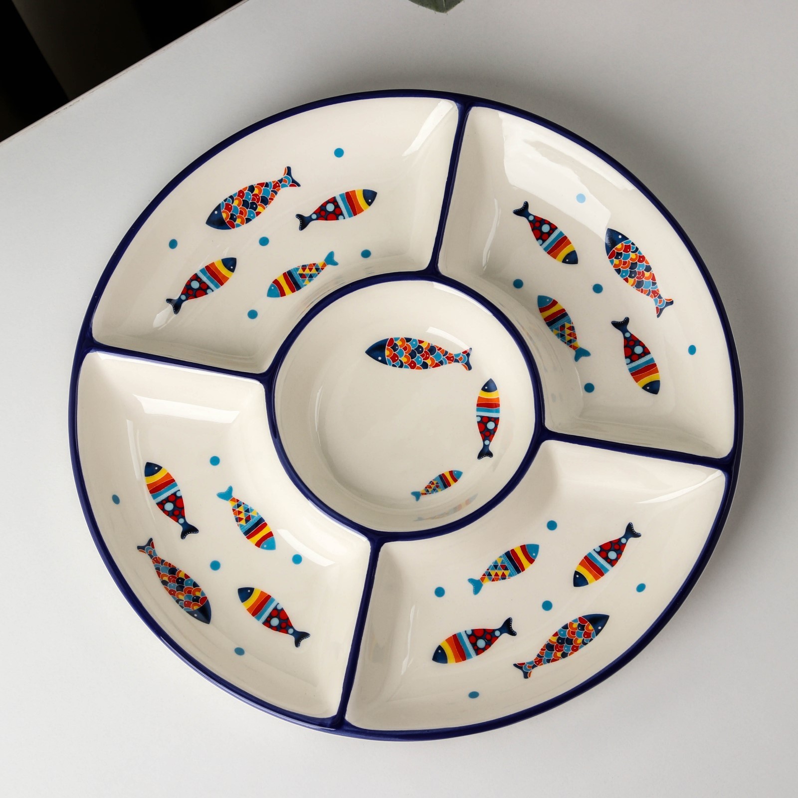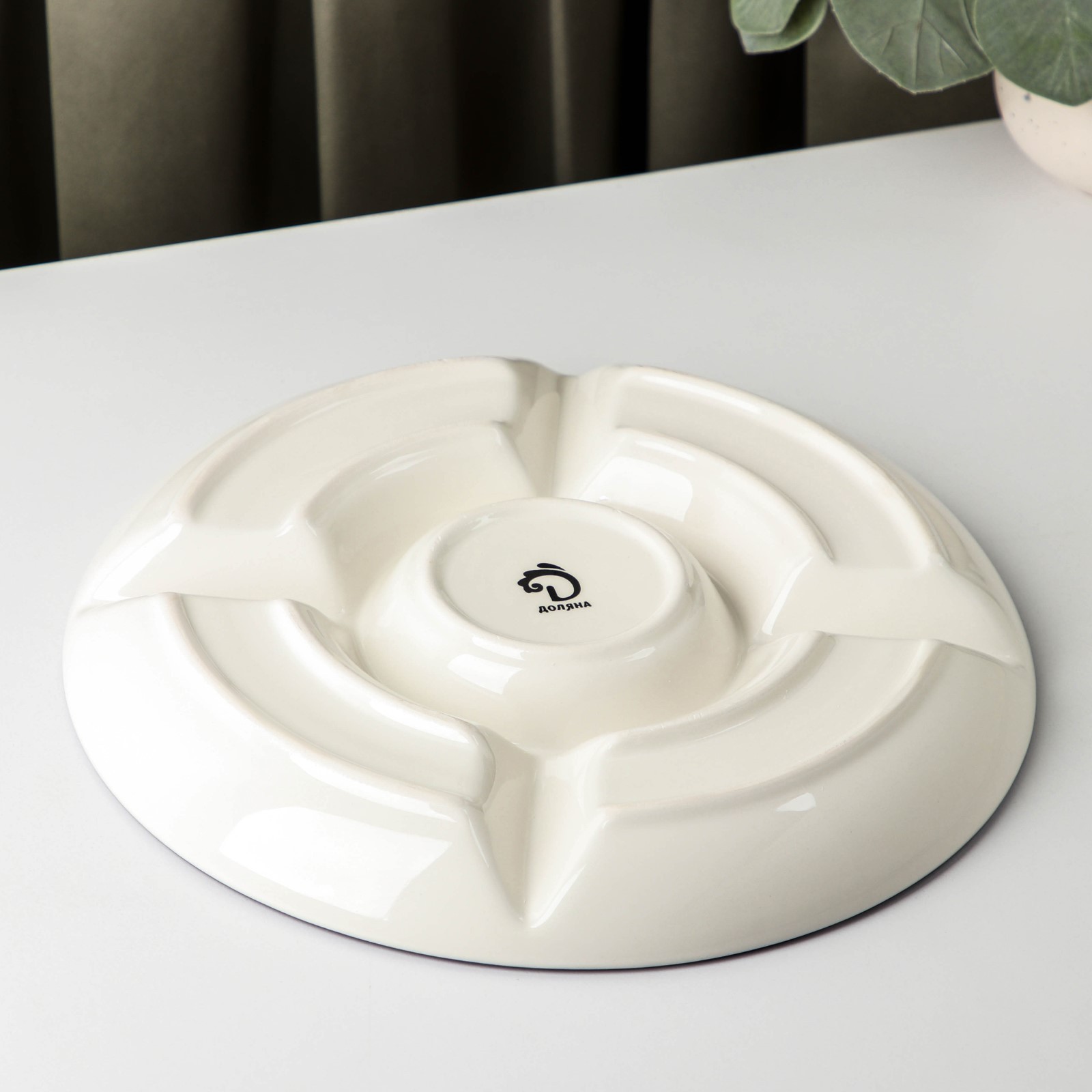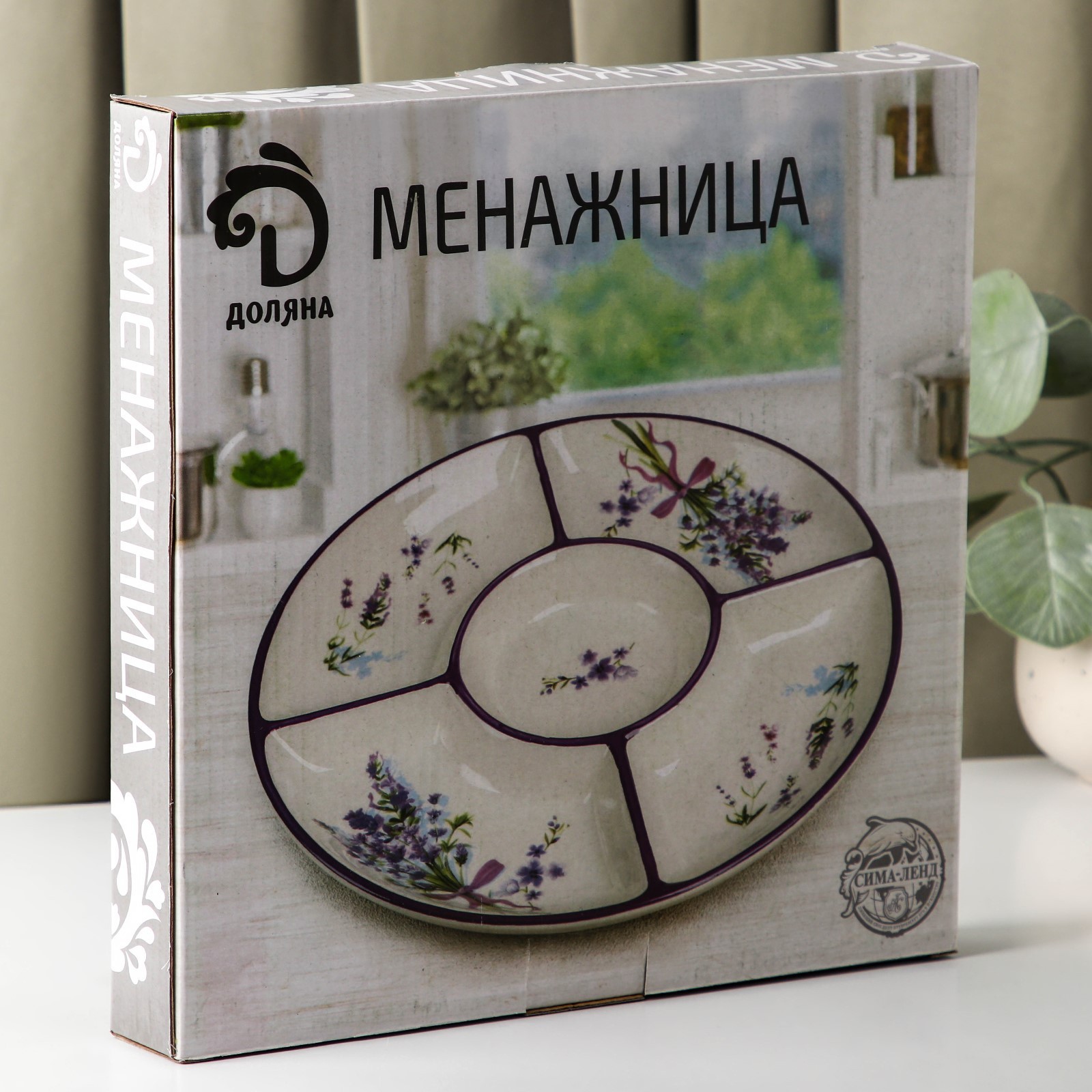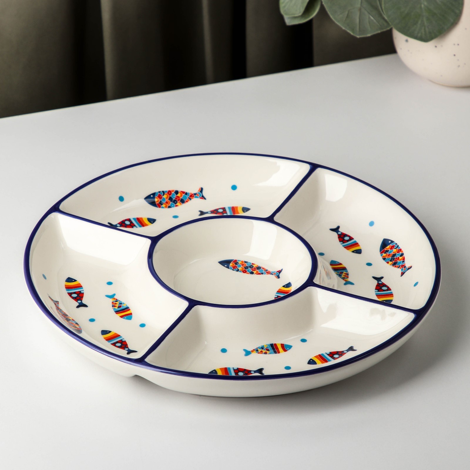 Менажница 5 ячеек доляна «емеля», d=26 см. Посуда серии «Емеля» от торговой марки Доляна изготовлена из качественного доломита. Благодаря оригинальному дизайну, изделия гармонично дополнят сервировку стола, а также прекрасно подойдут в качестве подарка. Посуда выполнена в приятных тонах, что позволит вписать её практически в любой интерьер. Не рекомендуется мыть в посудомоечной машине и использовать в СВЧ-печи. В качестве ухода использовать мягкие губки и неабразивные чистящие средства. Цвет: Белый Цвет: Синий Диаметр, см: 26 parts count: 0 В наборе, шт.: 1 Количество ячеек: 5 Тематика: Подводный мир Материал: Керамика (Доломит) Можно мыть в посудомоечной машине: Нет Можно использовать в СВЧ-печи: Нет Текстура: Гладкая Особенности: Без особенностей Матовая поверхность: Нет Форма: Круг  развернуть описание ▼
