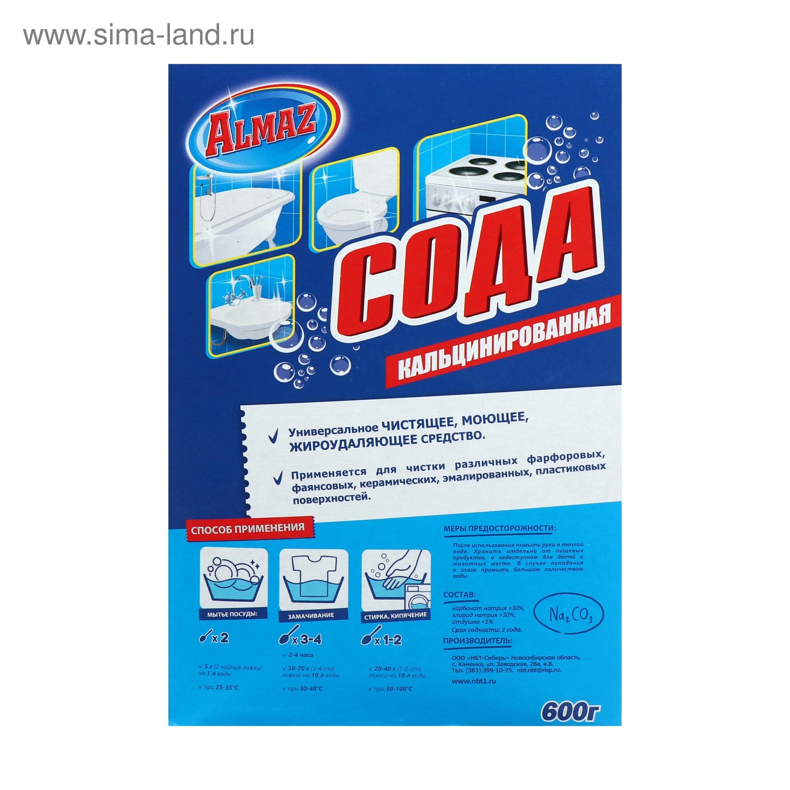 Алмаз Сода кальцинированная универсальное чистящее и моющее средство. Применяется для мытья фарфора, фаянсовой и эмалированной посуды. Эффективно удаляет загрязнения с электрической плиты, духовки, гриля, микроволновой печи, вытяжки и т. д. Незаменим для мытья раковин, душевых кабин, кафеля, ванн и унитазов, удаляя въевшуюся грязь и другие трудновыводимые загрязнения. Не содержит фосфатов, является естественной добавкой для стирального порошка, так же может полностью его заменить, смягчает воду, не раздражает кожу.
