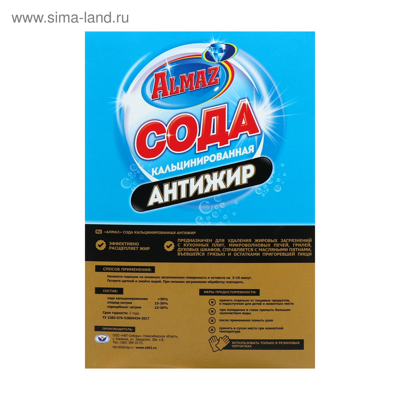 Сода кальцинированная almaz, "антижир", 600 гр. Алмаз Сода кальцинированная универсальное чистящее и моющее средство. Применяется для удаления жировых загрязнений с кухонных плит, микроволновых печей, грилей, духовых шкафов, справляется с масляными пятнами, въевшейся грязью и остатками пригоревшей пищи. Состав: Сода кальцинированная >30%, хлорид натрия 15-30%, перкарбонат натрия 15-30%. Меры предосторожности: После использования помыть руки в теплой воде. Хранить отдельно от пищевых продуктов, в недоступном для детей и животных месте. В случае попадания в глаза промыть большим количеством воды. Срок годности: 2 года. parts count: 0 Назначение: Универсальное Температурное ограничение: Нет  развернуть описание ▼