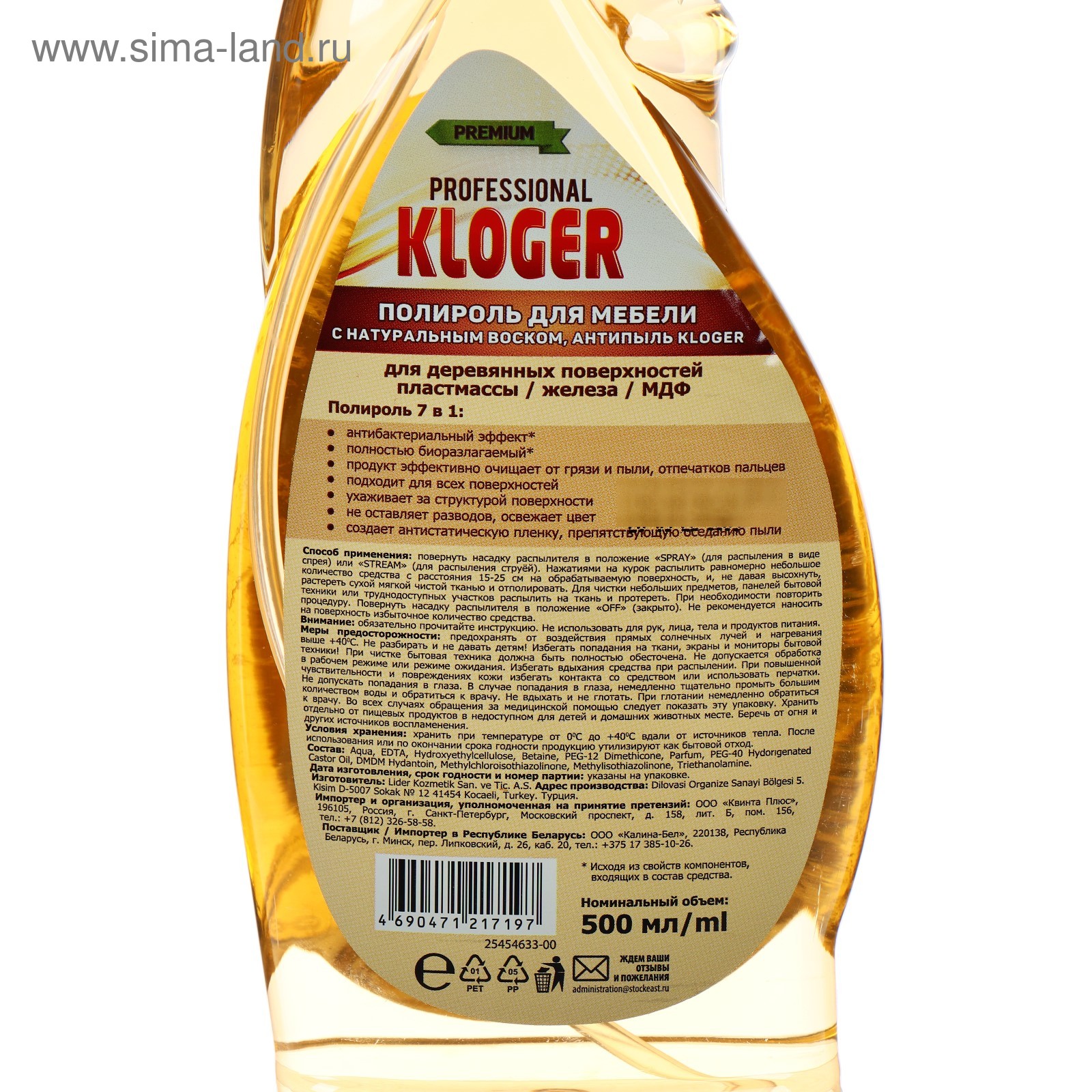 Чистящее средство "kloger proff", для мебели, полироль 7 в 1 для любых поверхностей, 500 мл. Чистящее средство на органических компонентах, биоразлагаемый. Для деревянных поверхностей пластмасс, железа, МДФ. Очищает от грязи и пыли, препятствует созданию грязи и пыли. антибактериальный эффект;полностью биоразлагаемый;продукт эффективно очищает от грязи и пыли, отпечатков пальцев;подходит для всех поверхностей;ухаживает за структурой поверхности;не оставляет разводов, освежает цвет;создает антистатическую пленку, препятствующую оседанию пыли. Состав: вода >30%, АПАВ 5-15%, изопропанол 5-15%, НПАВ<5%, отдушка< 5%, консервант<5%, краситель< 5%. parts count: 0 Вес, г/Объём, мл: 500 Форма выпуска: Спрей Вид: Полироль Температурное ограничение: Нет  развернуть описание ▼
