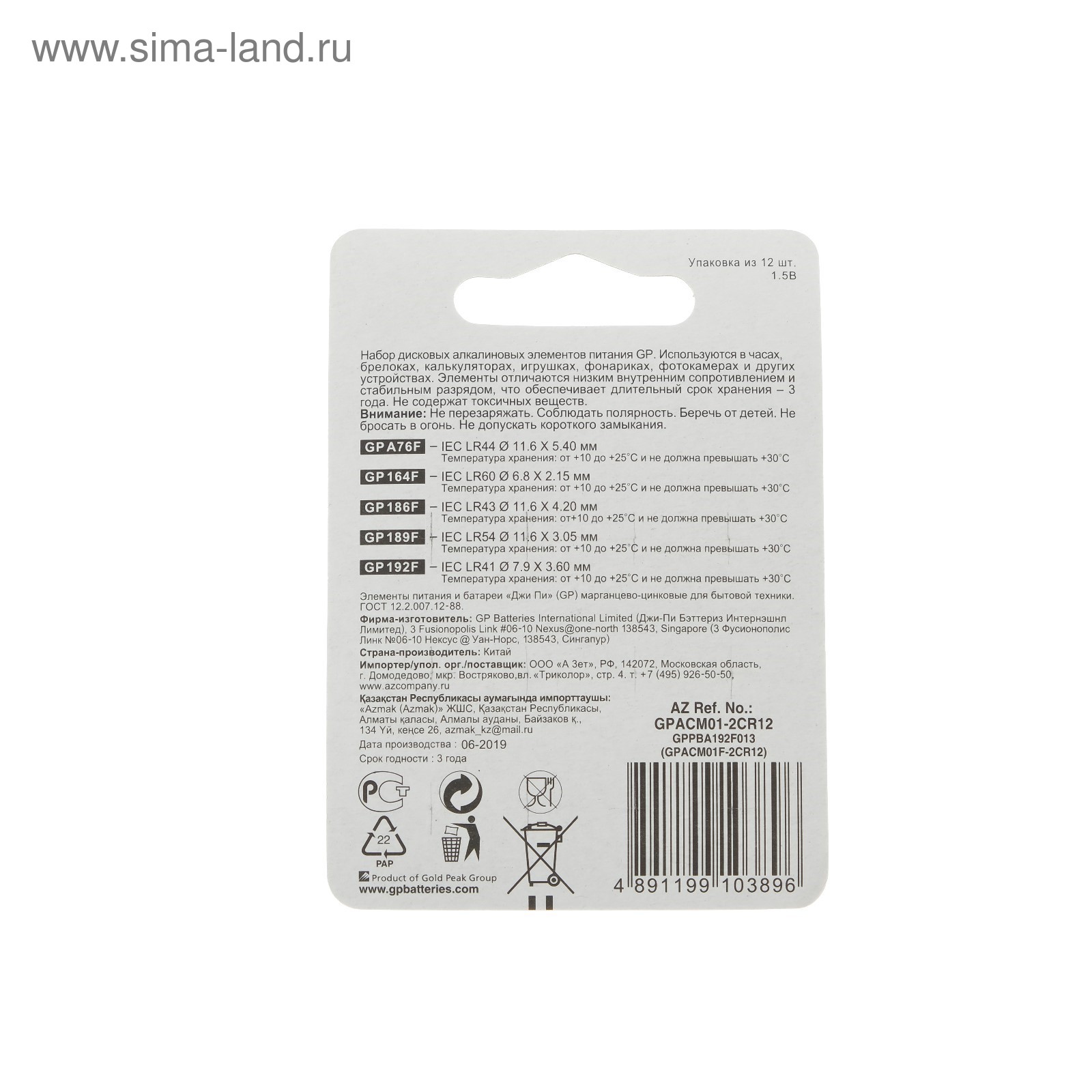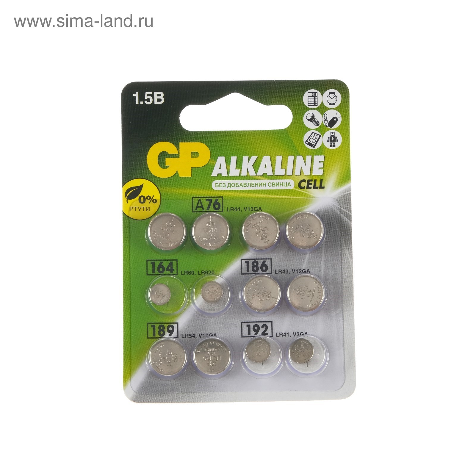 Батарейки алкалин gp, lr44(a76)-4шт,lr60(164)-2шт,lr43(186)-2шт,lr54(189)-2шт,lr41(192)-2шт. Кнопочные батарейки классифицируют по высоте, диаметру, напряжению, ёмкости, химическому составу. Перед покупкой посмотрите наименование вашего элемента питания или требования от производителя к прибору и следуйте рекомендациям ниже, чтобы приобрести аналогичную батарейку. Первые две буквы в маркировке обозначают тип элемента. CR — литиевая батарейка, напряжение 3 В. LR — щелочная, 1, 5 В. SR — серебряно-цинковая, 1, 55 В. PR — воздушно-цинковая, 1, 4 В. После букв следуют три или четыре цифры, которые указывают на размеры изделия. Первая часть (одна или две цифры) характеризует диаметр в миллиметрах, а вторая — высоту в 1/10 мм. Значения округляются до целой части. Например: CR2016 — литиевый элемент, диаметр 20 мм, высота 1, 6 мм;LR621 — щелочной, диаметр 6, 8 мм, высота 2, 15 мм. Держите кнопочные батарейки подальше от маленьких детей! В упаковке, шт.: 2 Вид упаковки: Блистер Типоразмер батареек: LR41 (AG3, LR736, SR41) Типоразмер батареек: LR44 (V13GA, AG13, LR1154, SR44) Типоразмер батареек: LR1142 (AG12, LR43) Тип батарейки: Алкалиновая Температурное ограничение: Нет  развернуть описание ▼