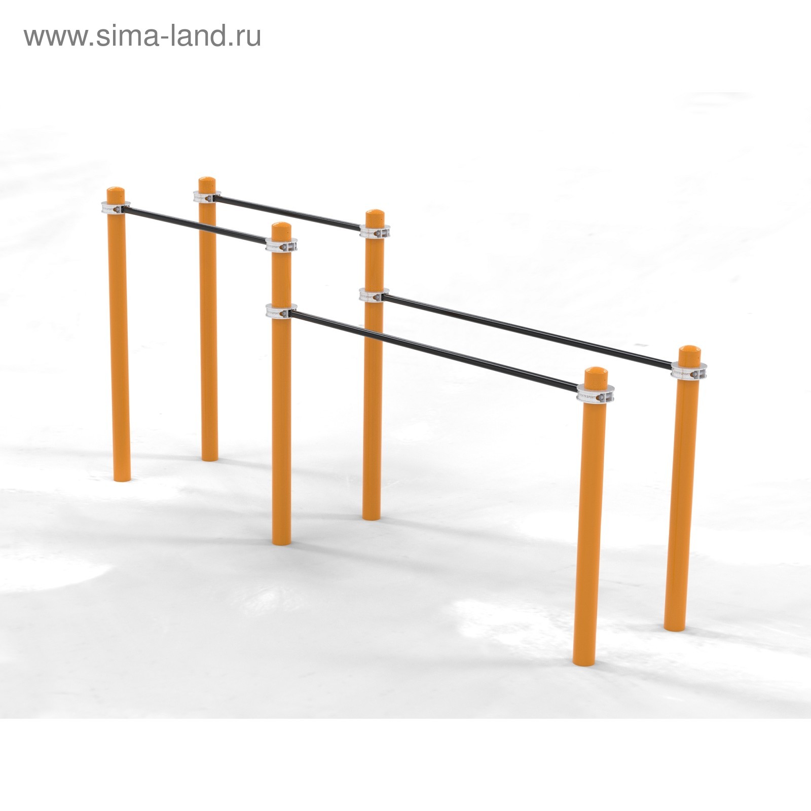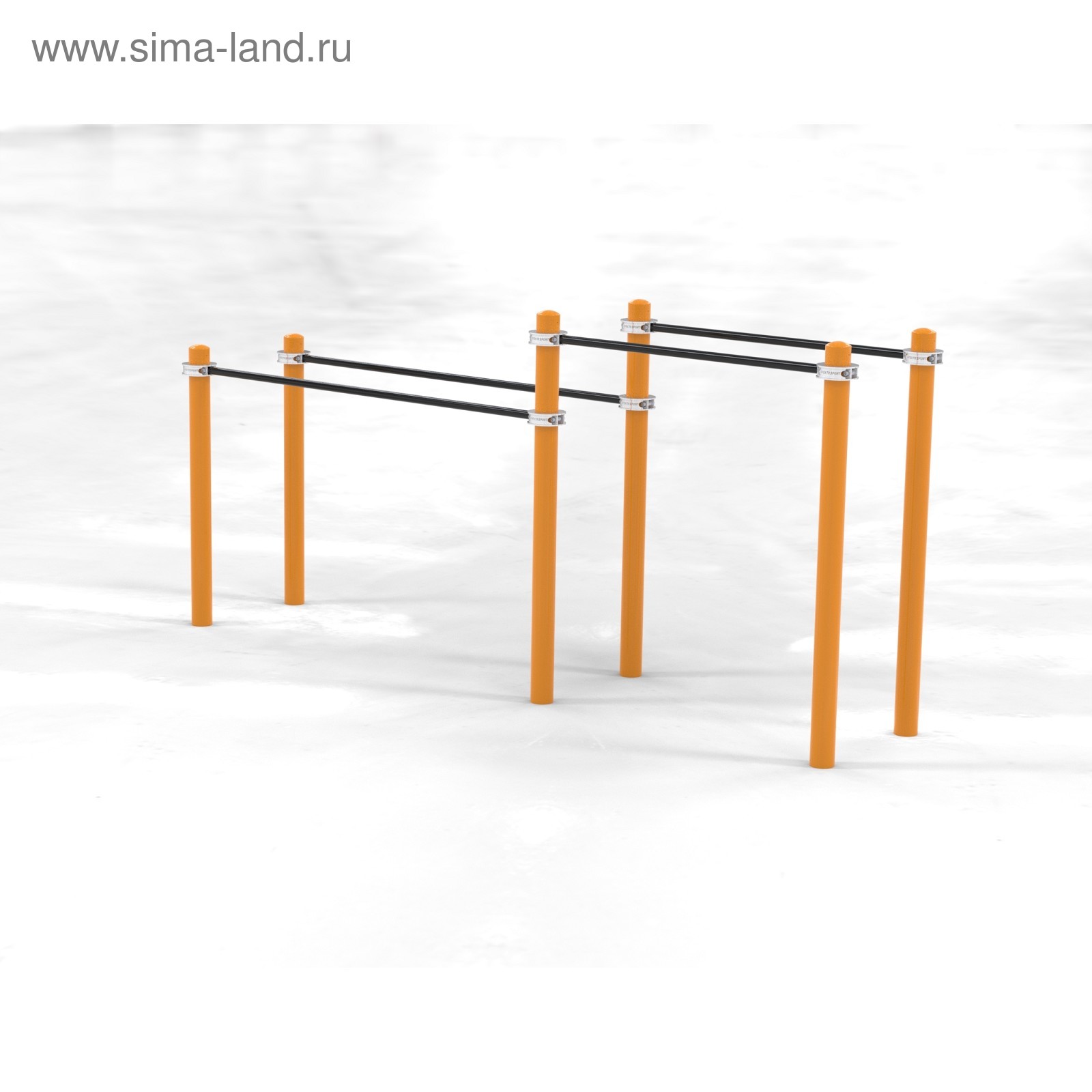 Брусья для занятий воркаутом, двойные, разновысотные, gto-09, 89 мм, 3200 х 700 х 1500 мм. Конструкция спортивного снаряда для занятий воркаутом, покрыта атмосферостойкой порошковой краской, нанесенной методом электростатического напыления с последующим обжигом в печи. Спортивный снаряд состоит из шести опорных столбов, изготовленных из металлических труб. Характеристики: несущие стойки закрыты сверху металлическими полусферами;расстояние между опорными вертикальными столбами: 600 мм – 500 мм;жерди брусьев изготовлены из круглой трубы;длина рабочей поверхности жердей: от 1200 мм до 1800 мм;жерди брусьев фиксируются при помощи металлических хомутов на высоте 1100 мм и 1400 мм от поверхности основания;размеры (ДхШхВ): 3200 х 700 х 1500 мм. В комплект поставки входят болты для крепления хомута.