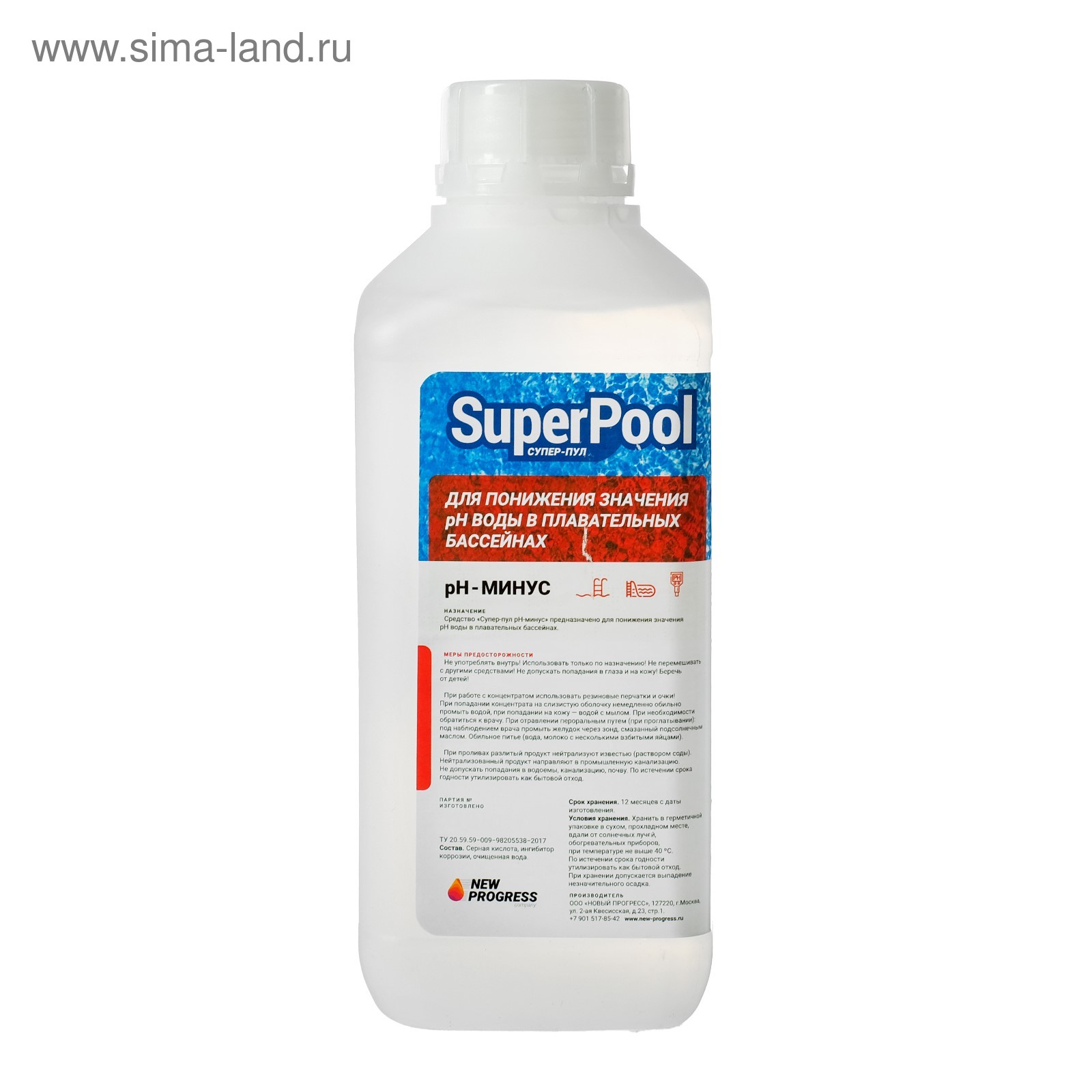 Средство для понижения уровня ph "супер-пул", минус, 1 л. Вес, кг/Объём, л: 1 Вид средства: pH- Форма выпуска: Жидкость Температурное ограничение: Нет  развернуть описание ▼