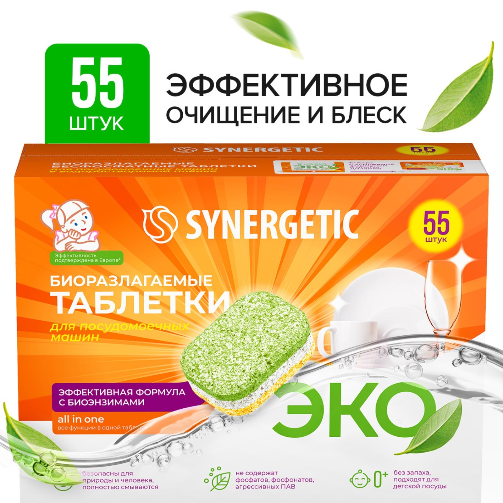 Таблетки для посудомоечных машин Synergetic, бесфосфатные,биоразлагаемые, 55 шт