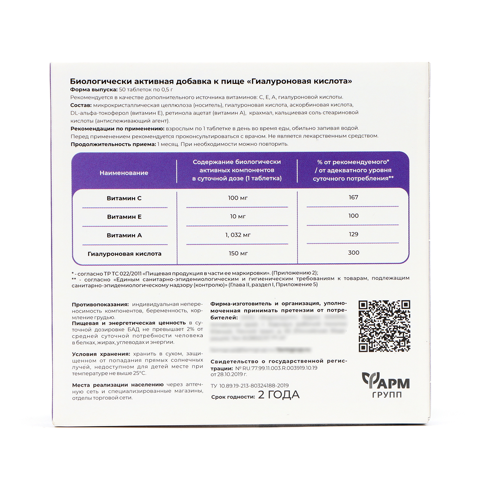 Гиалуроновая кислота, 50 таблеток по 500 мг. Гиалуроновая кислота - притягивает и удерживает воду, тем самым обеспечивая упругость каркаса кожи и укрепляя его. Это одно из самых популярных средств для сохранения молодости кожи. Чтобы доставить ее в глубокие слои кожи и запустить процесс омоложения изнутри наша компания создала биологически активную добавку "Гиалуроновая кислота с витаминами A, C, E". Состав: микрокристаллическая целлюлоза (носитель), гиалуроновая кислота, аскорбиновая кислота, DL-альфа-токоферол (витамин E), ретинола ацетат (витамин А), крахмал картофельный, кальциевая соль стеариновой кислоты (антислеживающий агент). Применение: взрослым по 1 таблетке в день во время еды, обильно запивая водой. Продолжительность приема - 1 месяц. При необходимости прием можно повторить. Перед применением рекомендуется проконсультироваться с врачом. Рекомендуется в качестве дополнительного источника селена. Селен - микроэлемент, который участвует в работе иммунной, антиоксидантной и детоксикационной систем организма. Принимает участие в синтезе гормонов щитовидной железы и необходим для ее нормальной работы. Укрепляет иммунитет. Снижает риск онкологии и сердечно-сосудистых заболеваний. Обладает антиоксидантным и антитоксичным действием (ускоряет выведение мышьяка, таллия, ртути, кадмия, свинца). Снижает вред от лучевой терапии при лечении онкологии. Влияет на фертильность и потенцию у мужчин, необходим для развития плода и снижает риск выкидыша. Вес, г/Объём, мл: 25 В упаковке, шт.: 50 Количество капсул/таблеток в упаковке: 50 Форма выпуска: Капсулы/таблетки Вид: Аминокомплексы Температурное ограничение: Нет Назначение: При кожных заболеваниях Назначение: Для женского здоровья Честный знак: Да Компоненты: Гиалуроновая кислота Действие: Общеукрепляющее  развернуть описание ▼