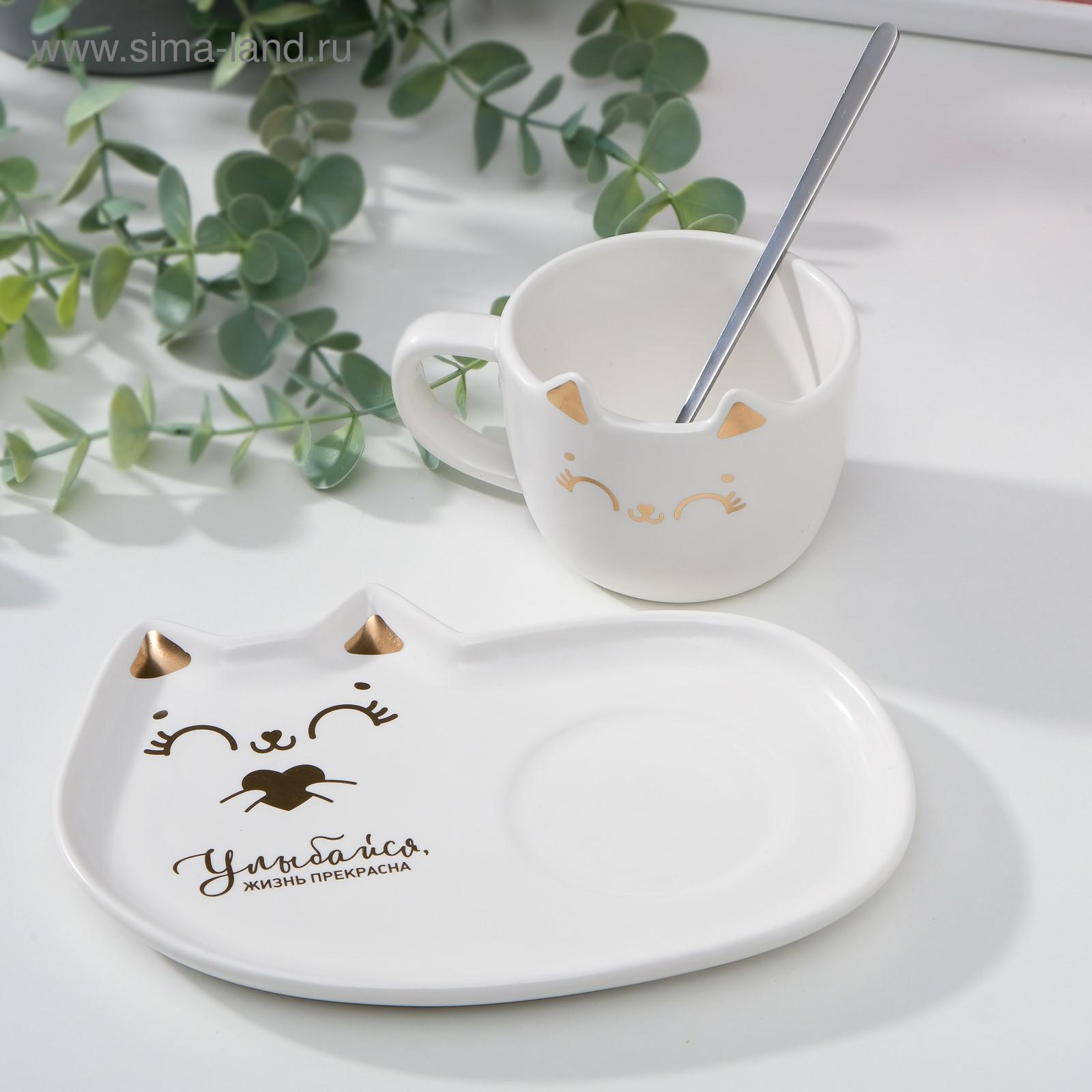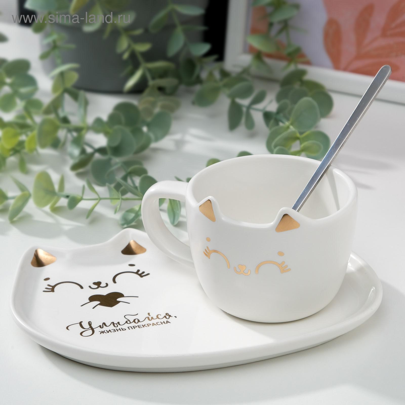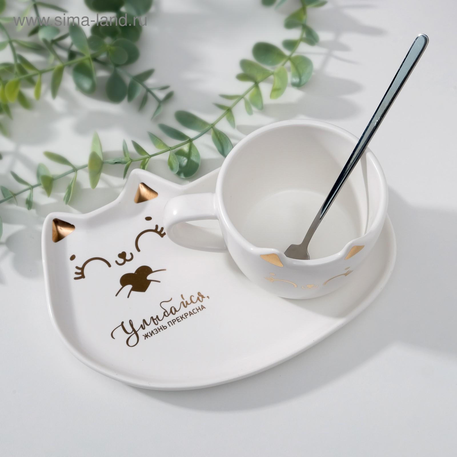 Подарочный набор из керамики «улыбайся»: кружка 200 мл, блюдце 18 х 11 см, ложка
