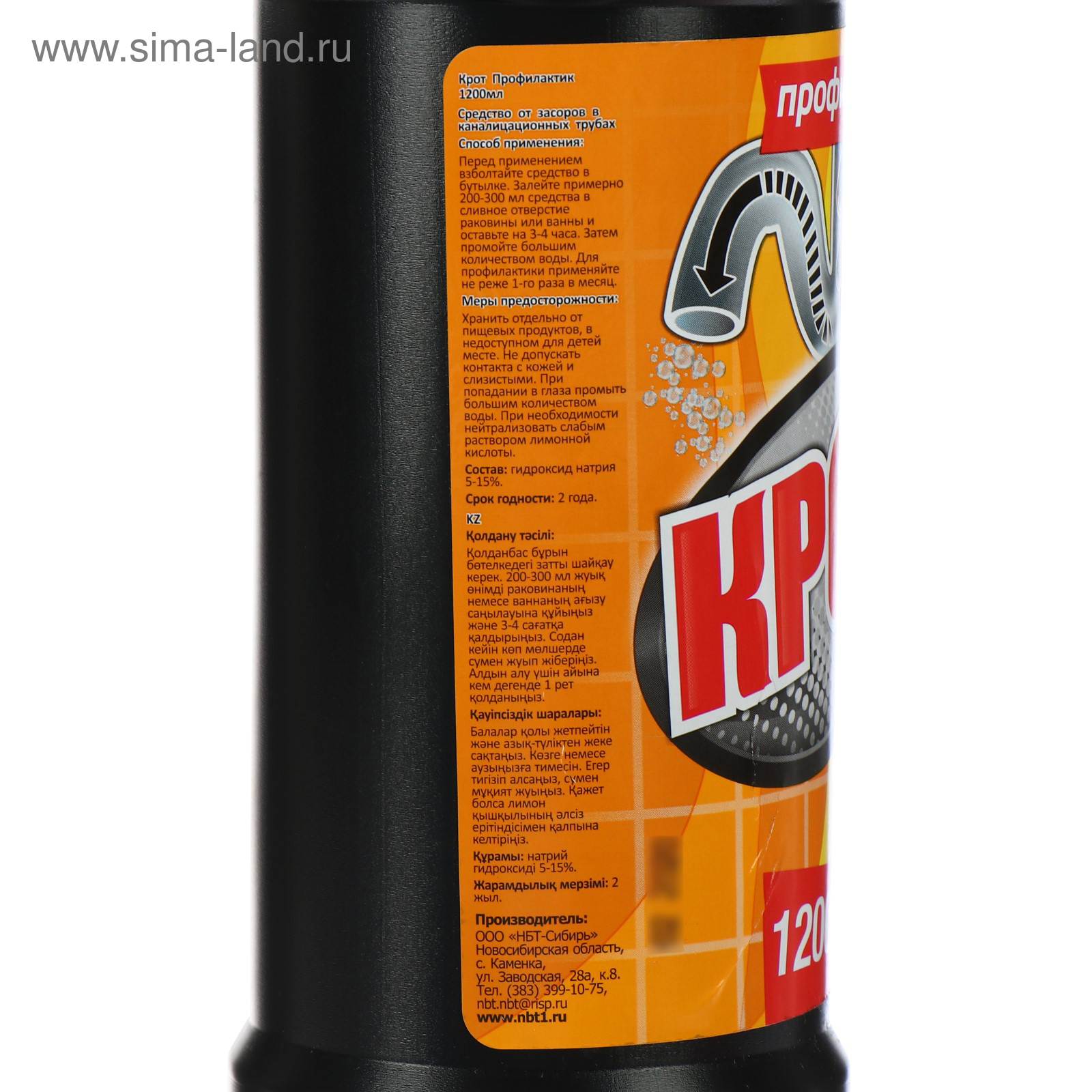 Средство от засоров в канализационных трубах "крот", 1200 мл. Средство для прочистки труб. Средство быстро проникает через засоры, пробивает пробки в стоках, удаляет неприятные запахи и растворяет различные отложения. Подходит для любого типа сливных труб, в том числе из пластика. Способ применения: взболтать. Залейте примерно 200-300 мл средства в сливное отверстие раковины или ванны и оставьте на 3-4 часа. Затем промойте большим количеством воды. Для профилактики применяйте не реже 1-го раза в месяц. Меры предосторожности: хранить отдельно от пищевых продуктов, в недоступном для детей месте. Не допускать контакта с кожей и слизистыми. При попадании в глаза промыть большим количеством воды. При необходимости нейтрализовать слабым раствором лимонной кислоты. Срок годности 2 года с даты изготовления. Состав: гидроксид натрия 5-15%. Вес, г/Объём, мл: 1200 Температурное ограничение: Нет  развернуть описание ▼