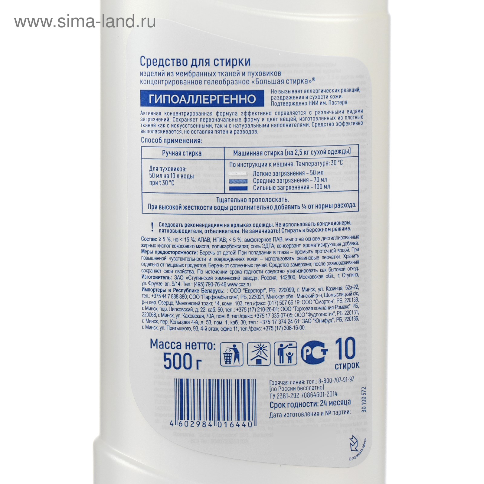 Жидкое средство для стирки "большая стирка", гель, для пуховиков, гипоаллергенно, 500 мл
