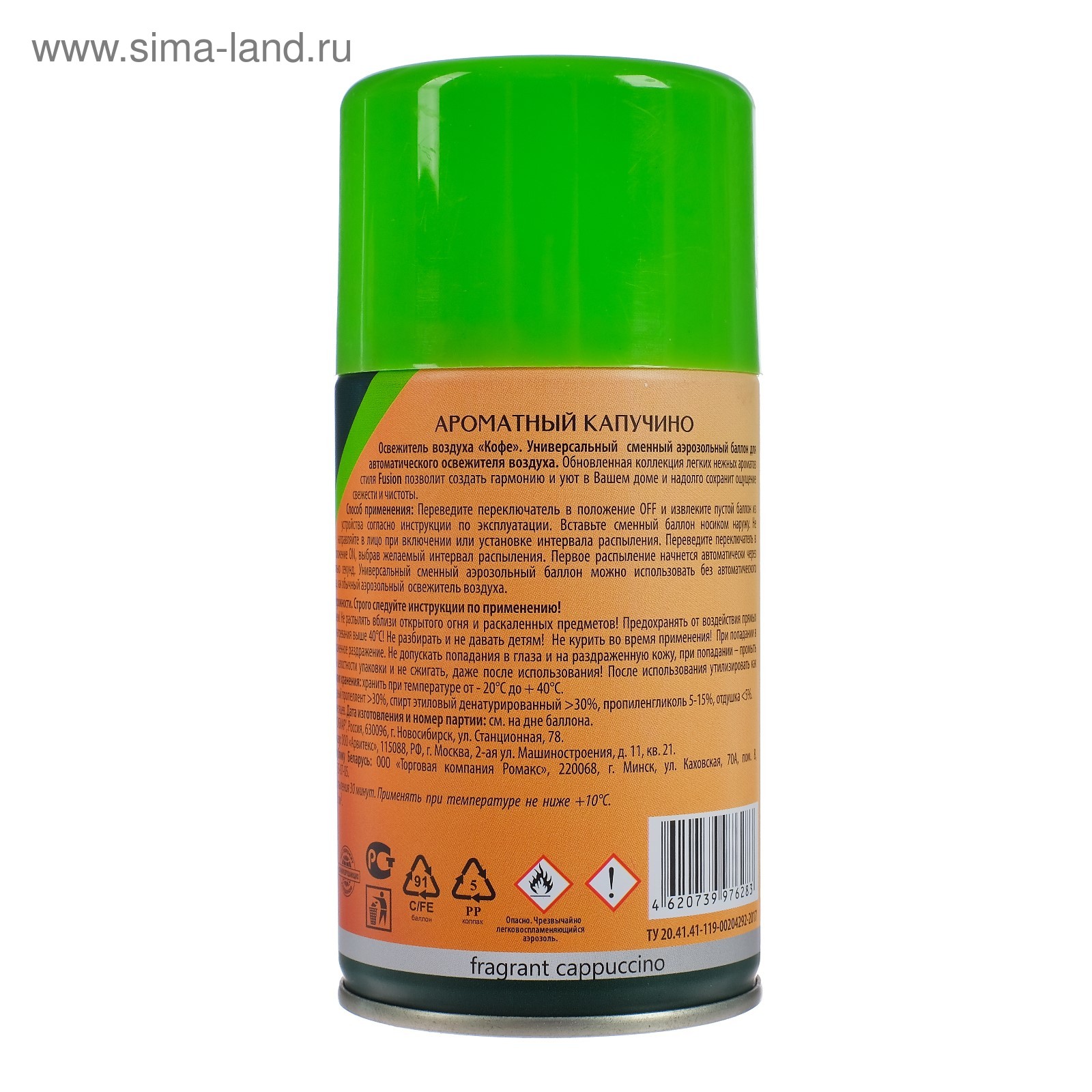 Освежитель воздуха master fresh, сменный баллон ароматный капучино 250 мл. Универсальный сменный аэрозольный баллон для автоматического освежителя воздуха. Обновленная коллекция легкий нежных ароматов позволит создать гармонию и уют в Вашем доме и надолго сохраняет ощущение свежести и чистоты. Создает атмосферу свежести, чистоты и уюта, наполняя дом ароматом свежего ароматного кофе. Заменяет свечи, арома-лампы, саше, диффузоры. Для ванной комнаты и туалета более современный аналог освежителя воздуха. Для гостиной, детской или спальни освежает и увлажняет воздух, создает комфортный уровень ароматизации помещения. Для кухни нейтрализует запахи жарки, некоторых продуктов (лук, чеснок, рыба). Высокая концентрация и активная формула баллон действует до 60 дней. Способ применения: извлеките пустой баллон из устройства согласно инструкции по эксплуатации. Вставьте сменный баллон носиком наружу. Не направляйте в лицо при включении или установке интервала распыления. Переведите переключатель в режим вкл, выбрав желаемый интервал распыления. Первое распыление начнется автоматически через несколько секунд. Универсальный сменный аэрозольный баллон можно использовать без автоматического освежителя воздуха. Меры предосторожности: не распылять вблизи открытого огня и раскаленных предметов. Предохранять от воздействия прямых солнечных лучей. Не разбивать и не давать детям. Не курить во время применения. При попадании в глаза вызывает сильное раздражение. Не допускать попадания в глаза и на раздраженную кожу, при попадании промыть большим количеством воды. Не сжигать, даже после использования. Хранить при температуре от -20 °С до + 40 °С. Состав: отдушка, пропиленгликоль, денатурированный спирт, пропеллент углеводородный. Объём, мл: 250 Аромат: Кофе Форма выпуска: Аэрозоль Принцип работы: Ручной Вид распыления: Влажное Температурное ограничение: Нет Тип: Сменный баллон  развернуть описание ▼