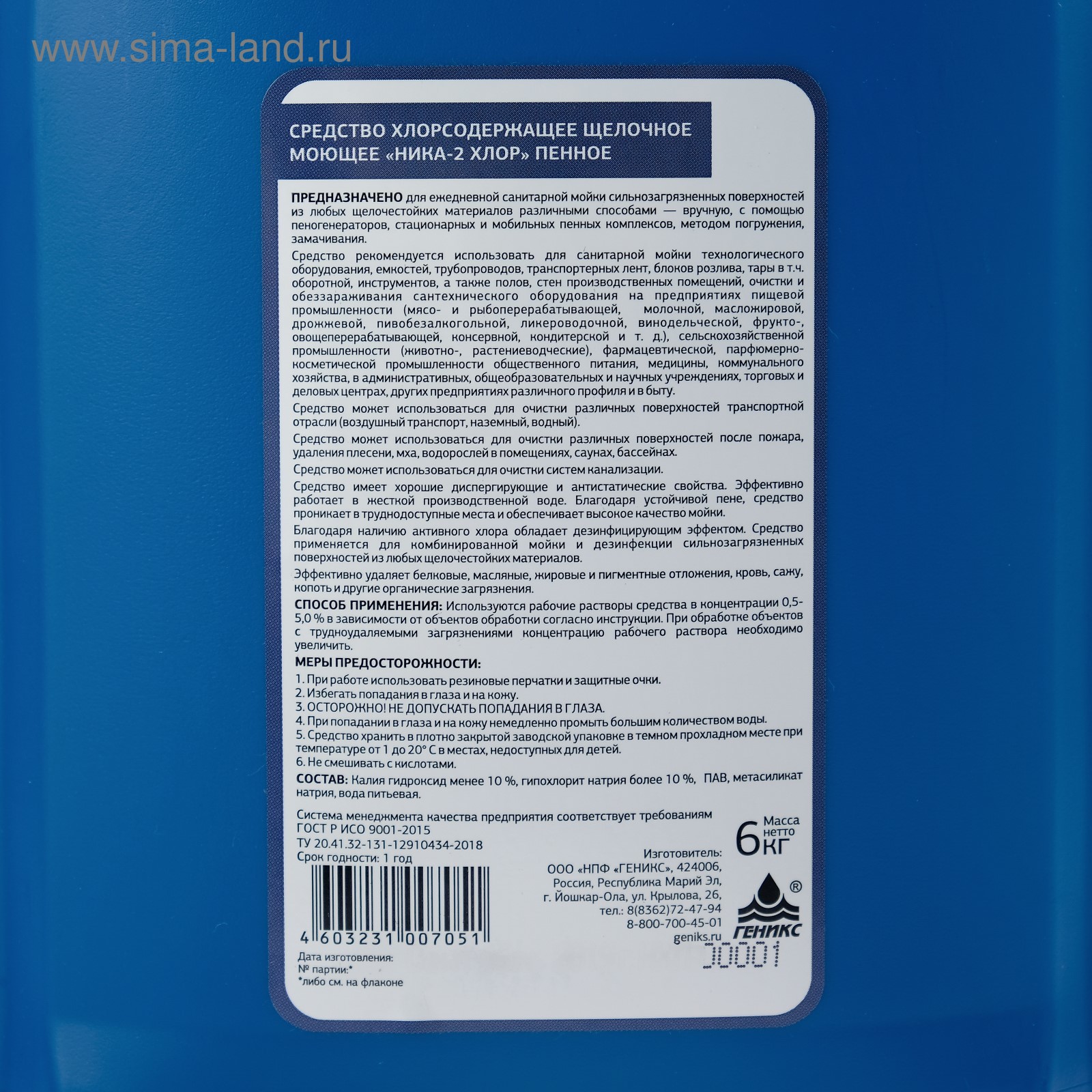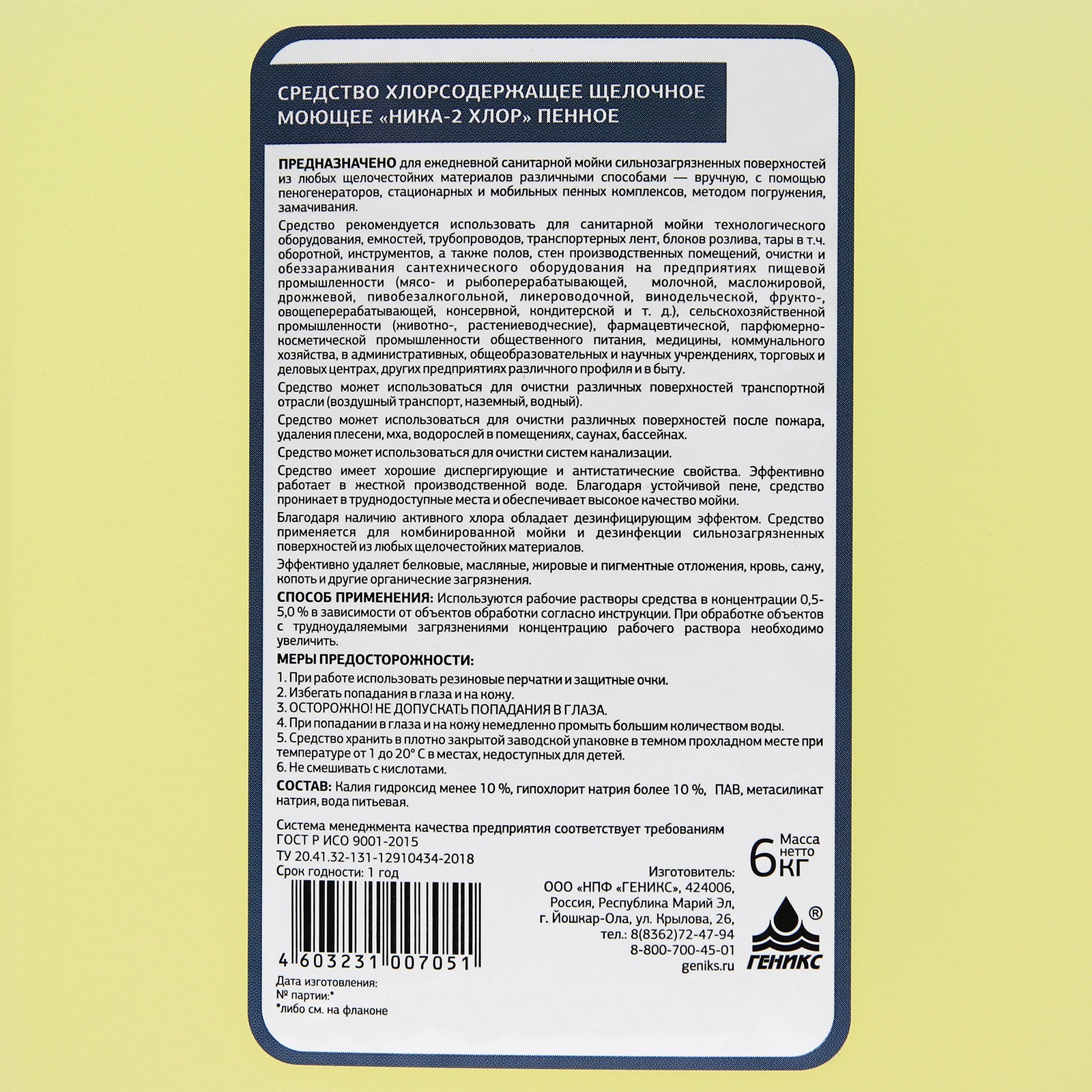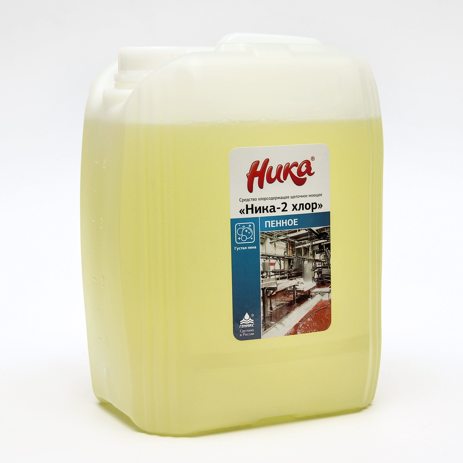 Средство хлорсодержащее щелочное моющее "ника-2 хлор (пенное)", канистра 6,0 кг. Дезинфицирующее средство Ника-2 хлор пенное. Хлорсодержащее щелочное моющее пенное средство «Ника-2 Хлор» применяется в процессах санитарной обработки на предприятиях в различных отраслях. Представляет собой прозрачную жидкость желтого цвета с характерным запахом хлора, растворяющуюся в воде в любых соотношениях. Имеет хорошие диспергирующие и антистатические свойства. Обладает дезинфицирующим эффектом, благодаря наличию активного хлора. Эффективно удаляет стойкие органические отложения, жиров, масла, денатурированного белка, пригаров, дрожжей, хмелевых смол, солода, сахара, а также удаляет растительные пигменты, кровь, пищевые красители. Не обладает аллергенным воздействием на организм. Растворы средства «Ника-2 хлор» предотвращают отложение солей жесткости воды на поверхности технологического и моечного оборудования, при промывке оборудования устраняют запахи. Состав: калий гидроксид менее 10%, гипохлорит натрия более 10%, ПАВ, метасиликат натрия, вода питьевая. Срок годности: 1 год. parts count: 0 Вес, г/Объём, мл: 6000 Объём, мл: 6000 Форма выпуска: Жидкость Назначение: Профессиональные Температурное ограничение: Нет Вид: Хлоросодержащиее  развернуть описание ▼