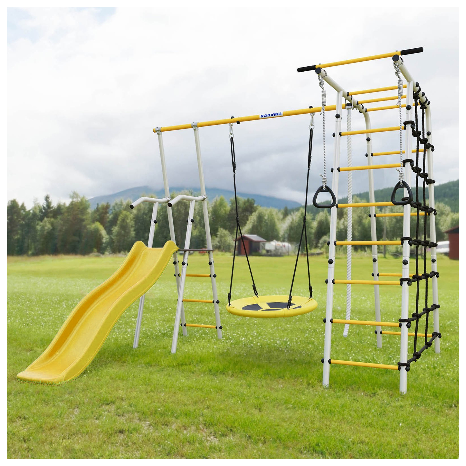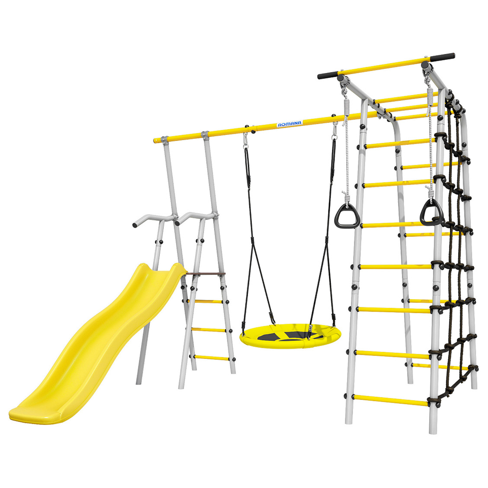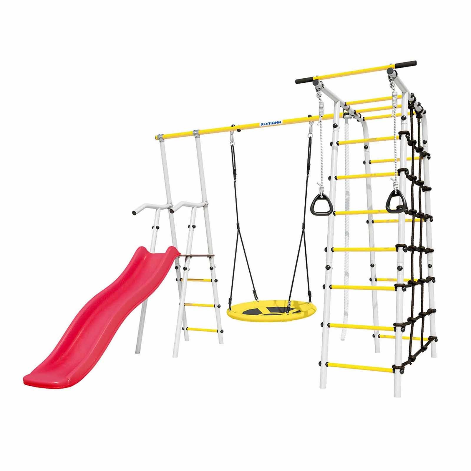 Детский спортивный комплекс уличный «богатырь», качели гнездо. Возраст: От 3 лет Maксимальная нагрузка, кг: 100 Комплектация: Нерегулируемый турник Комплектация: Лестница Комплектация: Сетка Комплектация: Кольца Комплектация: Горка Комплектация: Качели  развернуть описание ▼