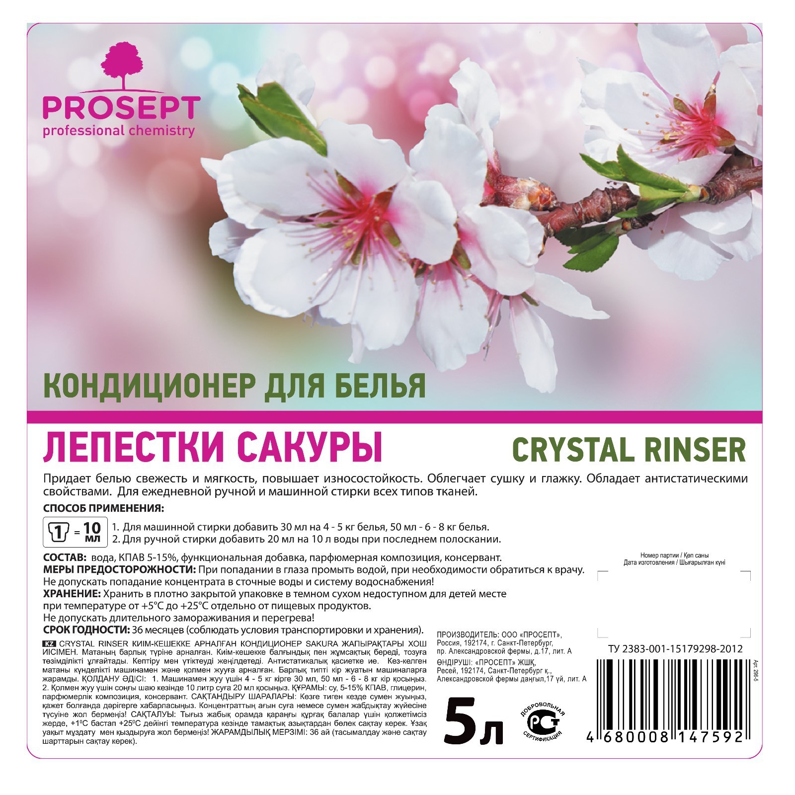 Кондиционер для белья Crystal Rinser "лепестки сакуры", концентрат, 5 л