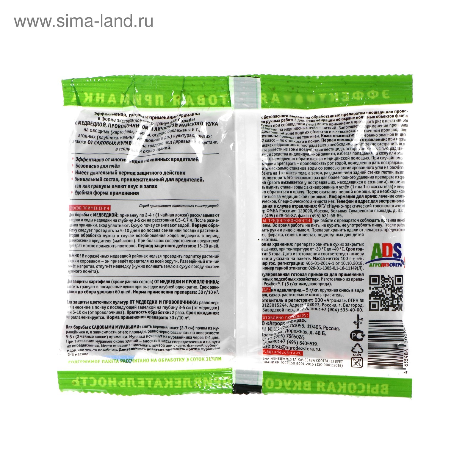 Гранулы от медведки и проволочника "наповал", 100 г. Эффективная, готовая к применению приманка в форме экструдированных гранул для борьбы с медведкой, проволочником и личинкой майского жука:на овощных (картофель, томаты, огурцы, баклажаны и т. д. ) ягодных (клубника, малина, крыжовник и др. ) культурах, цветахА также от садовых муравьёв: на грядкахпод деревьями и кустамив теплицах и около зданийСпособ применения:Для борьбы с медведкой: приманку по 2-4 г (1 чайная ложка) раскладывают в норки и ходы медведки на глубину 3-5 см на расстоянии 0, 5-0, 7 м. После размещения приманки, вход уплотняют. Сухую почву смачивают водой. Первую обработку следует проводить за 5-10 дней до посева семян или посадки растений. Вторая обработка нужна в случае возобновления ходов медведки, в период размножения вредителя (май-июнь). При большом сосредоточении вредителей препарат можно применять повторно. Период защитного действия: 15-20 дней. В поражённых медведкой районах нельзя проводить подпитку растений свежим коровяком-он приведёт вредителя из всей округи. Разведённый птичий помёт, (нужно поливать землю в сухую погоду настоем куриного помёта). СОСТАВ: имидаклоприд - 5г/кг, крупяная смесь в виде гранул, сахар, растительное масло, краситель. Подробнее: https://xn--80ado1abokv5d. xn--90ais/p179535203-napoval-200gr-medvedki. html Вид средства: Гранулы Температурное ограничение: Нет  развернуть описание ▼