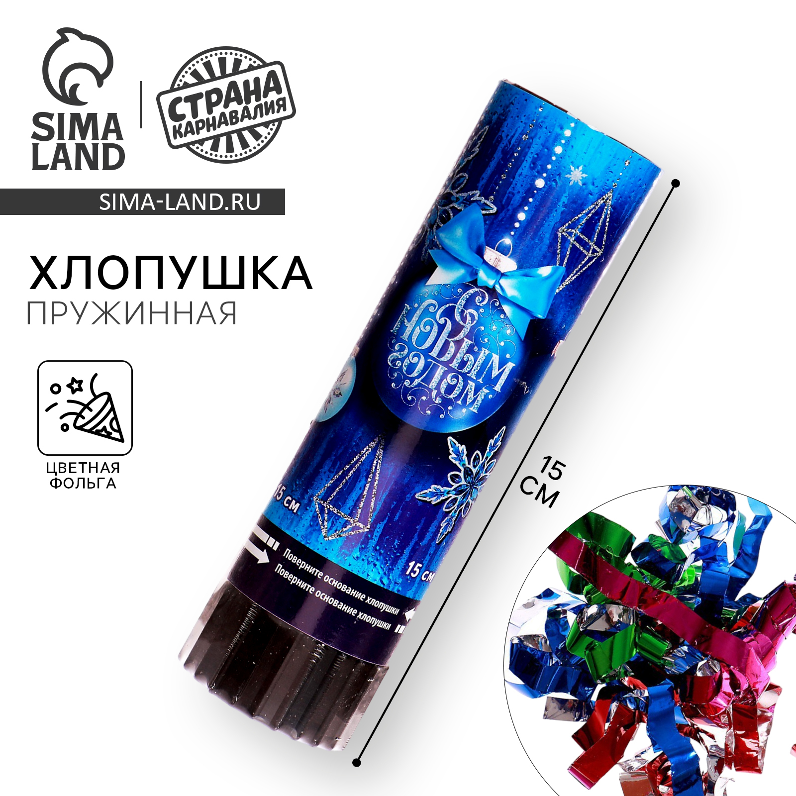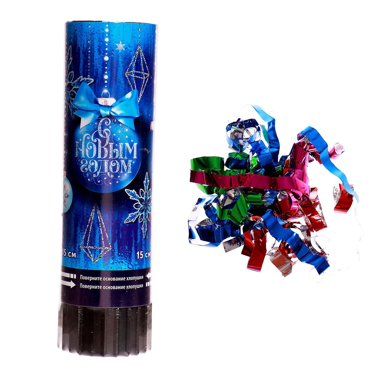 Хлопушка пружинная поворотная «с новым годом», 15 см. Пружинная хлопушка — это простой в использовании аксессуар, который поможет создать праздничное и весёлое настроение! Она добавит яркости любому событию и станет отличным дополнением к любому праздничному декору. Особенности Внутри хлопушки цветная фольга.Не является пиротехническим средством.Пружинная хлопушка — это не только простой способ создать праздничное настроение, но и безопасное развлечение для гостей всех возрастов. Как использовать Для активации хлопушки необходимо повернуть нижнюю часть по часовой стрелке. Важно держать устройство вертикально, направив его верхнюю часть вверх. После активации из хлопушки вылетит конфетти. Длина, см:15|Тематика праздника:Новый год|Тематика хлопушки:Новый год|Вид хлопушки:Пружинная|Наполнение:Фольга|Цвет наполнения:Разноцветный|Страна:Китай  развернуть описание ▼