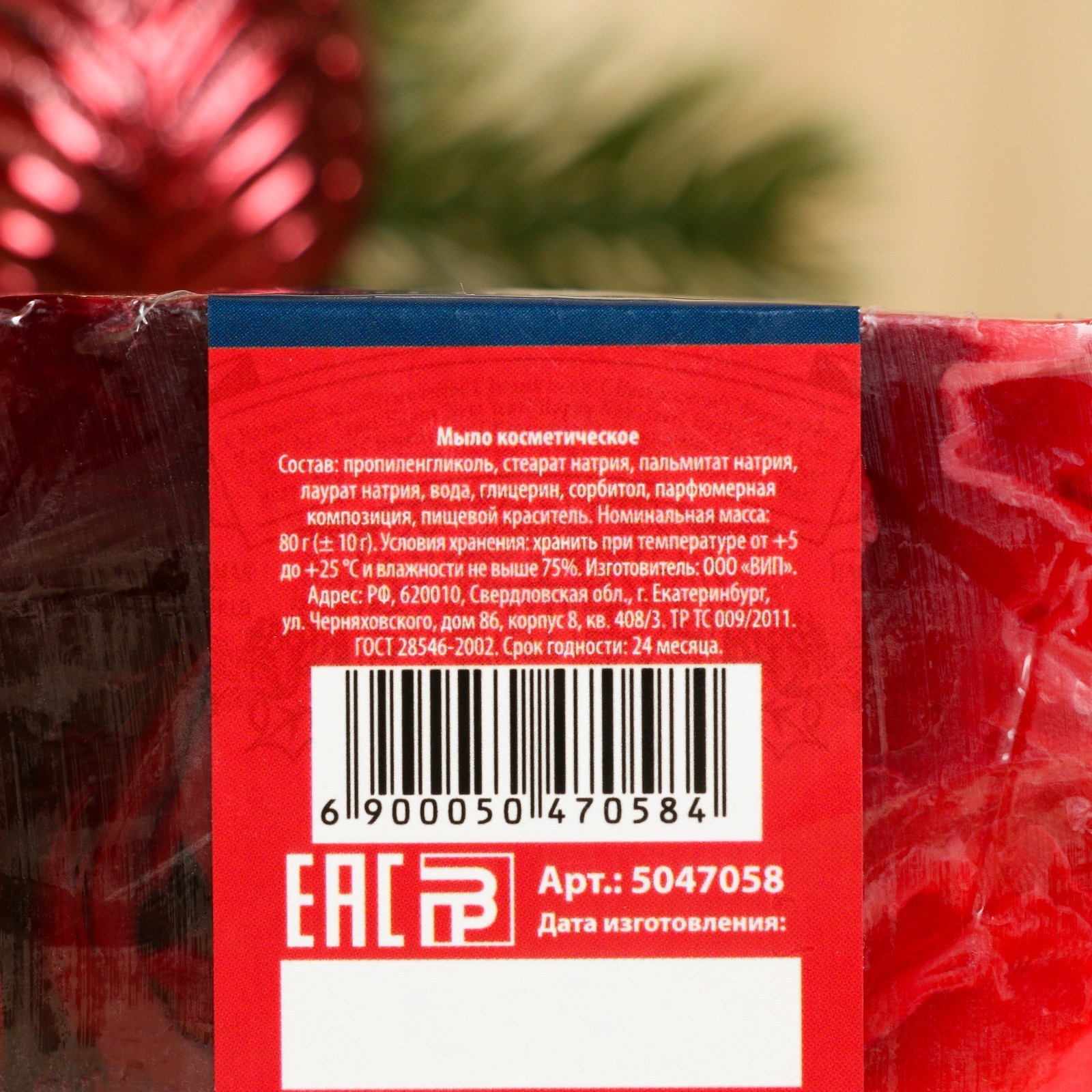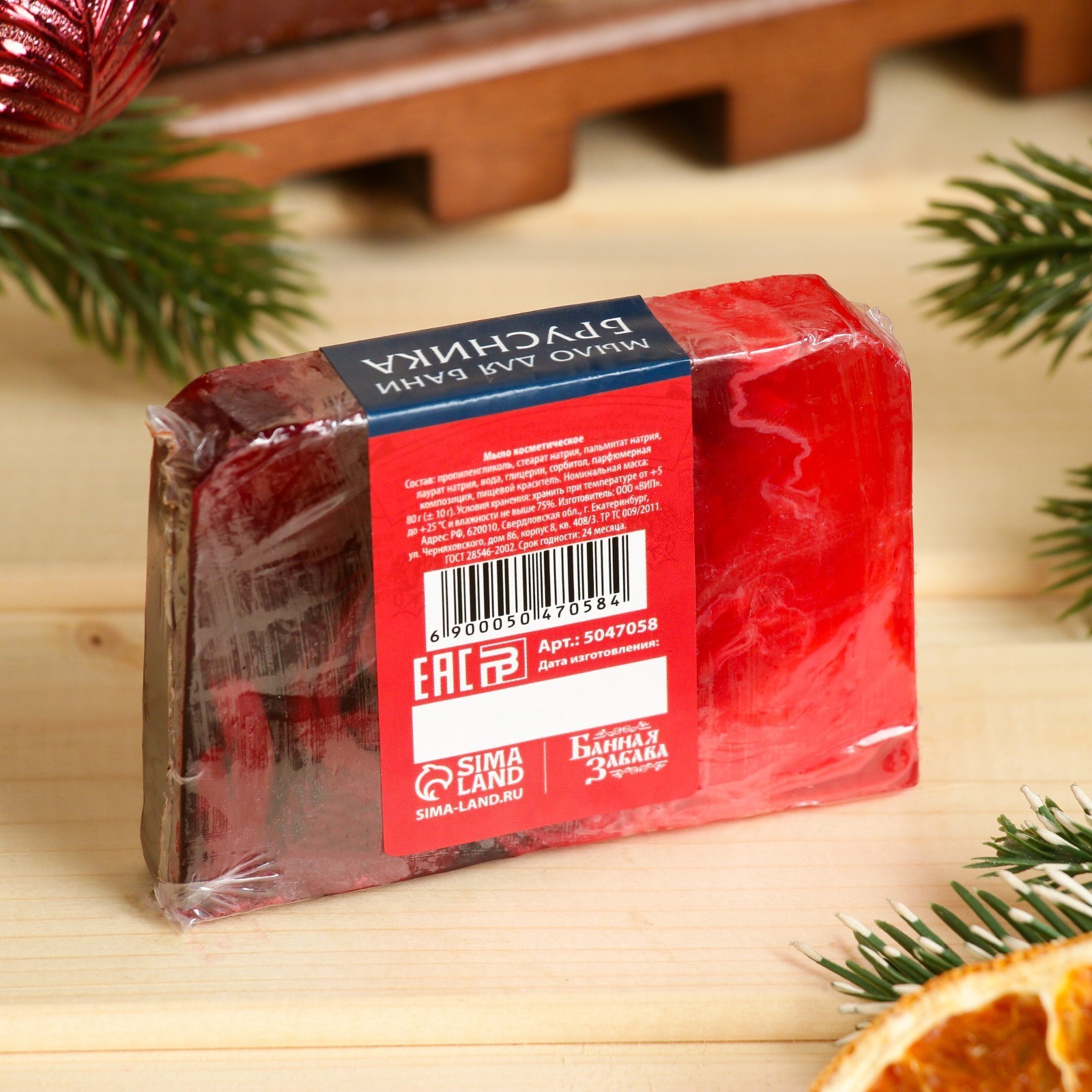 Мыло спа - уход для бани и сауны «с новым годом» брусника, банная забава 80 г. Новогоднее мыло СПА - уход для бани и сауны — идеальный выбор для подарка в Новый год, который дарит не только приятные ощущения, но и заботу о коже. Это мыло идеально подходит для увлажняющего и расслабляющего ухода во время банных процедур. Его мягкая текстура деликатно очищает кожу, а активные компоненты глубоко питают и восстанавливают. Преимущества: Украсит ваш подарок, создавая атмосферу уюта и заботы о себе.Оставляет кожу мягкой, бархатистой и хорошо увлажнённой после использования.Способ применения: используйте мыло для очищения тела в бане или сауне, наносите на влажную кожу, массируйте до образования пены, затем тщательно смойте. Для максимального эффекта используйте с банной мочалкой. Новогодний уход с этим мылом станет прекрасным дополнением к любому подарочному набору для любителей СПА-процедур! Цвет:Фиолетовый|Цвет:Красный|Вес, г/Объём, мл:80|Тематика:Новогодняя|Вид упаковки:Термоусадочная плёнка|Тематика праздника:Новый год|Область применения:Для рук|Область применения:Для тела|Аромат:Брусника|Тип:Твёрдое|Вид мыла:Банное|Вид мыла:Сувенирное|Темпер. ограничение НЕ НИЖЕ :0|Страна:Россия  развернуть описание ▼