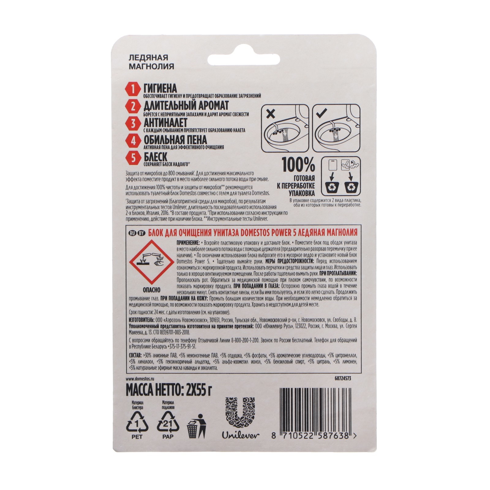 Блок для очищения унитаза domestos power 5 duo «ледяная магнолия», 2 шт. по 55 г. Domestos Power 5 – это эффективное средство, которое содержит в себе не один, а целых пять преимуществ, обеспечивающих защиту от загрязнений, а значит и микробов. Domestos Power 5 каждое смывание – заряд свежего аромата, который остается в течение длительного времени – до 4х часов. Больше никакого налета на внутренней поверхности унитаза – блок Domestos Power 5 успешно справляется с данной задачей. Смывание за смыванием блок оставляет обильную пену и аромат, борется с налетом, поддерживает чистоту, оставляя поверхность унитаза блестящей. Для достижения максимального эффекта поместите продукт в место наиболее сильного потока воды при смыве. Domestos Power 5 работает до 1, 5 раз дольше*. *по результатам тестов Unilever по сравнению со стикером для очищения унитаза Domestos. Аромат: Магнолия Вид средства: Сменный блок  развернуть описание ▼