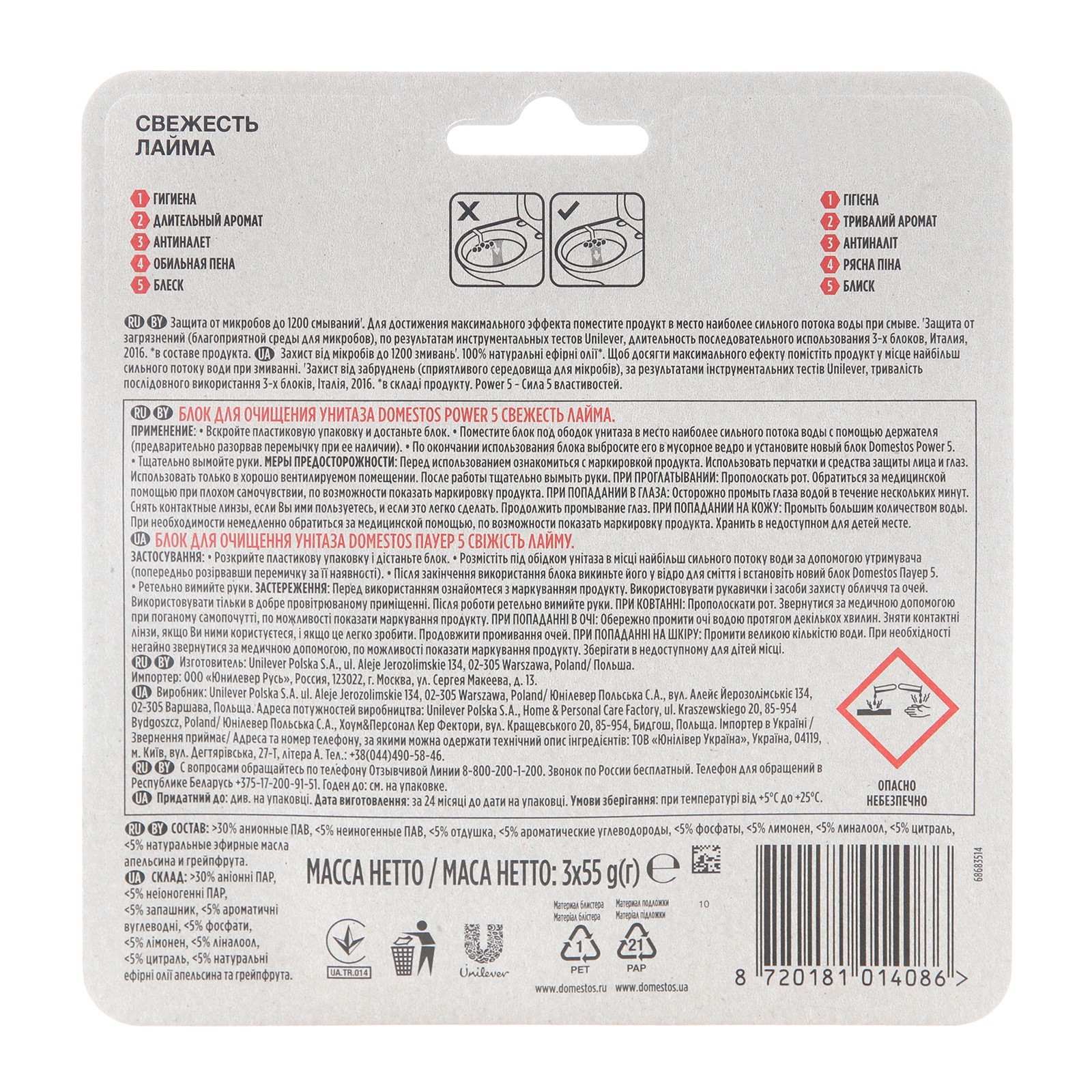 Блок для очищения унитаза domestos power 5 trio «свежесть лайма», 3 шт. по 55 г. Domestos Сила 5 – пять действий, которые объединились в одном эффективном средстве для поддержания чистоты, блеска и приятного аромата в вашем туалете. Domestos Power 5 – это эффективное средство, которое содержит в себе не один, а целых пять преимуществ, обеспечивающих защиту от загрязнений, а значит и микробов. При использовании блоков Domestos Power 5 каждое смывание – заряд свежего аромата магнолии, который остается в течение длительного времени – до 4х часов. Больше никакого налета на внутренней поверхности унитаза – блок Domestos Power 5 успешно справляется с данной задачей. Смывание за смыванием блок оставляет обильную пену и аромат, борется с налетом, поддерживает чистоту, оставляя поверхность унитаза блестящей. С блоками Domestos Power 5 поддержание чистоты и свежести вашего туалета стало проще. Domestos Power 5 – на защите чистоты, гигиены, а значит и здоровья вашей семьи. Для достижения максимального эффекта поместите продукт в место наиболее сильного потока воды при смыве. Domestos Power 5 работает до 1, 5 раз дольше. Проводите регулярную уборку Вашего дома с помощью средств Domestos: обработайте унитаз гелем Domestos, очистите различные поверхности (раковина, ванна, шкафчики, полки и другие) с помощью универсального спрея для максимальной дезинфекции, используйте блок для унитаза для поддержания чистоты в Вашем туалете. parts count: 0 Аромат: Лайм Вид средства: Сменный блок  развернуть описание ▼