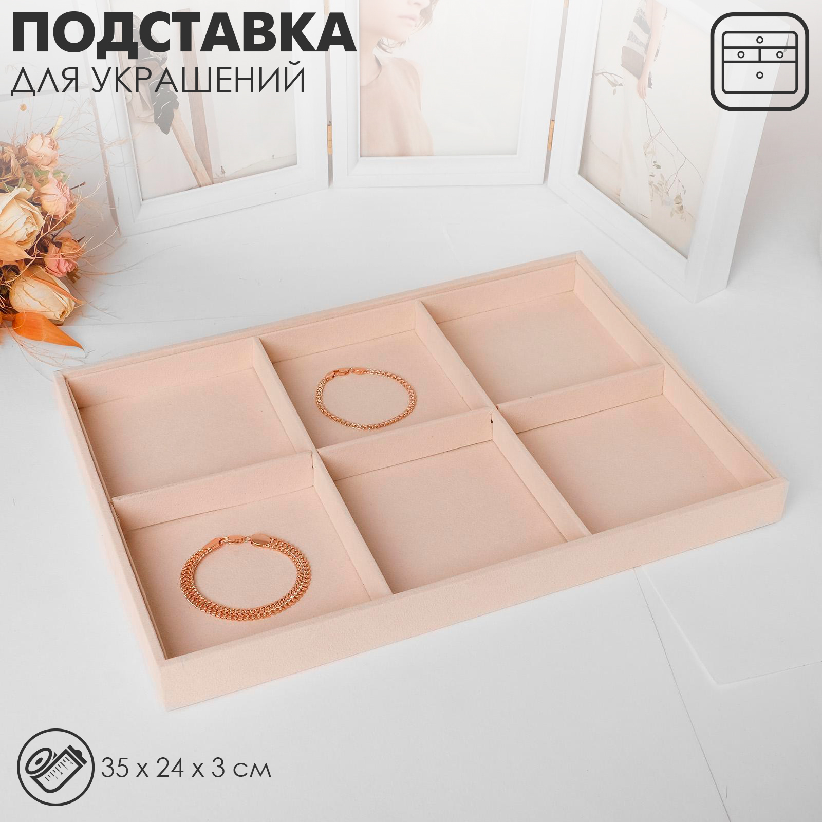 Подставка для украшений 6 ячеек, флок, 35x24x3, цвет бежевый