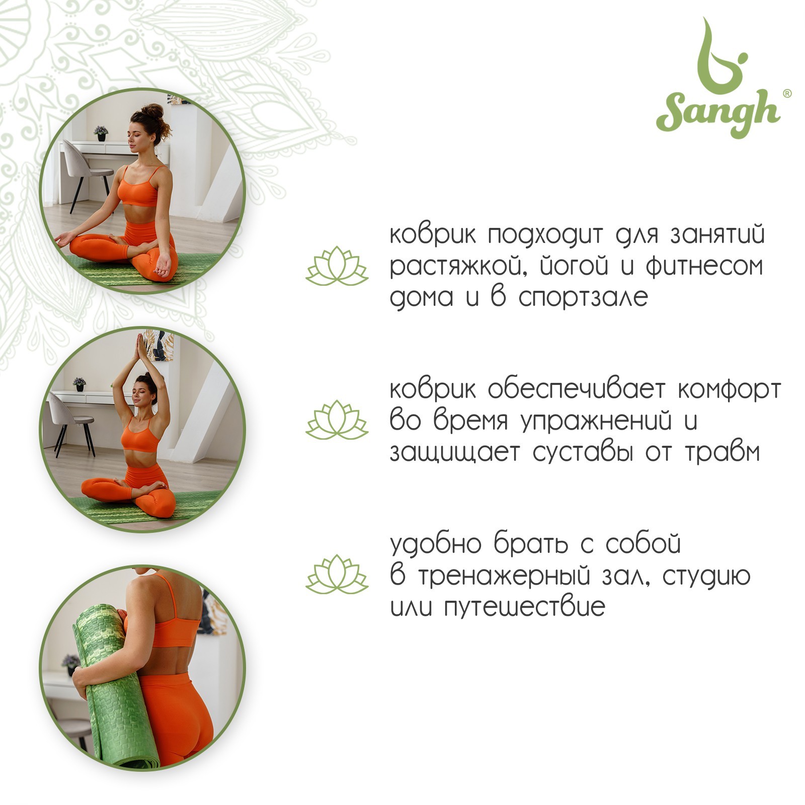 Коврик для йоги sangh, 183х61х0,7 см, цвет зелёный. Коврик подходит для занятий йогой и фитнесом дома и в спортивных залах. Помогает в выполнении асан или других упражнений. Смягчает упор тела на твёрдую поверхность. Сохраняет форму после выполнения упражнений. Цвет: Зелёный Длина, см: 183 Ширина, см: 61 Толщина, мм: 7 Возраст: Взрослый Материал: EVA Особенности: Эластичный Особенности: Водоотталкивающий Вид: Классический  развернуть описание ▼