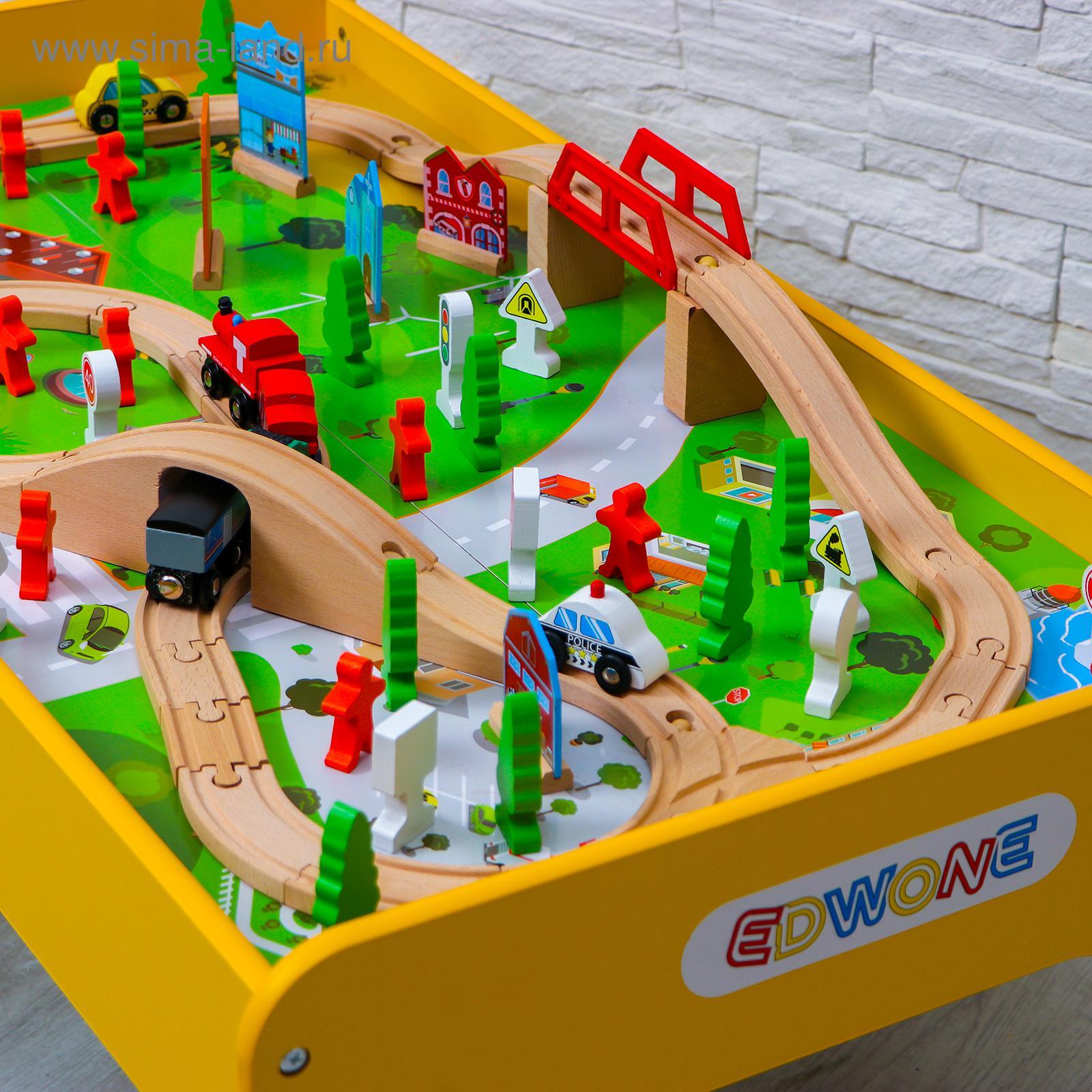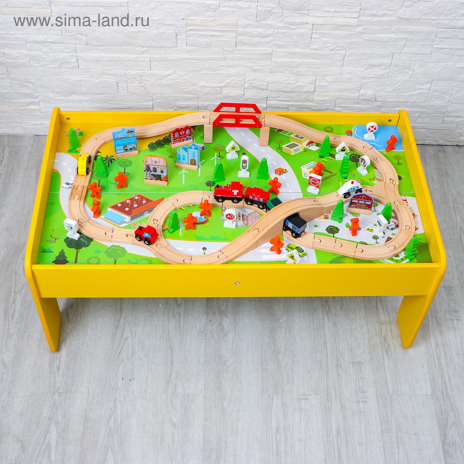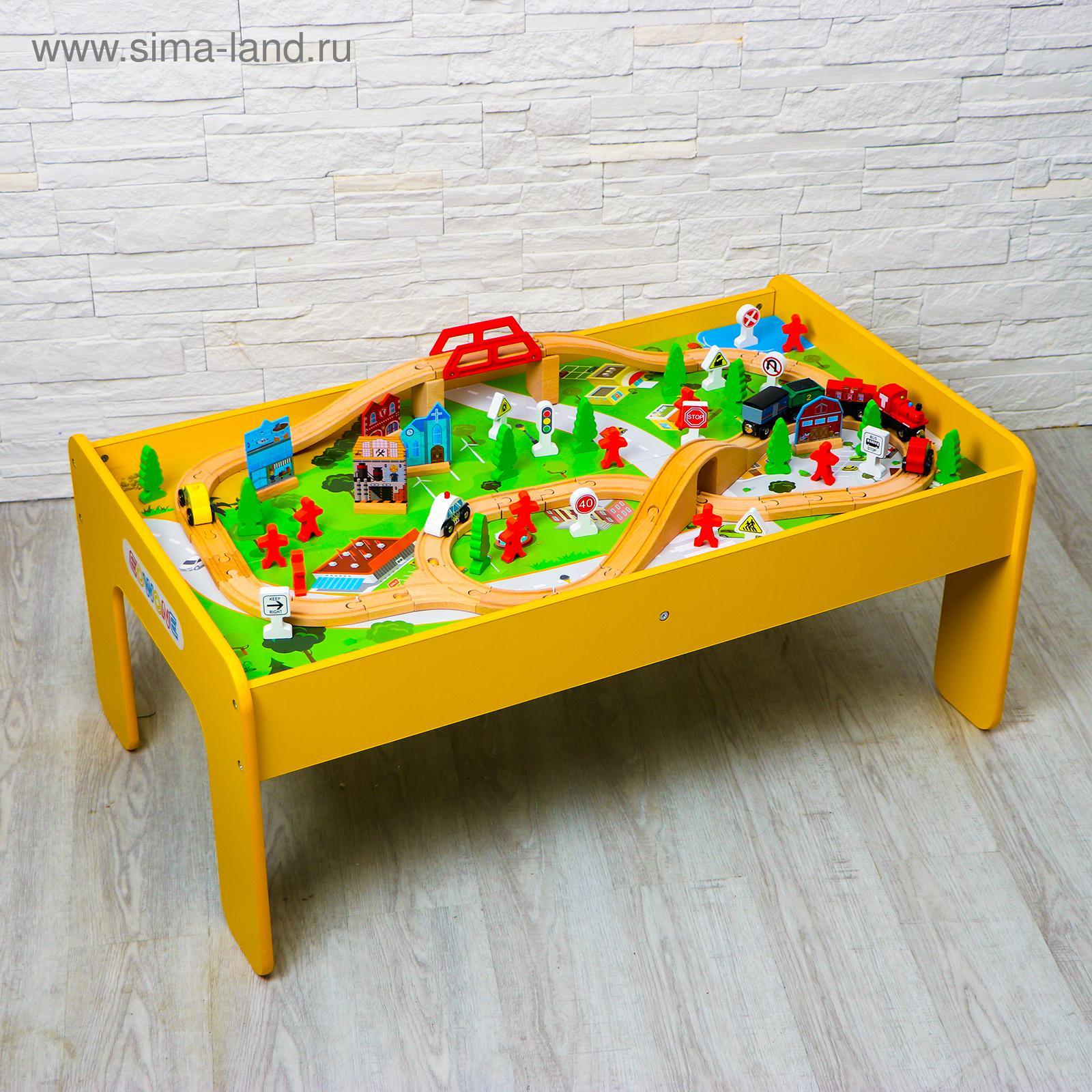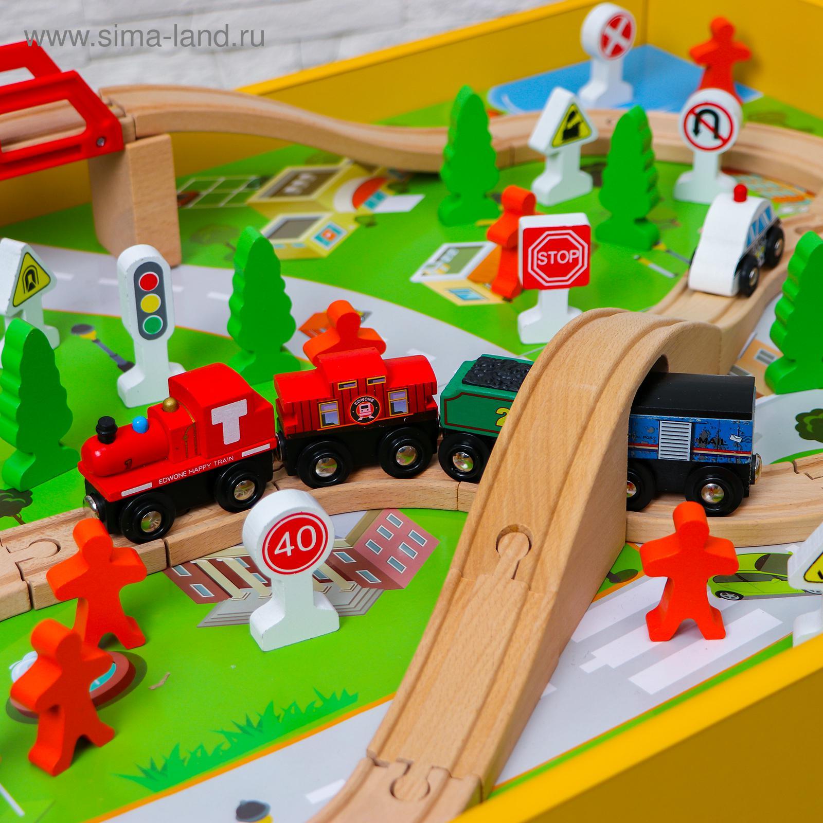 Железная дорога, 90 элементов, стол в комплекте, 100 55 40 см. Железная дорога — это красочный набор для сюжетных игр. Большое количество декораций и фигурок позволяет собрать действующий комплекс с транспортной развязкой. Дорожное полотно можно укладывать на уровень выше основного положения рельсов, чтобы организовать многоуровневые съезды и мосты. Малыш сможет создавать собственные сюжетные линии. Например осуществит перевозку пассажиров в другой конец города. Детали дорожного полотна выполнены из дерева, что гарантирует их долговечность. Набор совместим с комплектами ТМ KidKraft, Brio и «Томас и его друзья». В комплект входят: 90 элементов;3 машинки;10 фигурок людей;четырёхвагонный поезд без двигателя;стол.Рекомендовано для детей с 3 лет. Тип питания:Без источника питания|Вид транспорта:Легковая машинка|Назначение транспорта:Железнодорожный (поезда)|Цвет:Разноцветный|Возраст:От 3 лет|Количество вагонов:4|Количество элементов:90|Вид упаковки:Коробка картонная|Тематика праздника:Универсальная тематика|Материал:Металл|Материал:Пластик|Материал:Дерево|Дополнительные функции:Развивающая|Тип управления:Без механизма|Вид поезда:Классический|Особенности:Депо|Особенности:Мост|Материал путей:Дерево|Среда перемещения транспорта:Наземный транспорт|Страна:Китай  развернуть описание ▼
