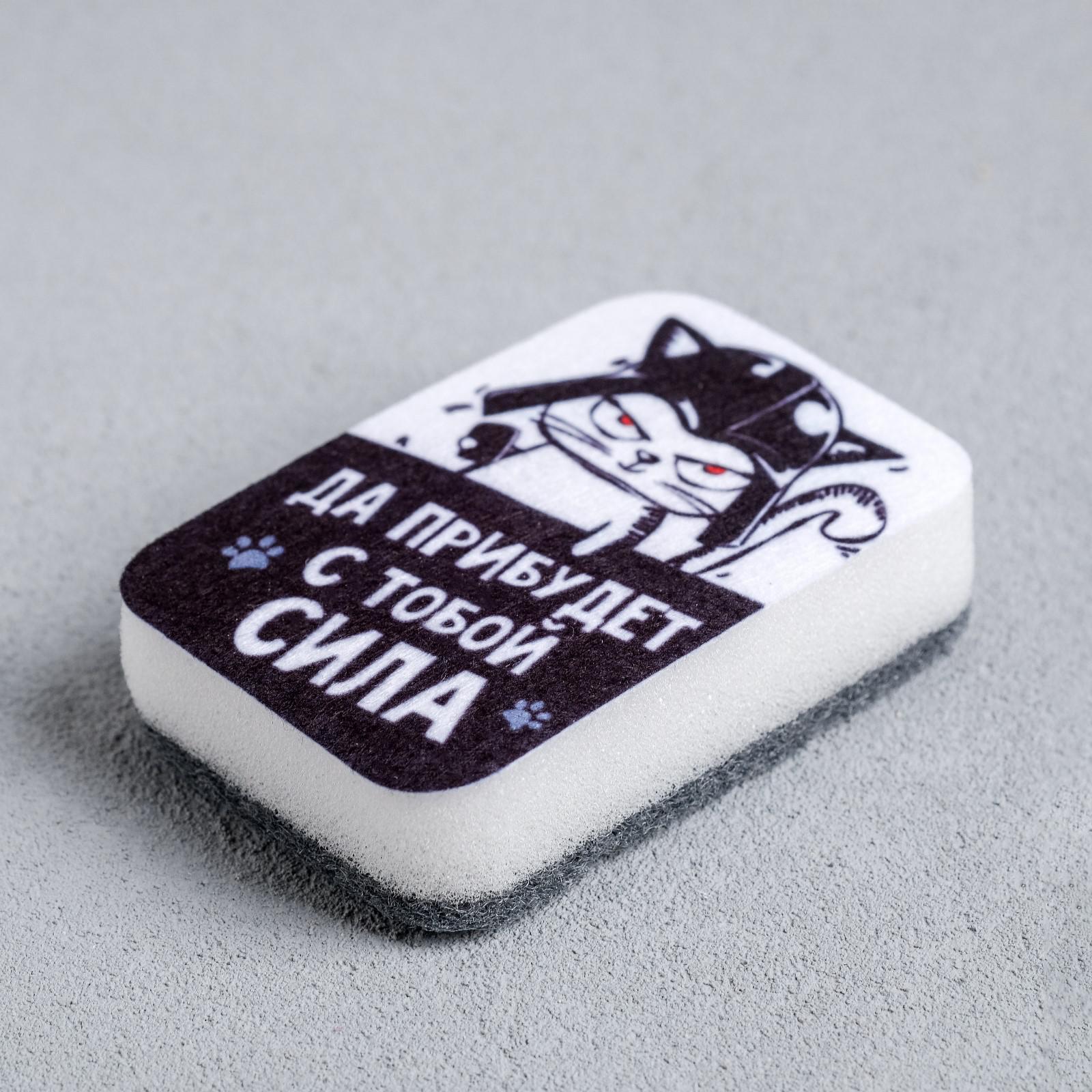 Губка для мытья посуды «да прибудет с тобой сила» 9х6 см. Весёлая губка для мытья посуды - оригинальное решение для эффективного ухода за посудой! Особенности губкиуникальный дизайн, который точно понравится каждой домохозяйке. С одной стороны, размещены смешные картинки и забавные надписи, которые поднимут настроение и сделают процесс мытья посуды еще более радостным. другая сторона образивная и жесткая, способная справиться с самыми стойкими загрязнениями. губка изготовлена из качественного поролона, что обеспечивает нежное и эффективное очищение посуды, и исключает появление царапин на поверхности посуды. размеры губки 9 х 6 см идеально подойдут для комфортного использования. Наша губка для мытья посуды станет прекрасным дополнением к подарку для любой домохозяйки. Она не только поможет в быстром и качественном уходе за посудой, но и добавит юмора и радости в обыденные заботы! Цвет: Чёрный В упаковке, шт.: 1 Вид: Губка/мочалка Материал: Поролон  развернуть описание ▼