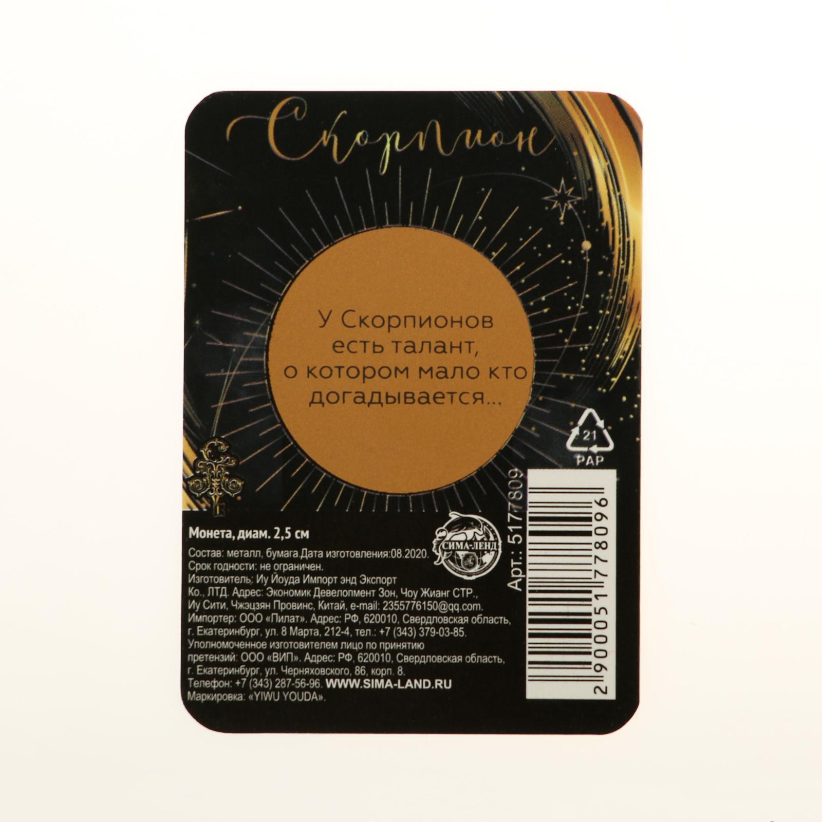 Монета сувенир знак зодиака «скорпион», d=2,5 см.. Сувенирная монета со знаком гороскопа — это изысканный и символичный подарок, отражающий индивидуальность и характер владельца. Выполнена из качественного металла, украшена детализированным изображением знака зодиака. Такая монета станет не только приятным сувениром, напоминанием о важном событии или человеке, но и оригинальным талисманом, приносящим удачу и гармонию согласно астрологическим особенностям. Идеально подходит для коллекционеров и тех, кто ценит индивидуальность и символизм. Набор:Нет|Вид упаковки:Подложка|Тематика праздника:Универсальная тематика|Материал:Металл|Знак зодиака:Скорпион|Тематика:Гороскоп|Вид гороскопа:Зодиакальный|Страна:Китай  развернуть описание ▼