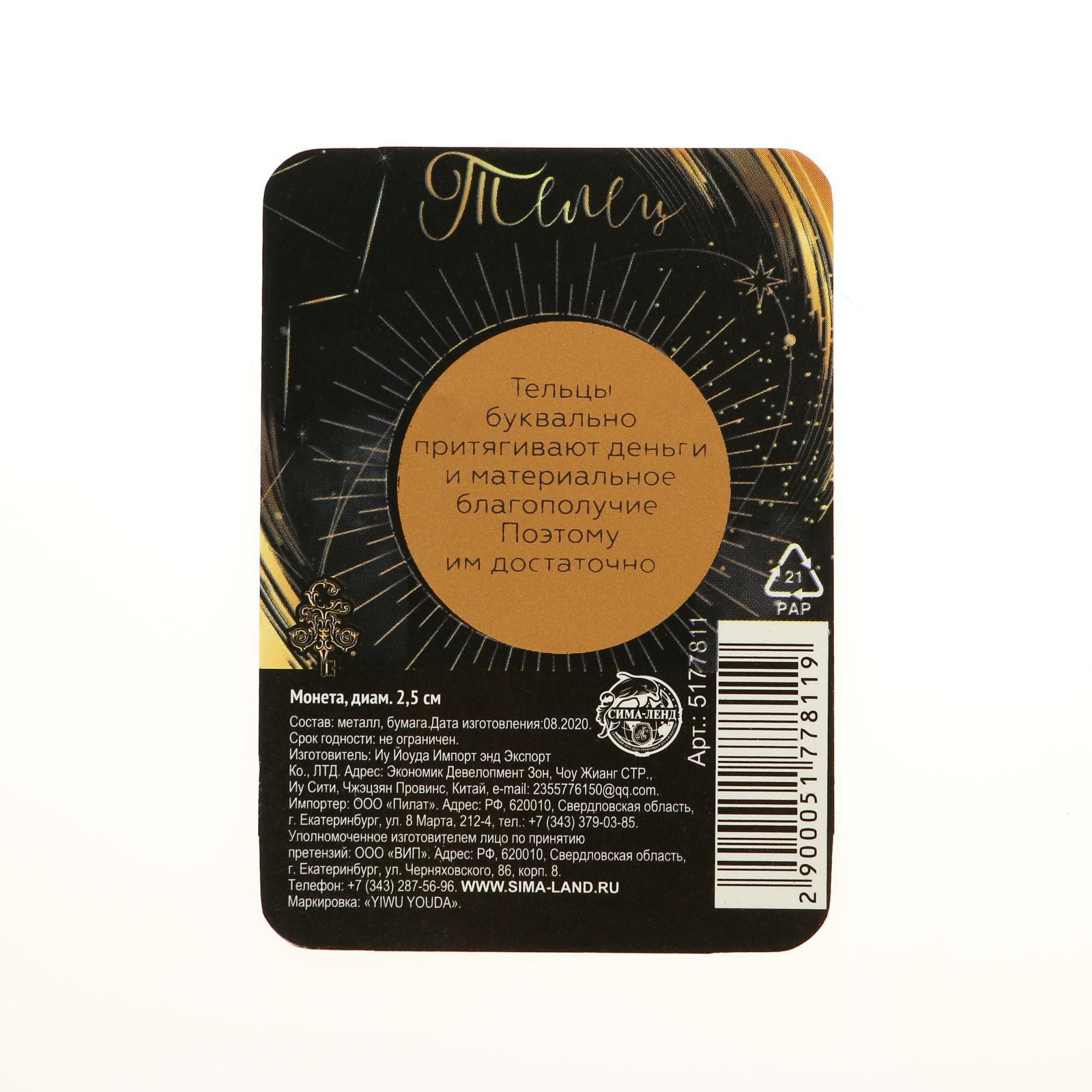 Монета сувенир знак зодиака «телец», d=2,5 см.. Сувенирная монета со знаком гороскопа — это изысканный и символичный подарок, отражающий индивидуальность и характер владельца. Выполнена из качественного металла, украшена детализированным изображением знака зодиака. Такая монета станет не только приятным сувениром, напоминанием о важном событии или человеке, но и оригинальным талисманом, приносящим удачу и гармонию согласно астрологическим особенностям. Идеально подходит для коллекционеров и тех, кто ценит индивидуальность и символизм. Набор:Нет|Вид упаковки:Подложка|Тематика праздника:Универсальная тематика|Материал:Металл|Знак зодиака:Телец|Тематика:Гороскоп|Вид гороскопа:Зодиакальный|Страна:Китай  развернуть описание ▼
