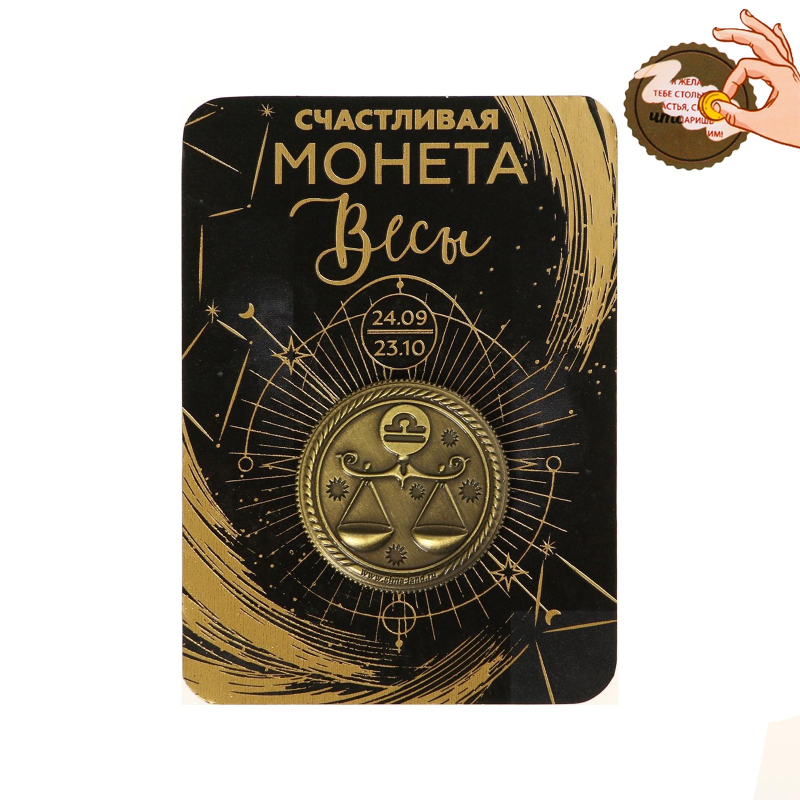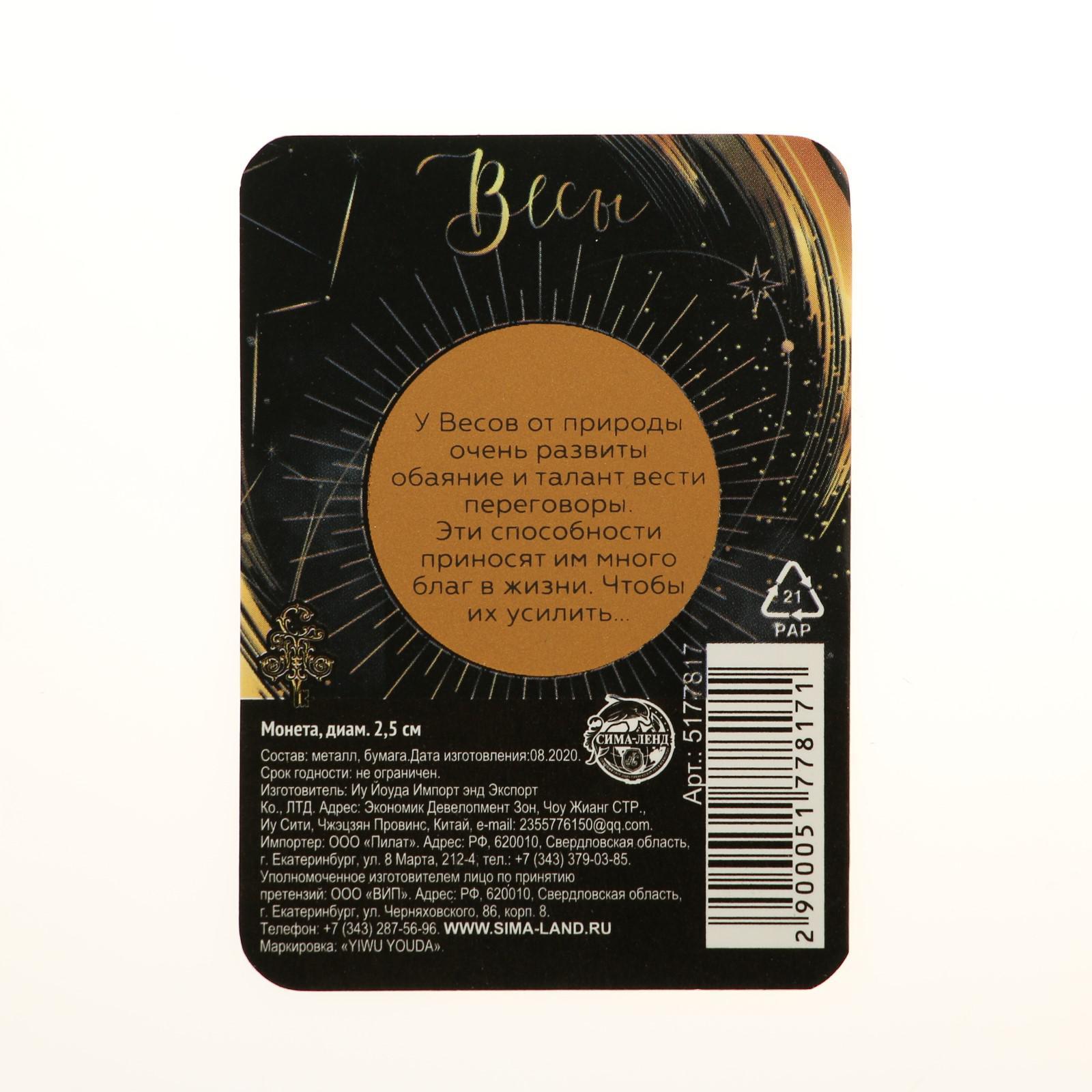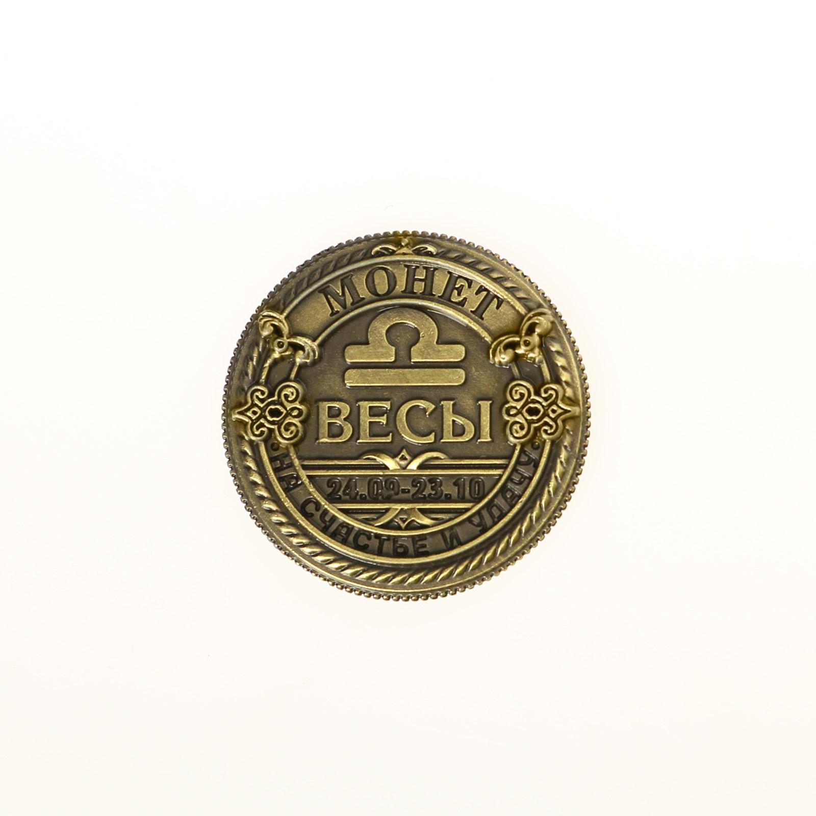 Монета сувенир знак зодиака «весы», d=2,5 см.. Сувенирная монета со знаком гороскопа — это изысканный и символичный подарок, отражающий индивидуальность и характер владельца. Выполнена из качественного металла, украшена детализированным изображением знака зодиака. Такая монета станет не только приятным сувениром, напоминанием о важном событии или человеке, но и оригинальным талисманом, приносящим удачу и гармонию согласно астрологическим особенностям. Идеально подходит для коллекционеров и тех, кто ценит индивидуальность и символизм. Набор:Нет|Цвет:Золотистый|Для кого:Унисекс|Вид упаковки:Подложка|Тематика праздника:Универсальная тематика|Материал:Металл|Знак зодиака:Весы|Тематика:Гороскоп|Составляющие набора:Монета|Вид гороскопа:Зодиакальный|Страна:Китай  развернуть описание ▼