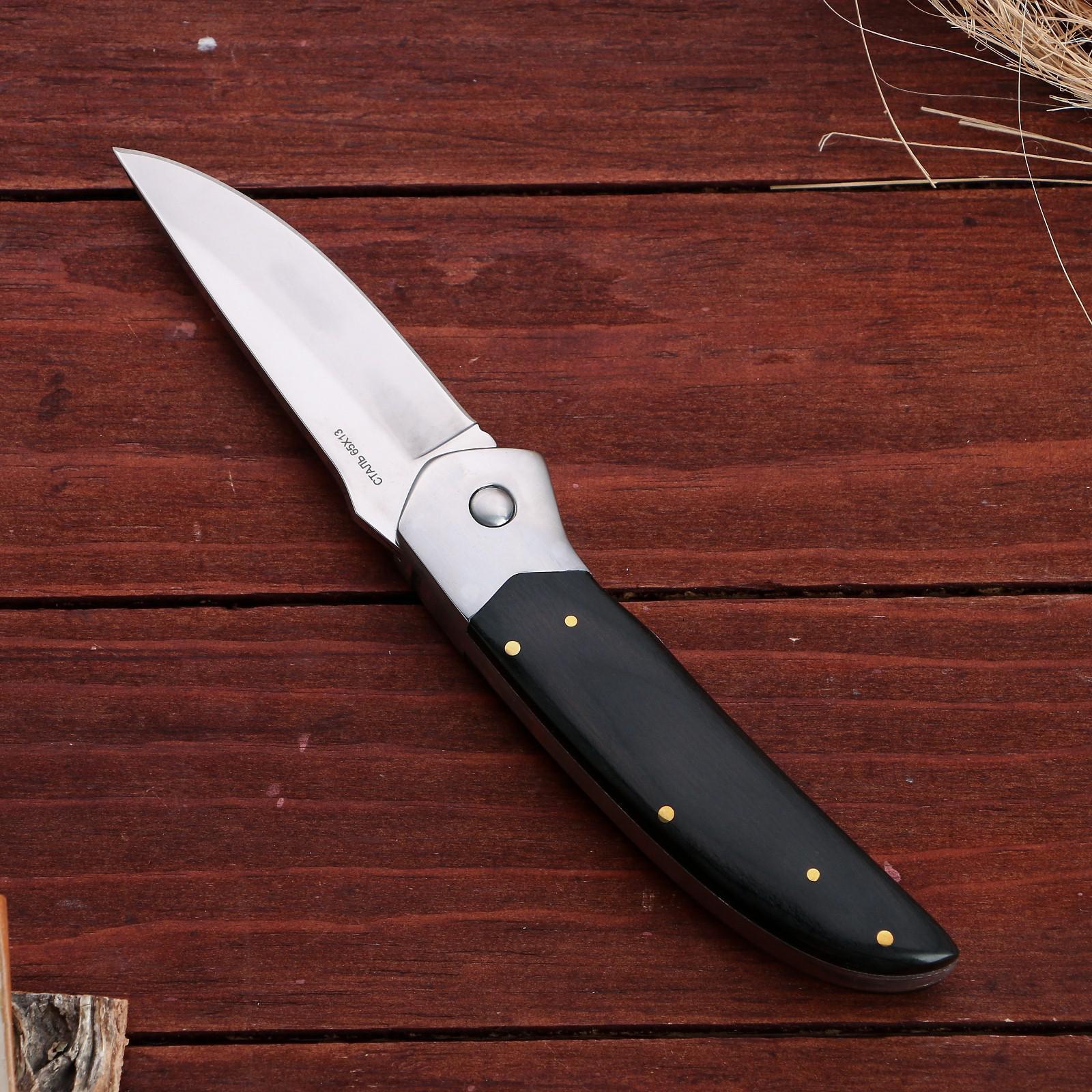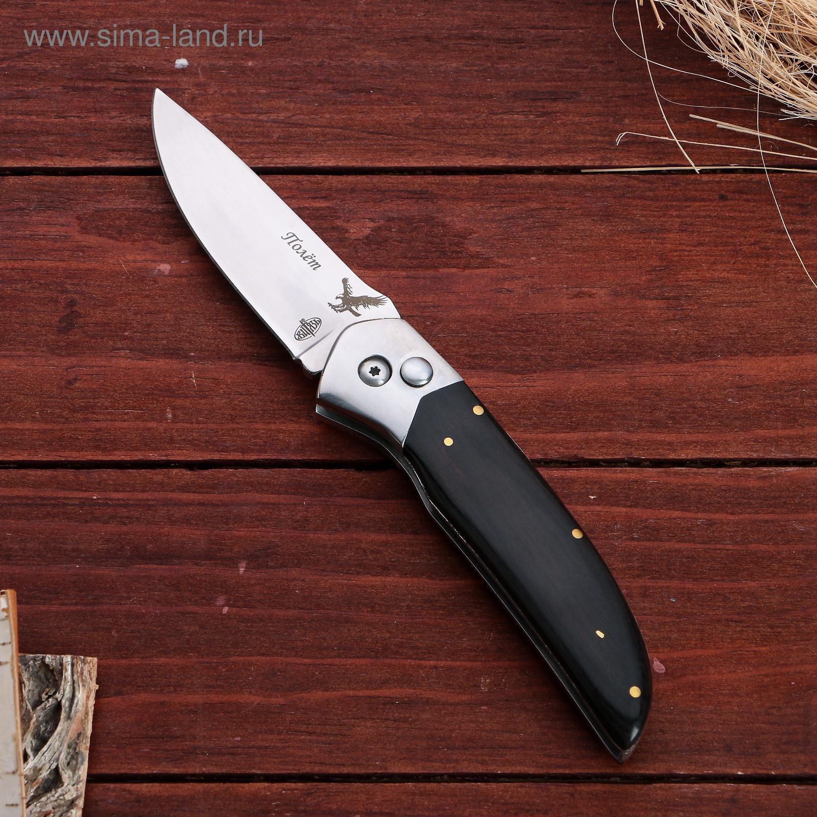 Нож складной "полет". Длина лезвия, см: 8.8 Твёрдость лезвия, HRC: 56 Материал ручки: Дерево Материал ручки: Металл Фиксатор: Да Сталь: 65Х13 Температурное ограничение: Нет Тип ножа: Складной неавтоматический  развернуть описание ▼
