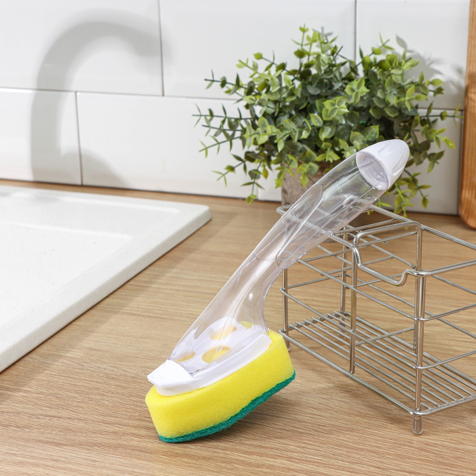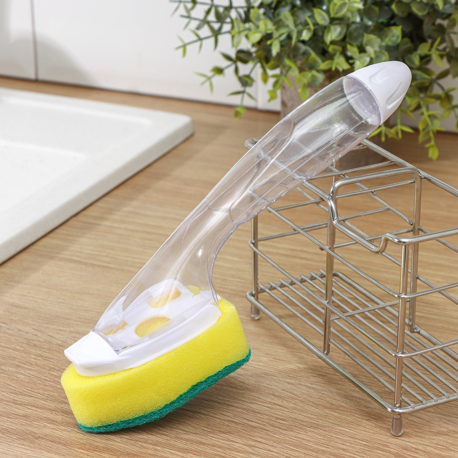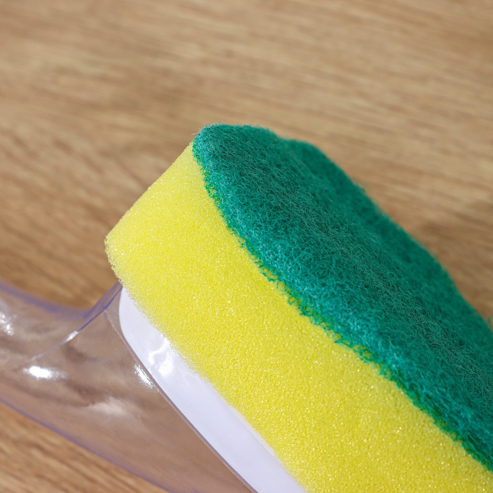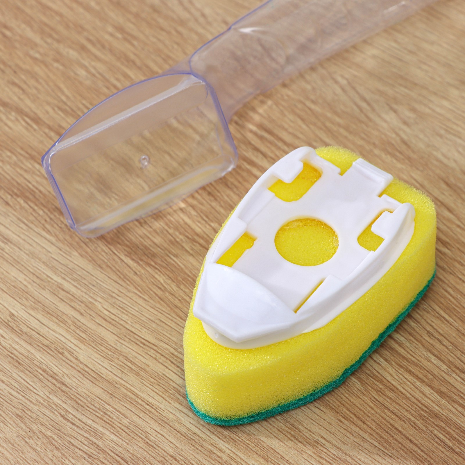 Губка для посуды с дозатором доляна, 6x8x23 см, поролоновая с абразивным покрытием. Щетка с дозатором для посуды как нельзя лучше подходит для очистки кастрюль, сковород, противней, гриля и многих других предметов. Преимущества: Отличается высокой эффективностью, износоустойчивостью и долговечностью. Благодаря удобной ручке, очистит загрязнения даже в труднодоступных местах. Моющая часть не деформируется даже при длительной эксплуатации. Позволяет легко удалить подгоревшие продукты и жир. Легко отмывает жирные пятна и засохшие кусочки пищи. Оберегает руки от контакта с чистящими веществами. Подходит для всех видов посуды. Дозатор изготовлен из прозрачного пластика и позволяет легко контролировать наличие дозируемой моющей жидкости. Диспенсер уменьшает расход воды и жидкости для мытья посуды. Цвет: Белый parts count: 0 В упаковке, шт.: 1 tnved: 9603909100 Вид: Щётка для посуды Материал: Пластик Материал колодки: Пластик Материал щетины щётки: Поролон  развернуть описание ▼