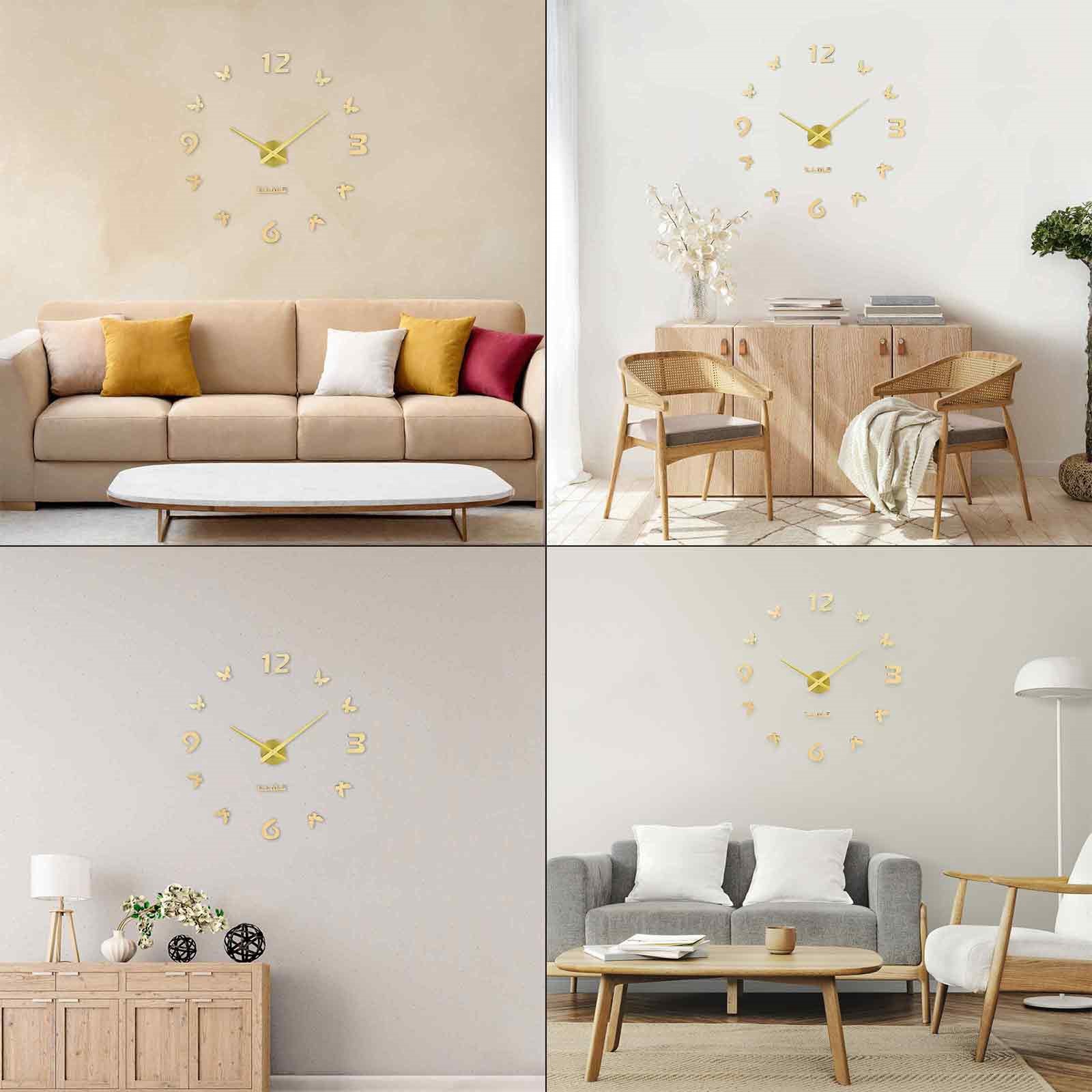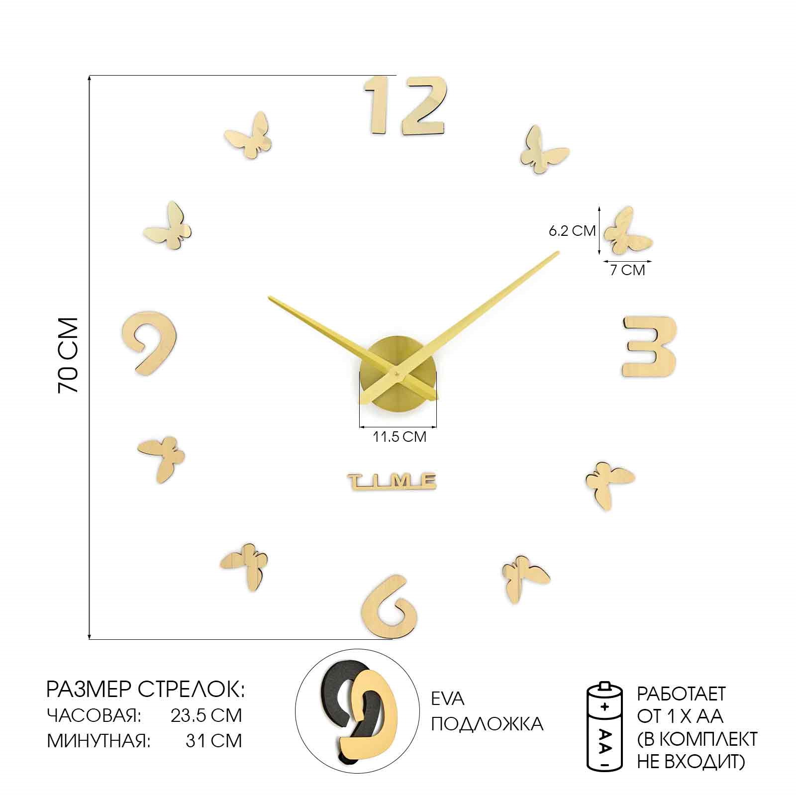 Часы настенные интерьерные большие, 3d «бабочки», плавный ход, наклейка, d-70 см. Настенные часы с бабочками дополнят декор и интерьер вашего дома и станут отличным подарком близким людям. Стильные и красивые часы на стену с бесшумным кварцевым механизмом будут украшением любой комнаты: гостиной, спальни, зала или офиса. Они работают на батарейках, имеют регулируемые размеры циферблата и 3д эффект благодаря вспененной основе. Клеящий слой позволяет разместить часы на различные поверхности: любые виды обоев, окрашенные, деревянные, пластиковые, керамические или металлические. Декоративные часы дополнят интерьер квартиры или дачи. Оригинальные часы станут отличным подарком женщине, девочке, подростку, мужчине, папе, коллеге на Новый год, Рождество, 8 марта, юбилей, День Рождения или свадьбу. Цвет:Золотистый|Тип индикации:Арабские цифры|Тип механизма:Кварцевый|Материал:EVA|3D:Да|Бесшумные:Да|Страна:Китай  развернуть описание ▼