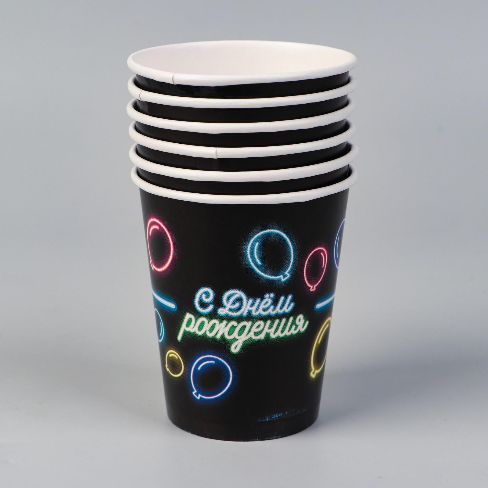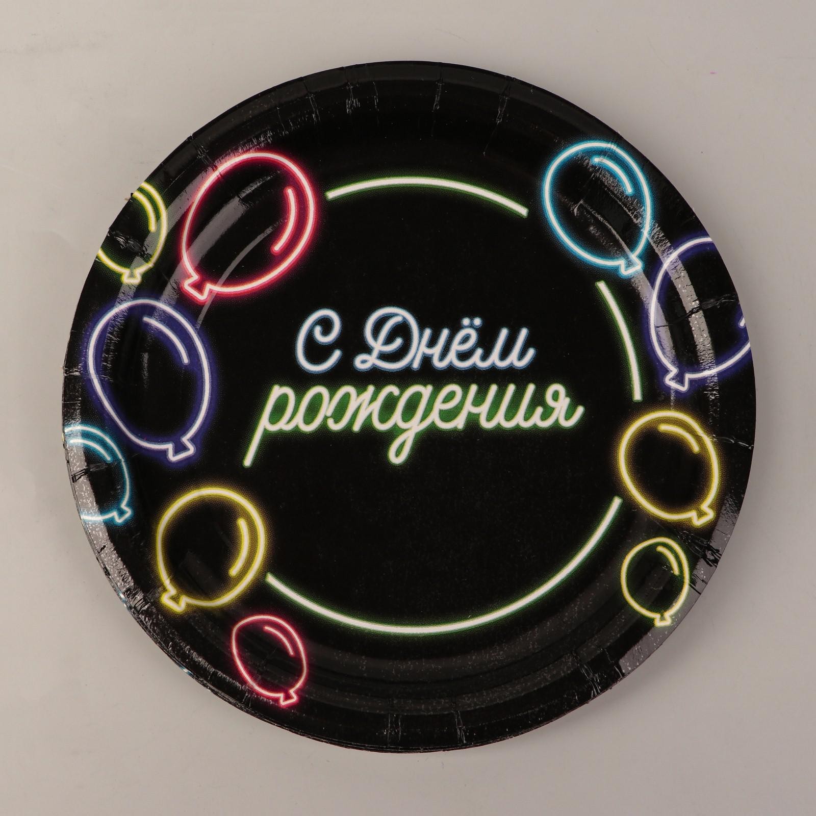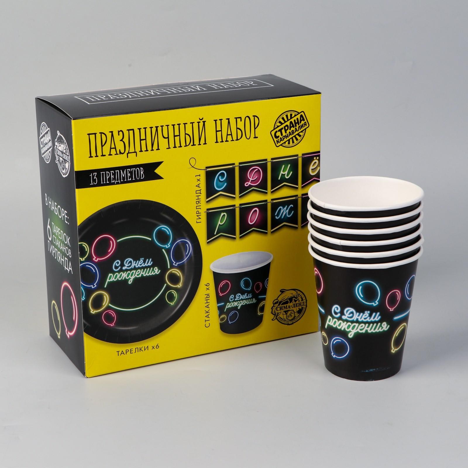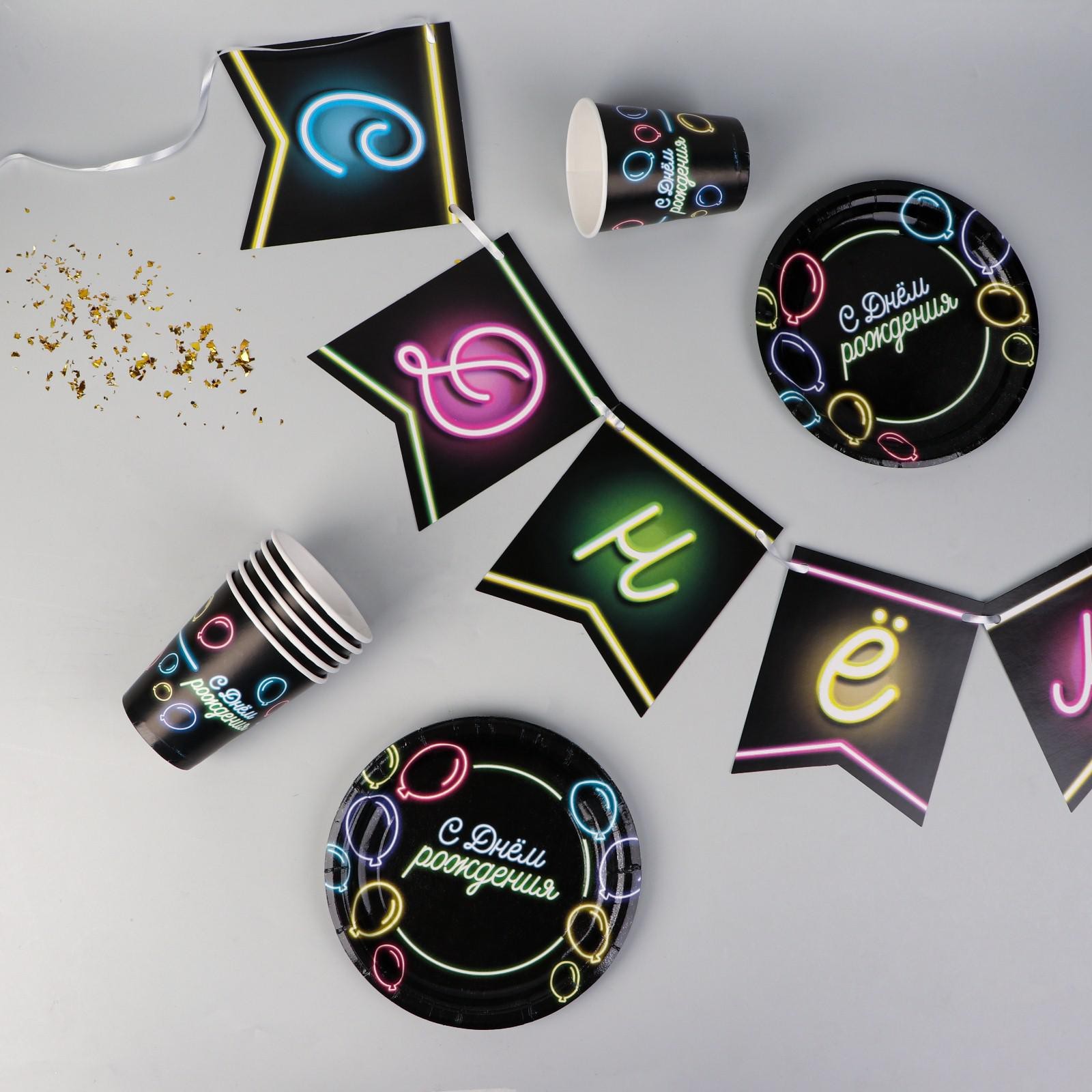 Набор бумажной посуды одноразовый с днём рождения», неон, 6 тарелок, 6 стаканов, 1 гирлянда