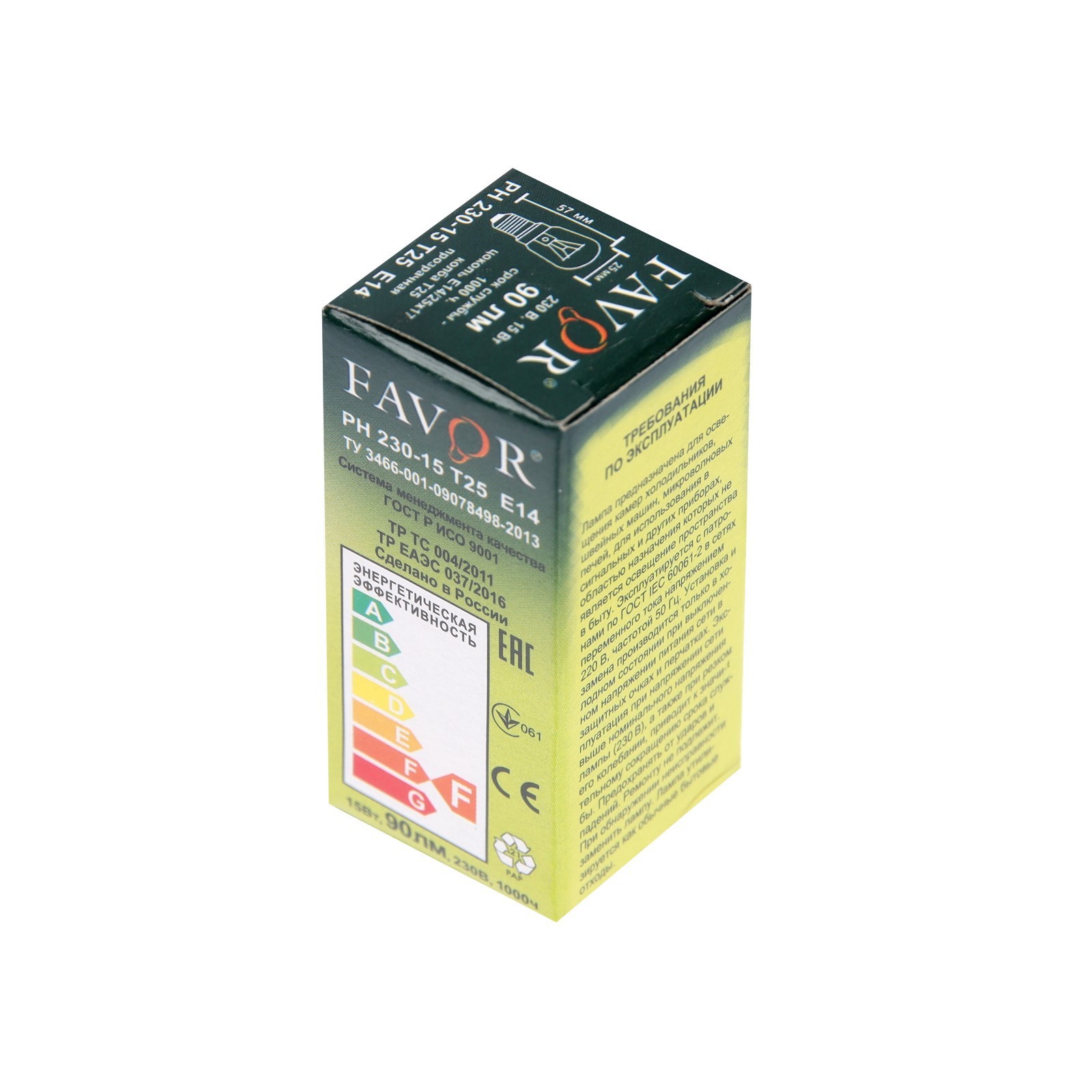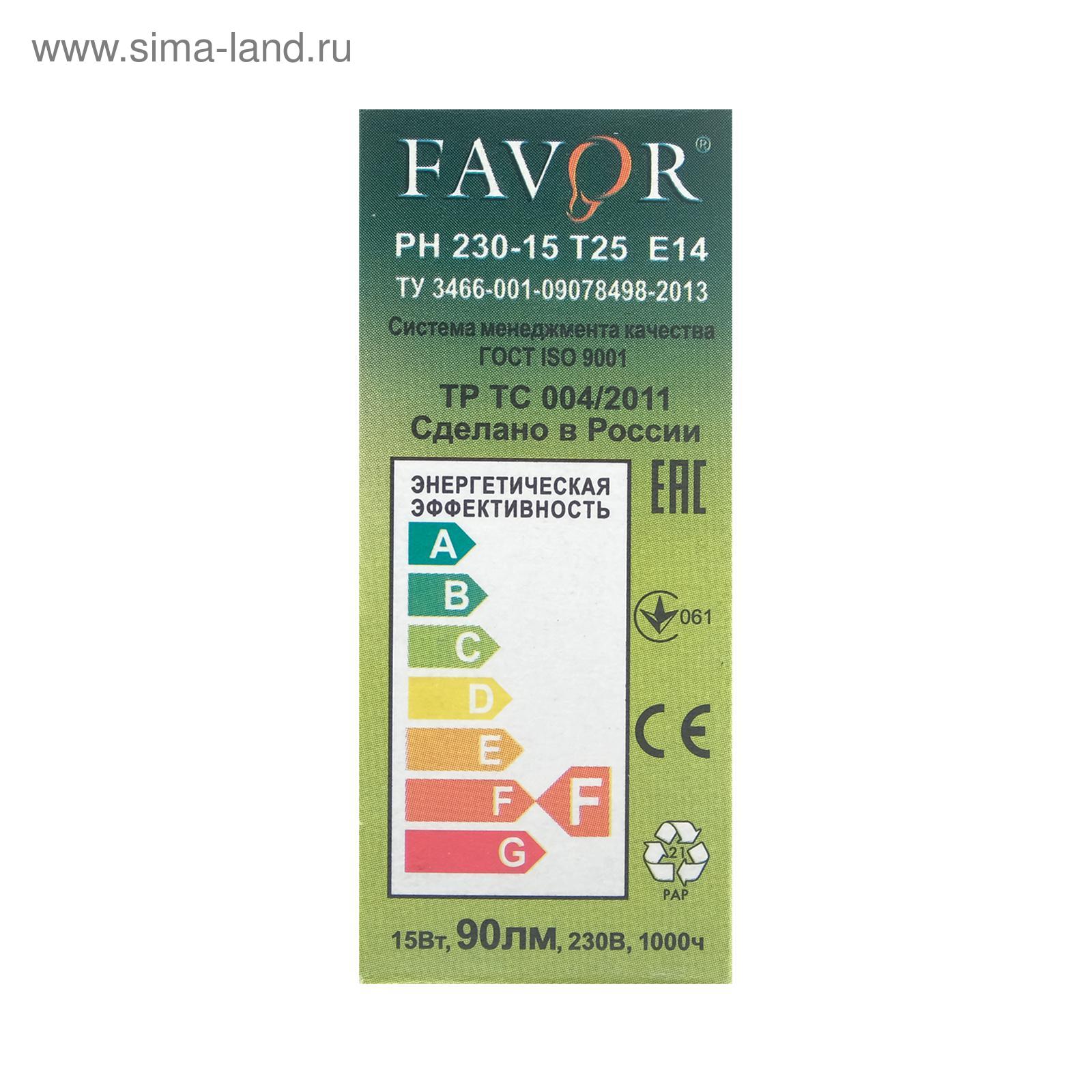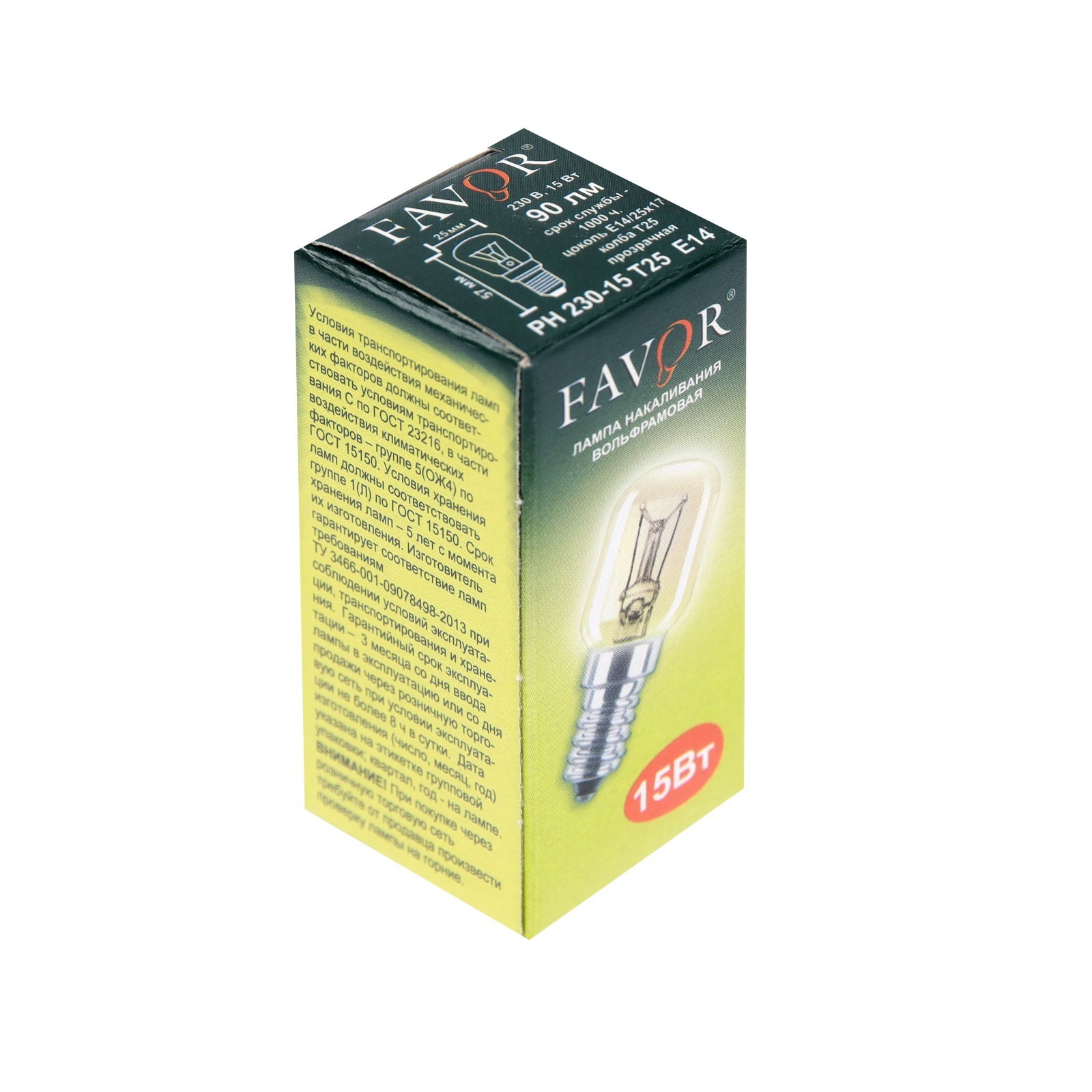 Лампа накаливания favor, е14, 15 вт, 230 в, для холодильников и швейных машин. Лампа предназначена для освещения камер холодильников, швейных машин, микроволновых печей, для использования в сигнальных и других приборах, областью назначения которых не является освещение пространства в быту. Цвет свечения: Тёплый белый Вид лампы: Накаливания Цоколь: E14 Мощность, Вт: 15 Напряжение, В: 220 Цветовая температура: 2700К Форма лампы: Эллипсоид Температурное ограничение: Нет  развернуть описание ▼