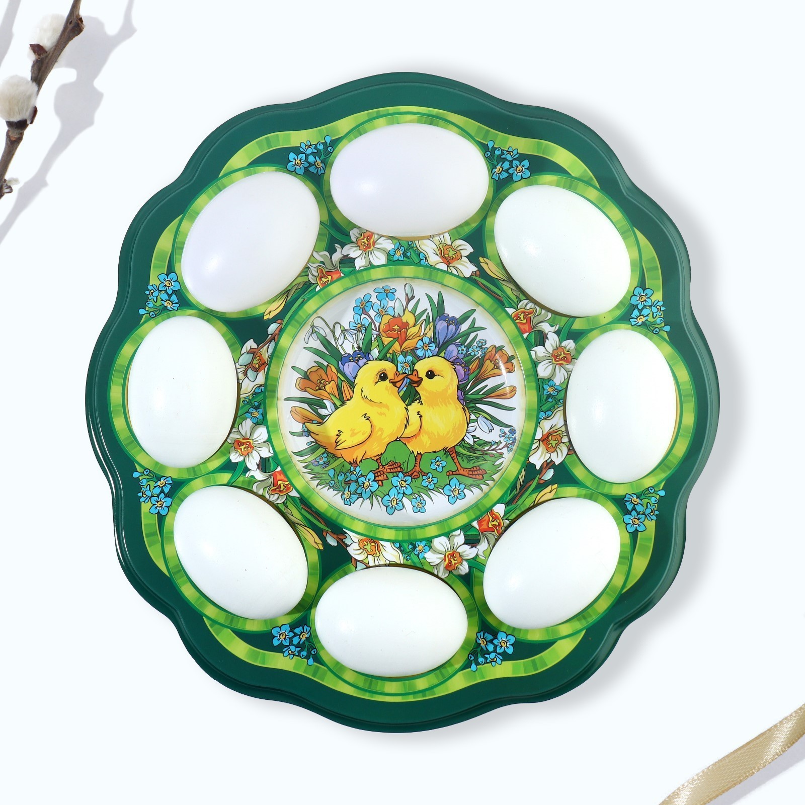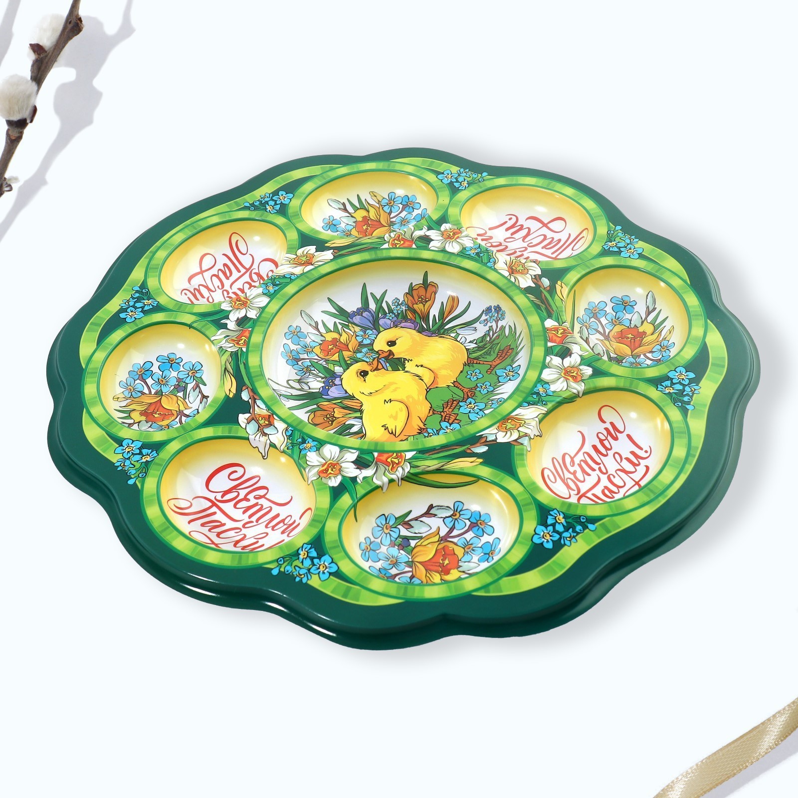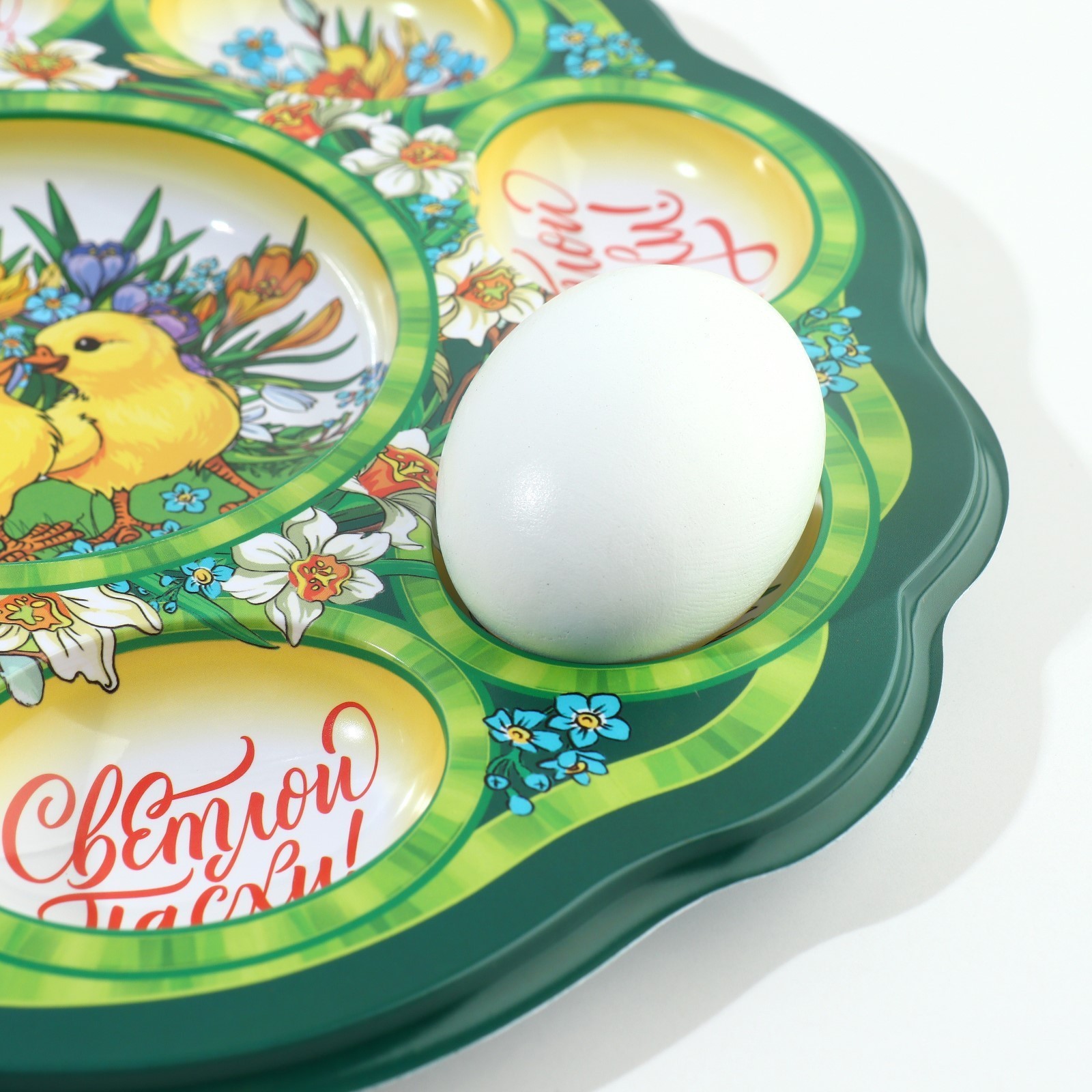Подставка для яиц и кулича «цыплята в цветах», на 8 яиц, d=25 см. Пасхальная подставка предназначена для праздничного украшения Вашего стола в Светлый День Пасхи. В центре декоративной подставки находится углубление для пасхального кулича диаметром 9, 5 см, а по окружности - 8 отверстий для пасхальных яиц. Диаметр декоративной подставки - 25 см. Цвет: Зелёный Диаметр, см: 25 parts count: 0 Количество ячеек: 8 Тематика: Узоры Адресат: Бабушке Адресат: Жене Адресат: Маме Материал: Пластик Можно мыть в посудомоечной машине: Нет Текстура: Гладкая Особенности: Без особенностей Тематика подарка: Посуда  развернуть описание ▼
